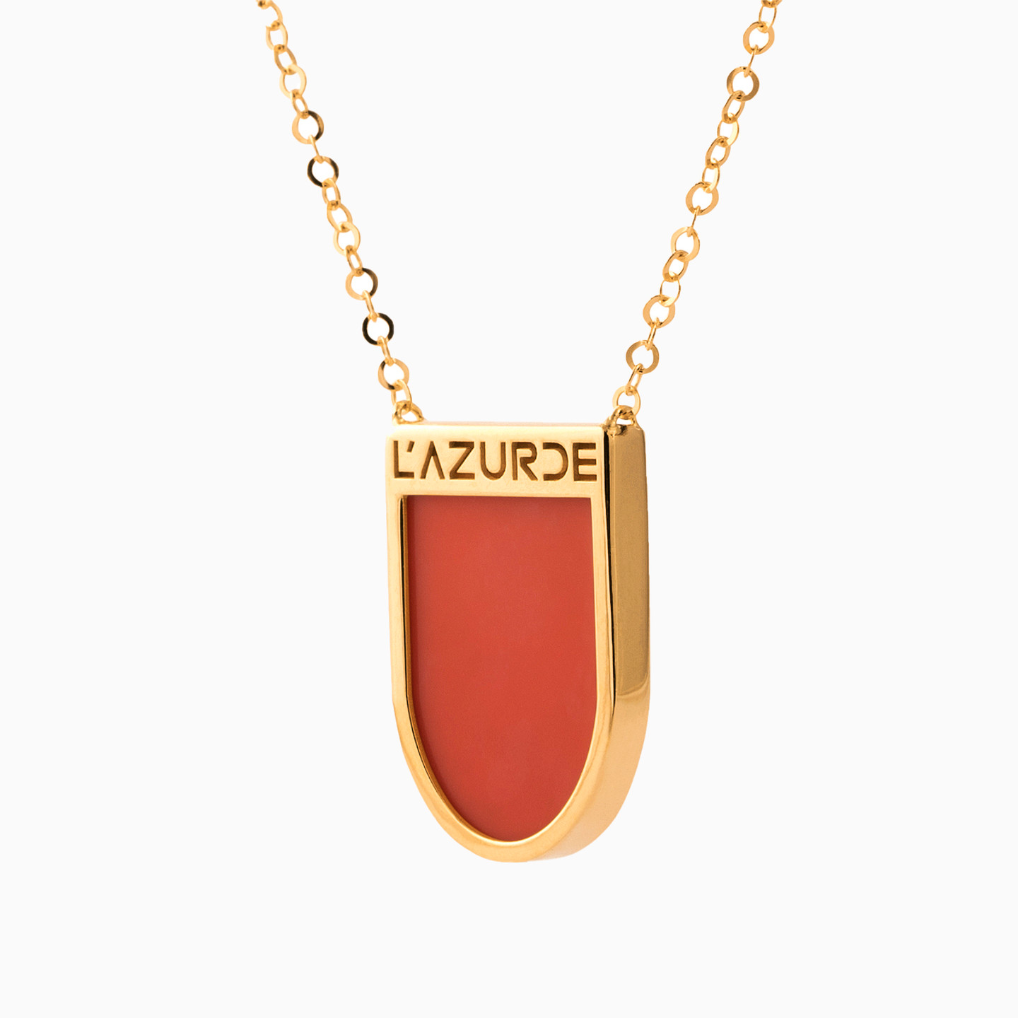 Nothing spells out confidence like this statement necklace from L'azurde Gold. It features a stunning red accent to the pendant that's inscribed with the brand name and suspended from an 18-karat yellow gold chain. Make this a part of your everyday wardrobe and wear it solo or layered with different chains.