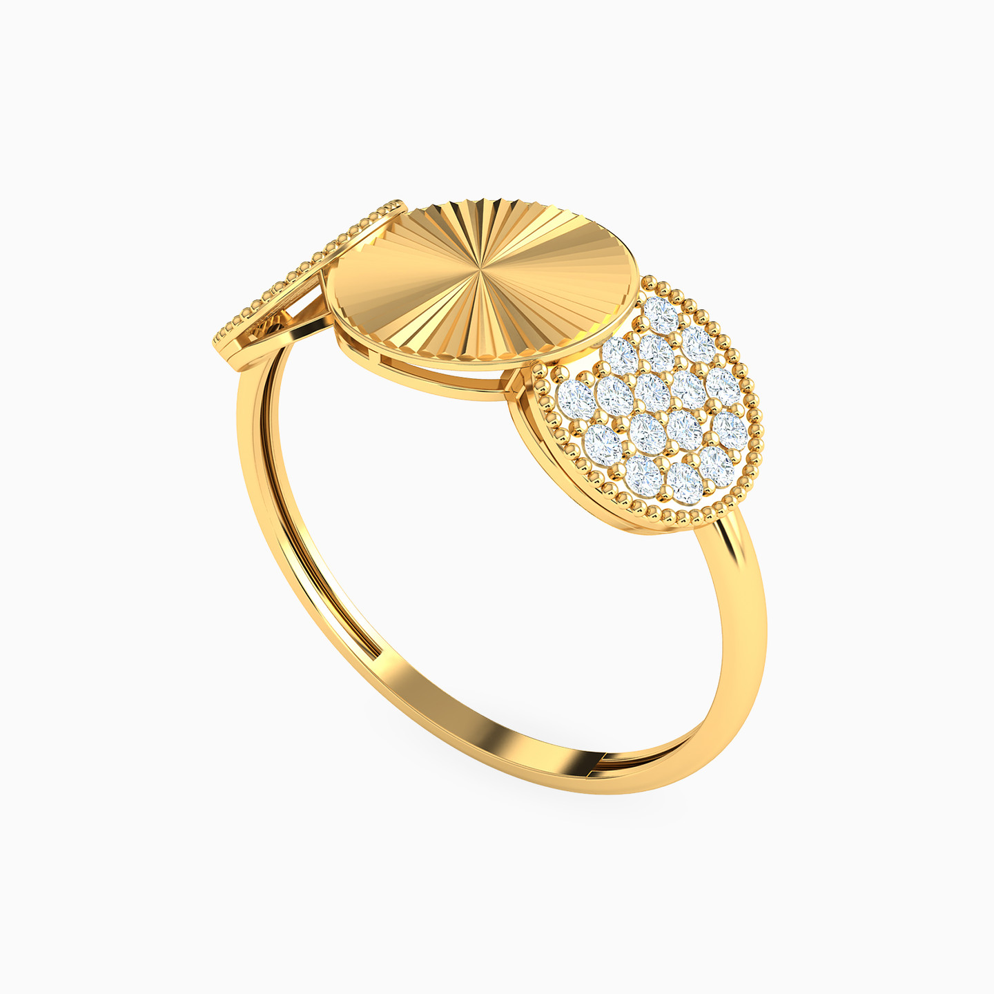 A dazzling trio by L’azurde Gold to up your style game! This stunning statement ring features three circular discs - one studded with prong-set cubic zirconia, another radiating with beautiful ribbed lines and the last one with precisely detailed lines of gold beads. All of this shines bright in an 21-karat yellow gold body. Wear this gorgeous ring when you need to make your presence felt.