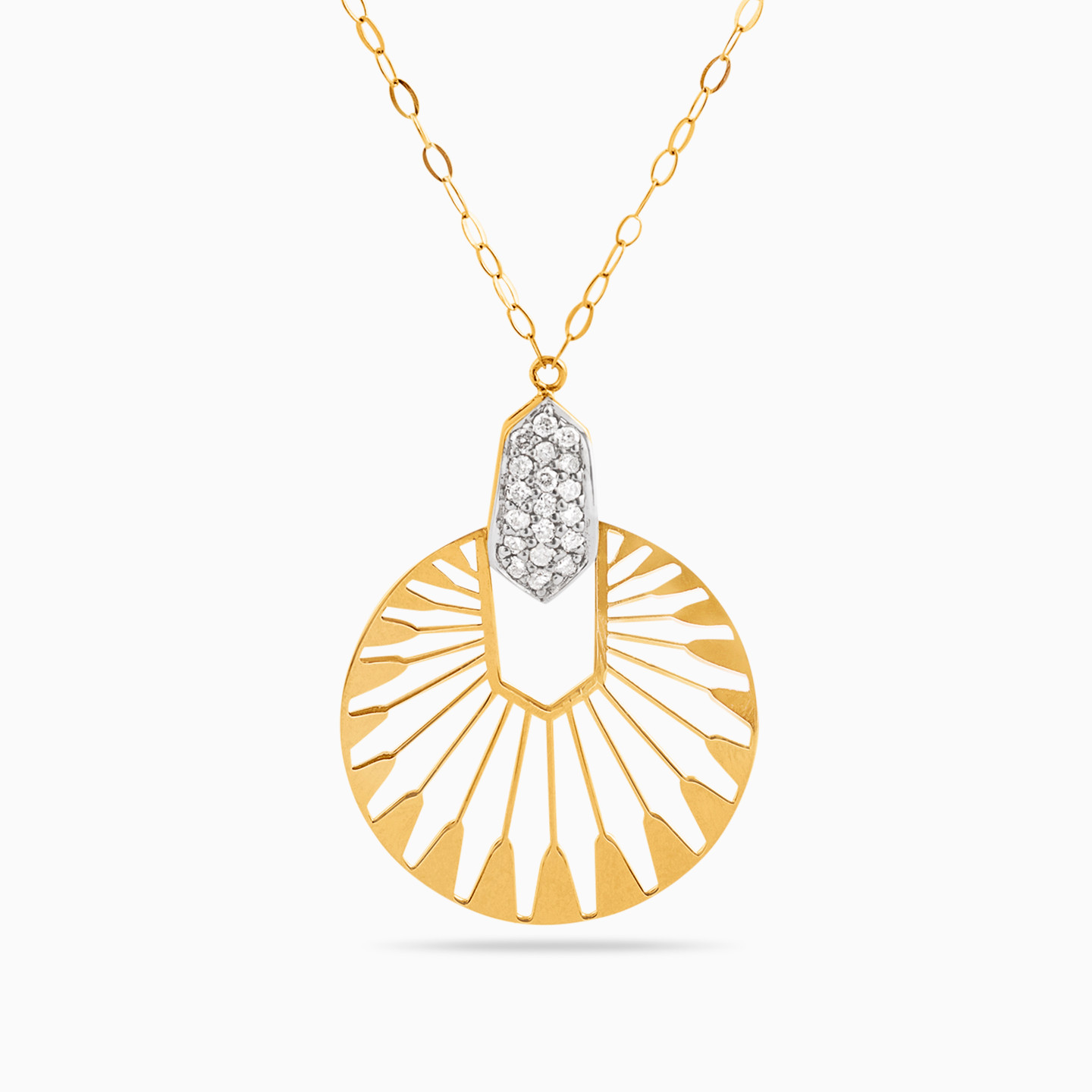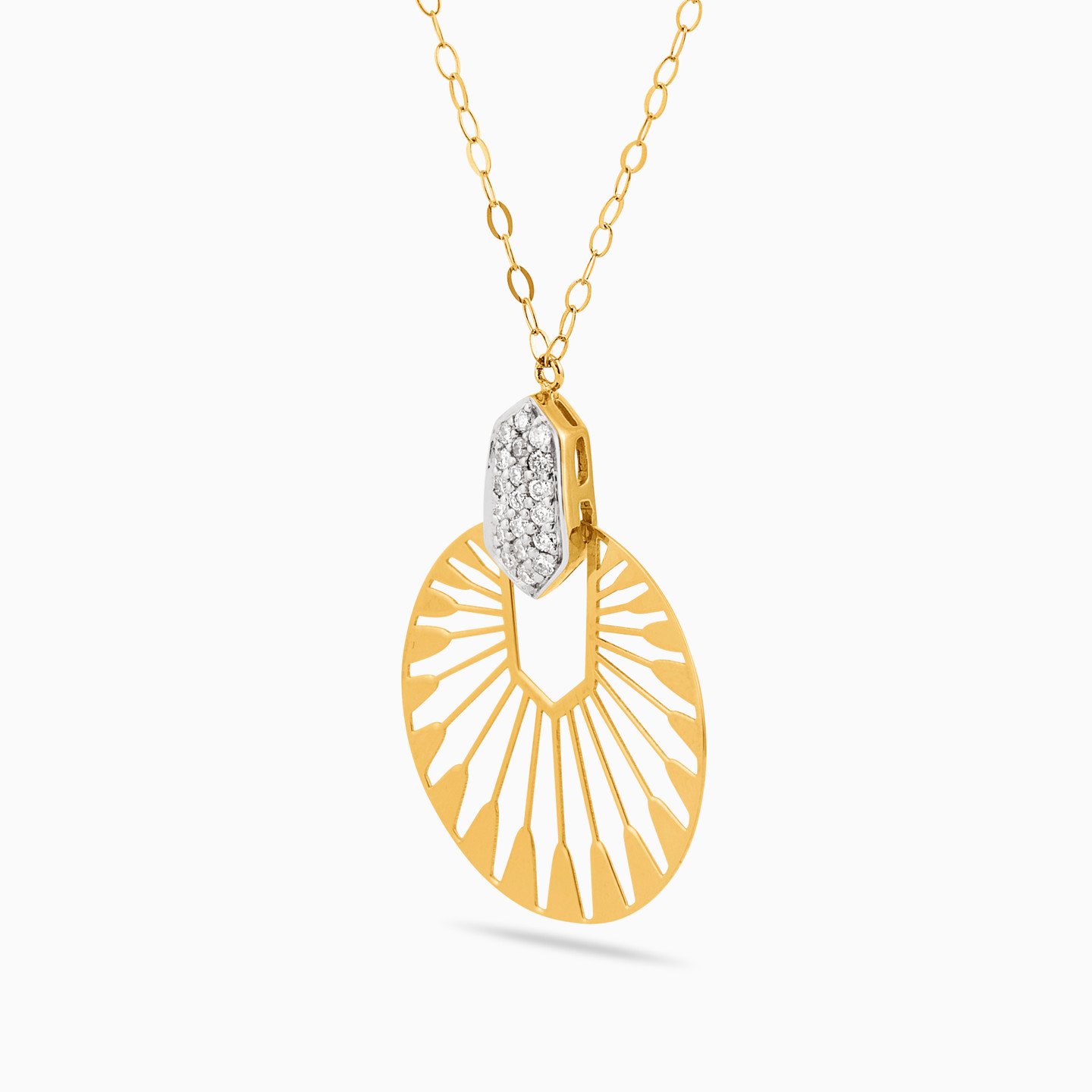 Bring all that shine to your wardrobe with this necklace from L'azurde Diamonds. The cutwork pendant in 18-karat yellow gold is accented with brilliant cut diamonds and drops boldly from a delicate chain. We think this number will effortlessly take you from day to evening.