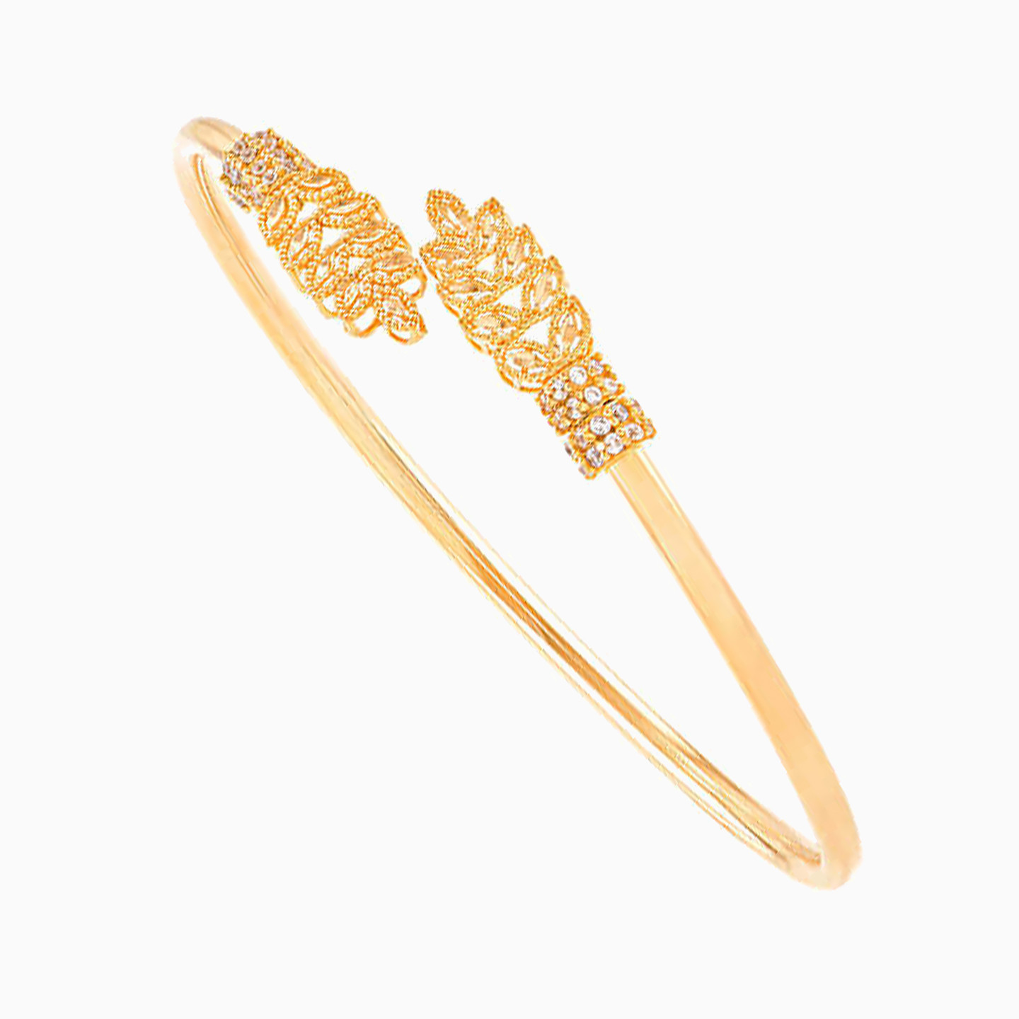 Eternal classics like these will become an instant part of your everyday wardrobe with their sheer simplicity and style. This 21-karat yellow gold open bangle from L'azurde Gold features leaf motifs lightly accented with white stones. Wear yours solo or with a matching ring to complete the look.