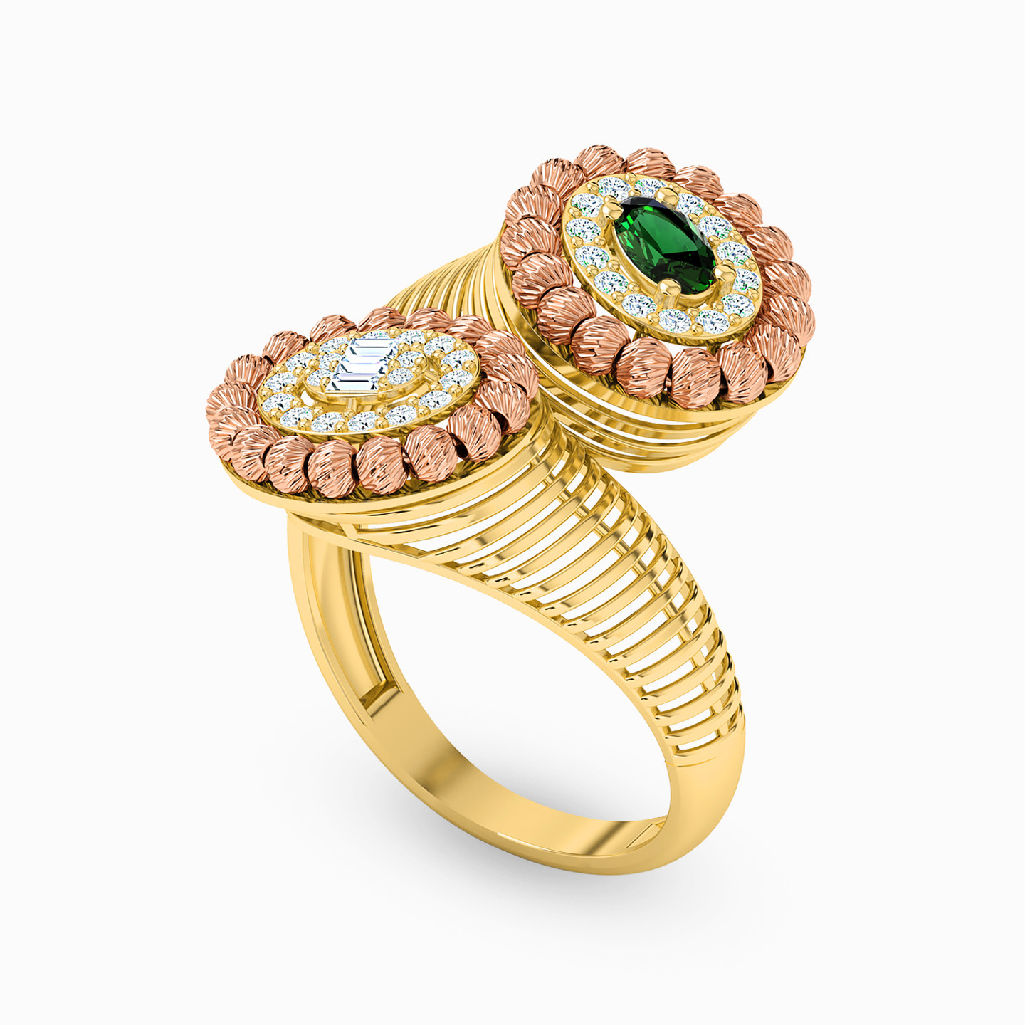 This dazzling two-headed ring from L'azurde Gold makes an apt choice of jewelry with festive and occasion wear. It is cast in 21-karat yellow gold and features rose gold beads that border sparkling cubic zirconia to one side and a green stone with zirconia to the other. The cylindrical cutwork band gives it a weightless feel as it sits delicately on your finger.