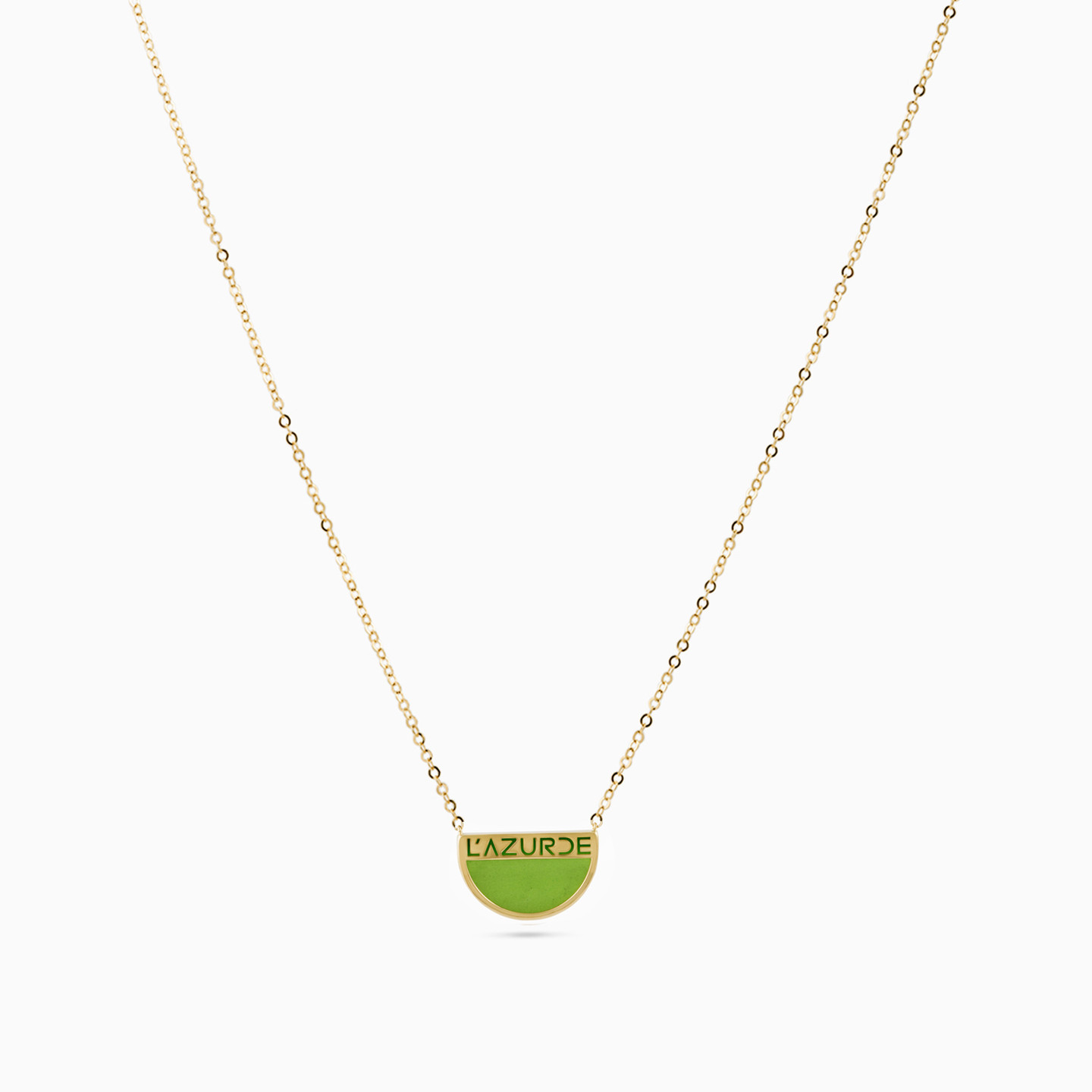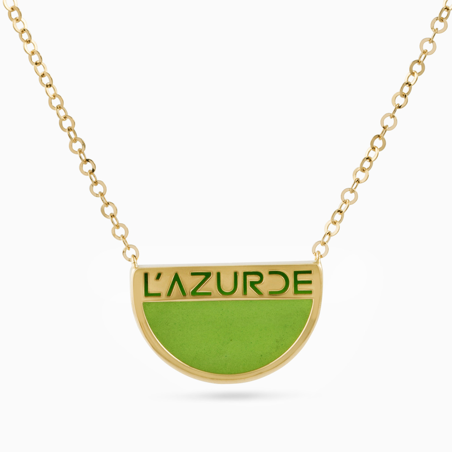 Your day to evening look will get an instant upgrade with this iconic necklace from L'azurde gold. The semi-circle pendant features the brand name engraved in 18-karat yellow gold and enhanced with a green accent. Suspended from a dainty chain, this number can be worn solo or layered.