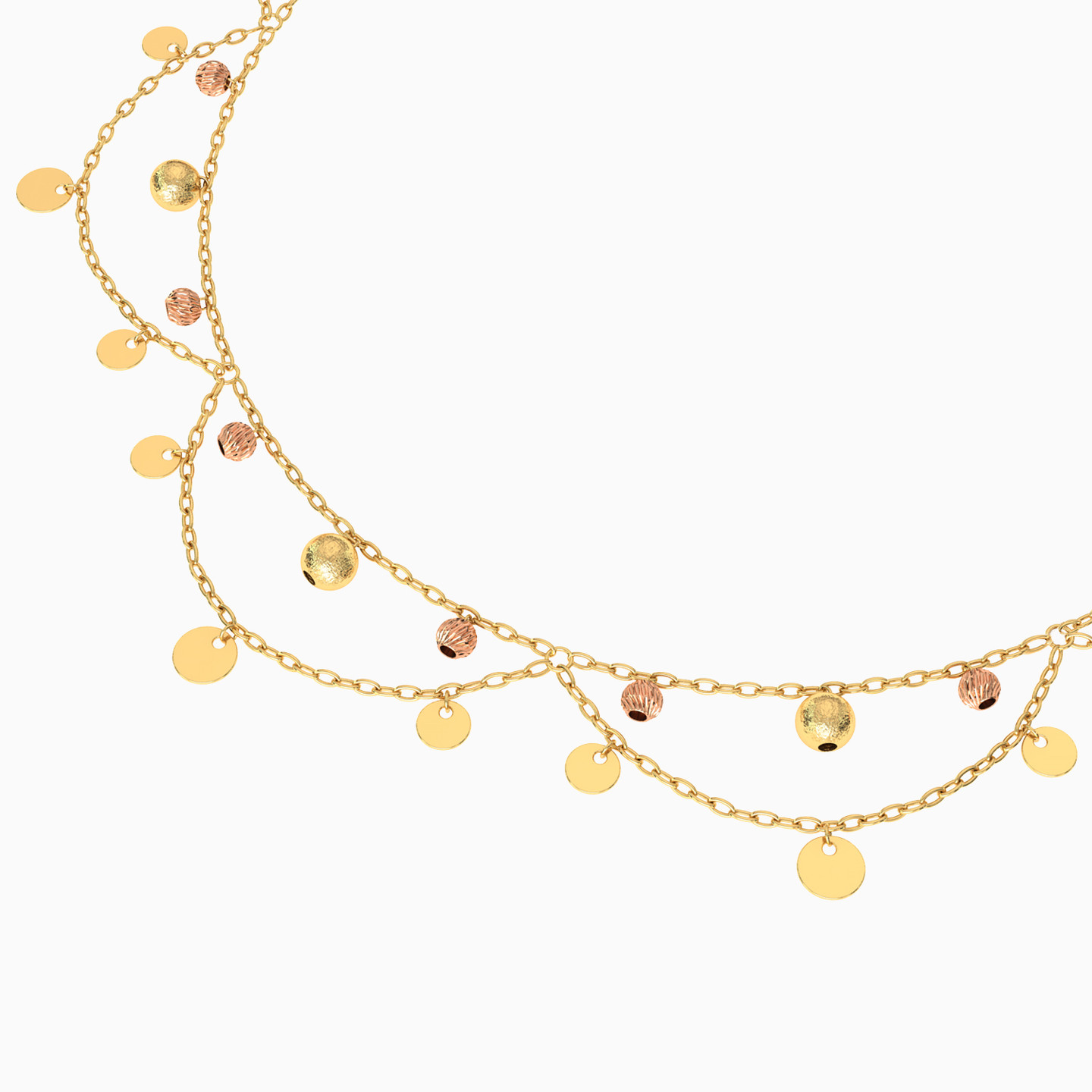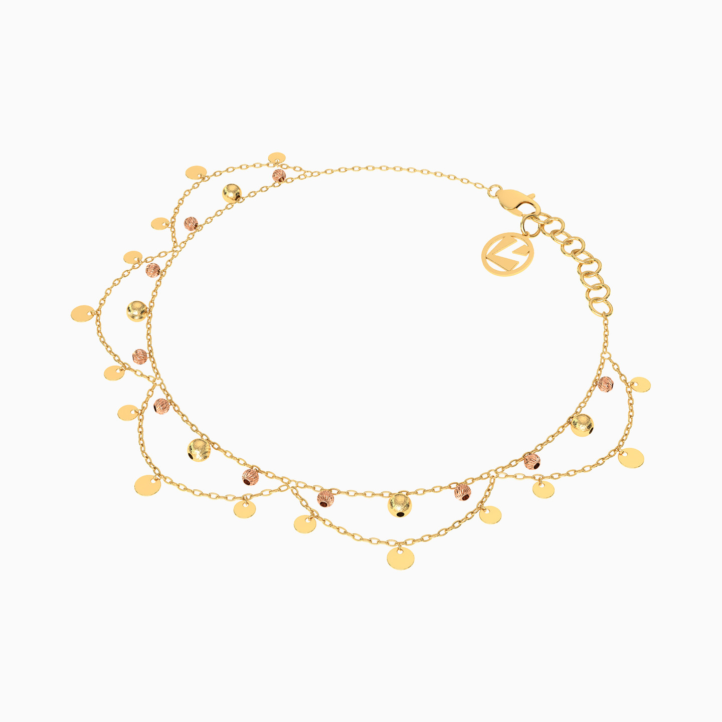 Add a sophisticated touch to any look with this eye-catching chain anklet from L'azurde Gold. A dainty dangling chain, elegant golden discs, and lovely beads give this enchanting 18-karat yellow and rose gold chain anklet its feminine allure. This is the perfect accessory to adorn your ankle when wearing shorts, a dress, or capris.