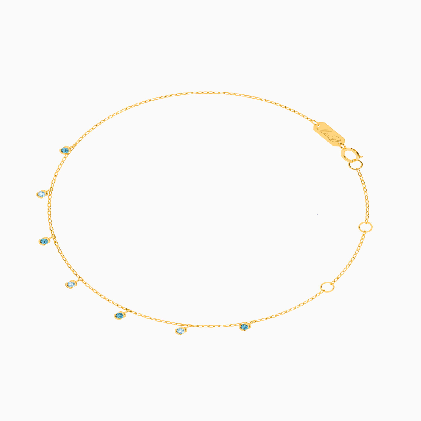 Add a playful touch to your ankles with this charming anklet from Miss L’. Dotted with blue topaz and aquamarine stones, this piece will effortlessly blend in with your weekend look. We recommend pairing it with a flowy skirt or dress to truly highlight its style.