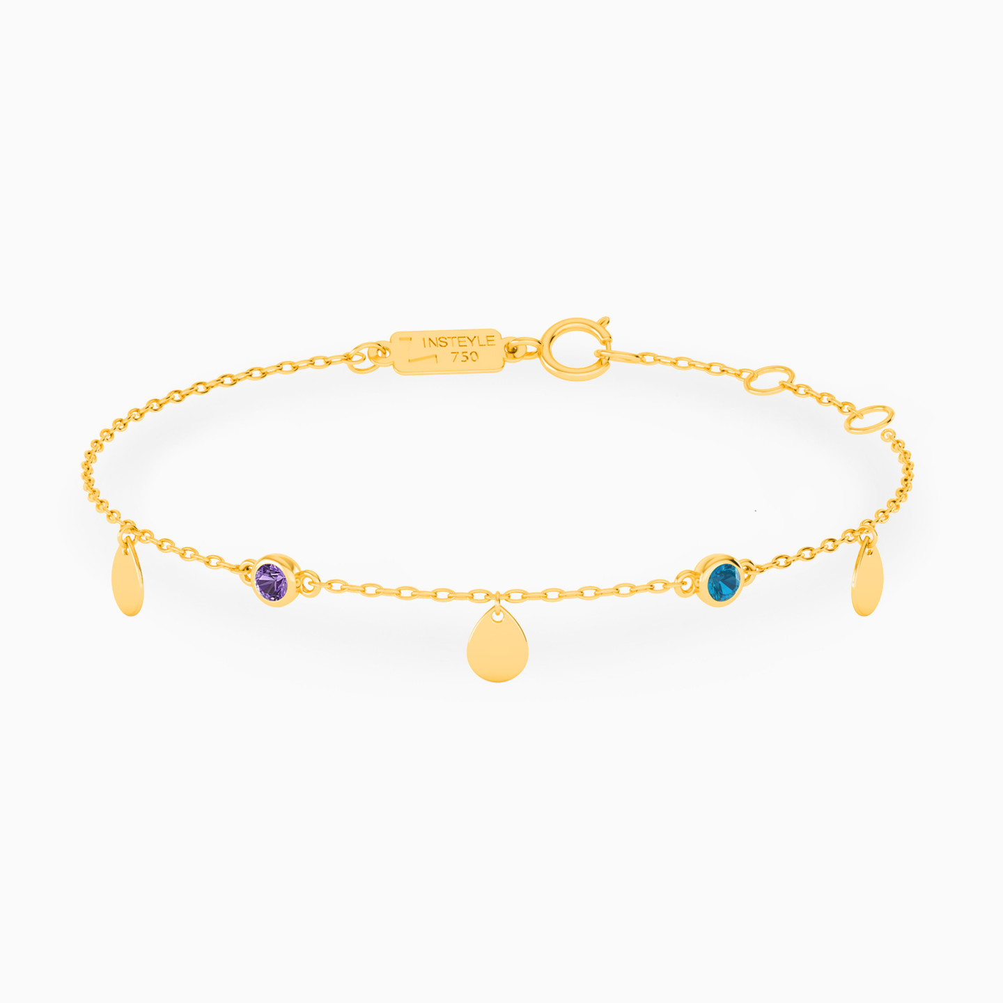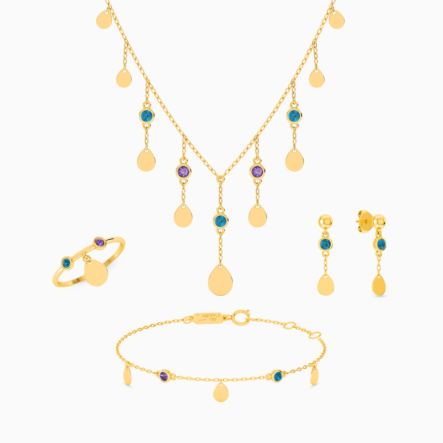 Style up your evening outfit with this unmissable set of jewelry from L'azurde Instyle. Featuring a drop necklace and drop earrings along with a bracelet and ring, this 18-karat yellow gold set is accented with colored stones in purple and blue. You can wear the individual pieces on their own or as a complete set with a party dress.
