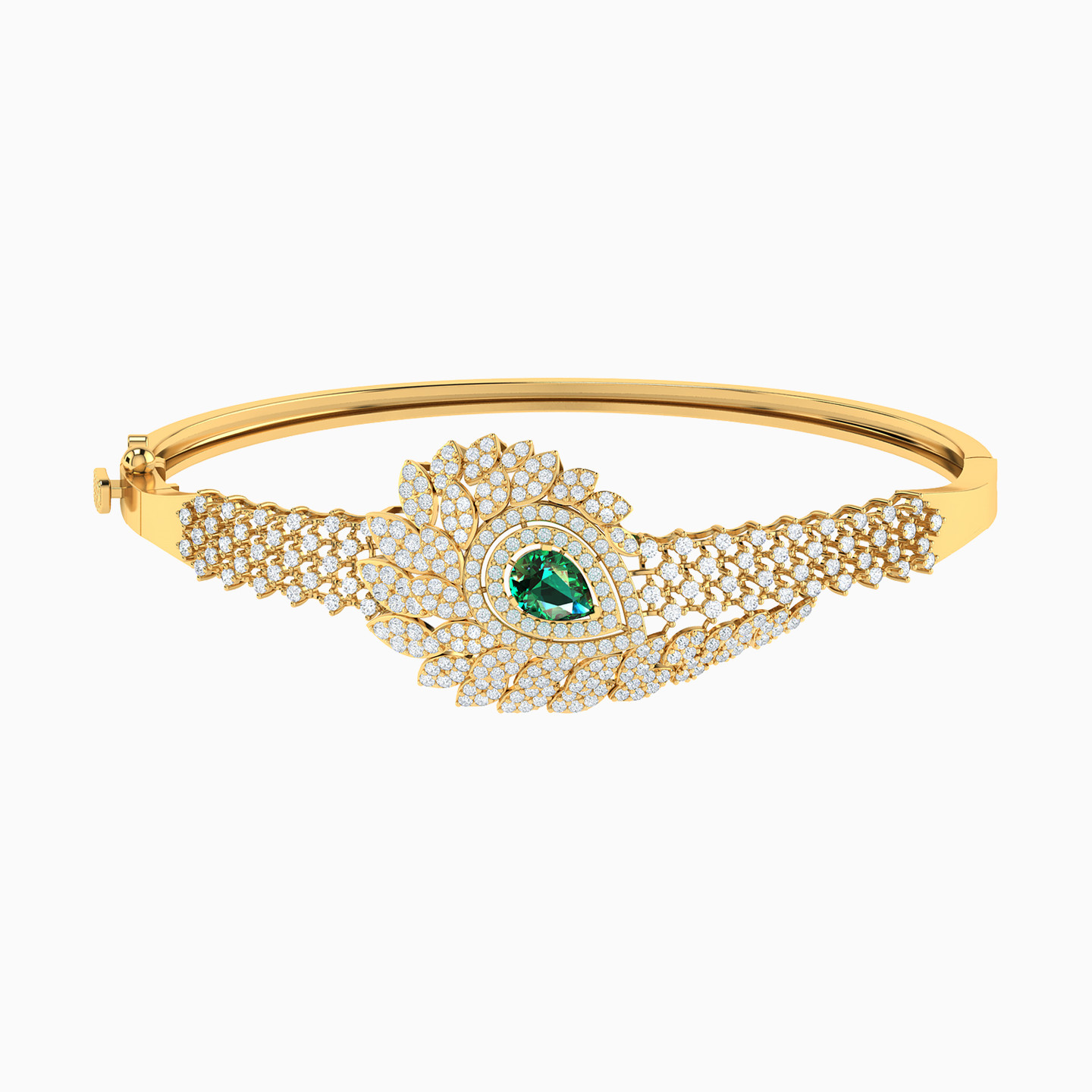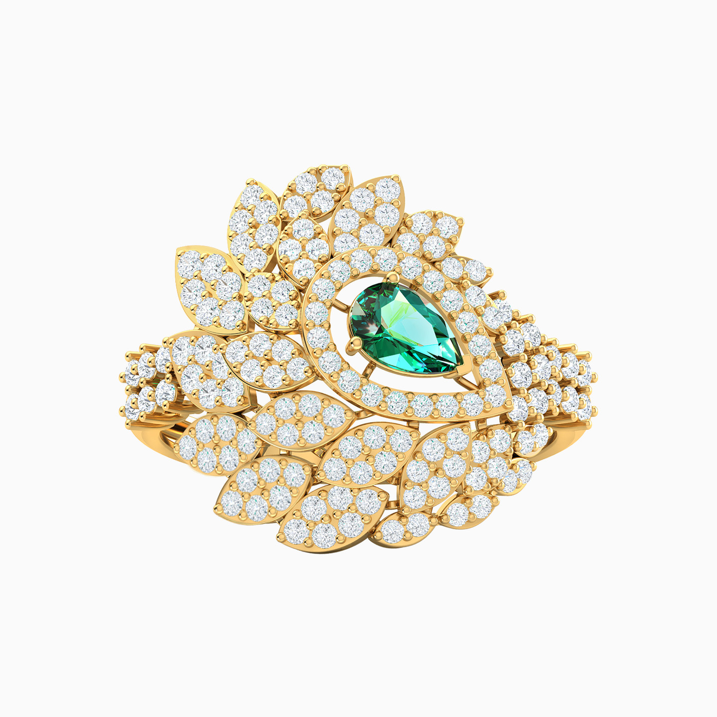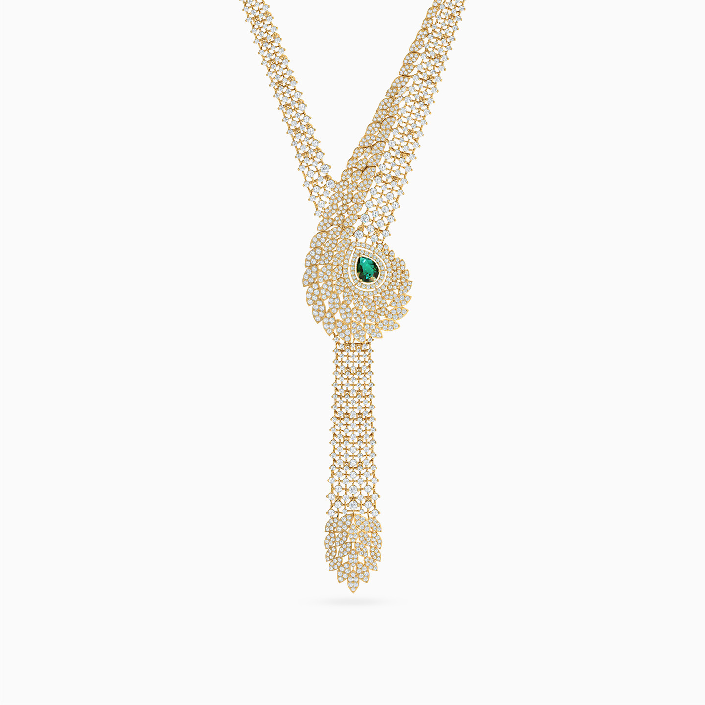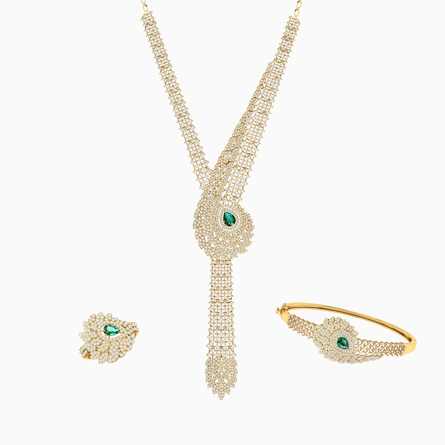 Make a grand entrance without saying a word by wearing this striking jewelry set by L'azurde Gold. Designed to impress, this shimmering 18-karat yellow gold set features a mesh-like design covered in sparkling stones with marquise and teardrop-shaped motifs and captivating green stones as the focal point. This set includes a show-stopping lariat-style necklace, bangle bracelet and statement ring. You'll feel like royalty wearing these exquisite pieces.