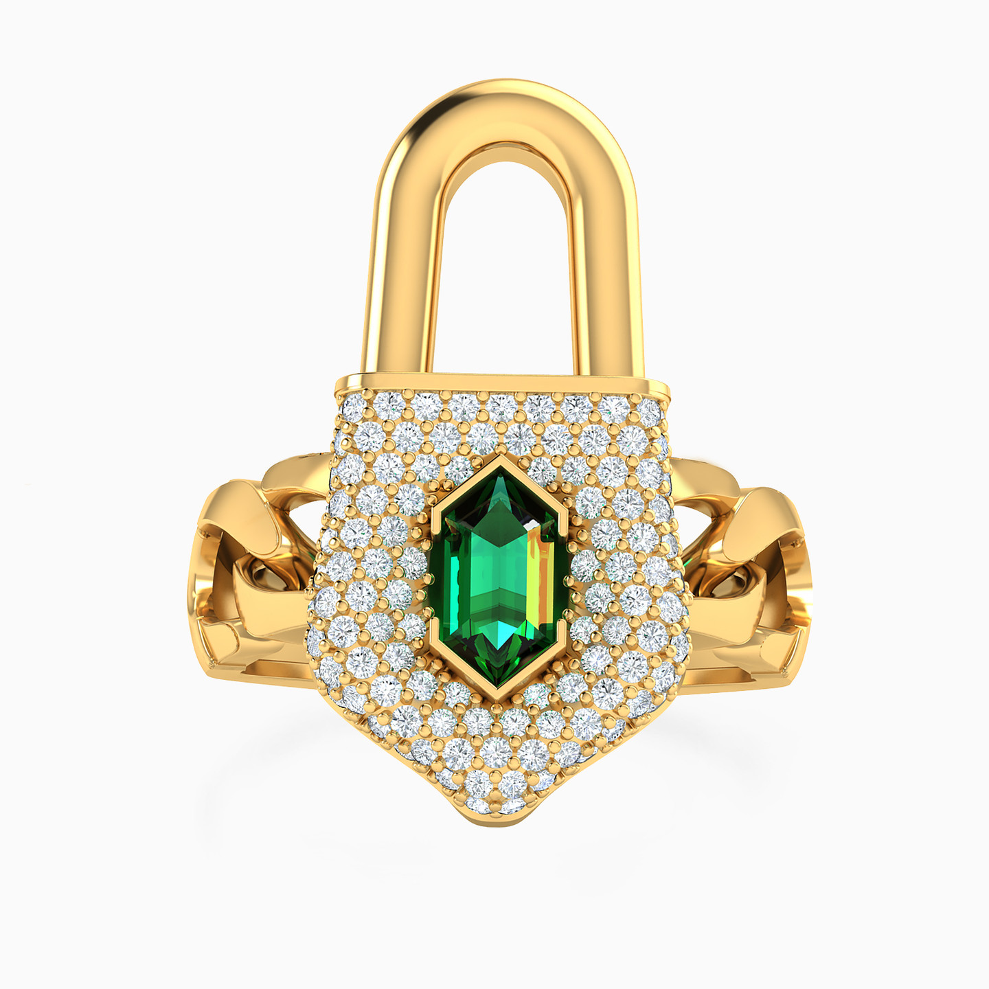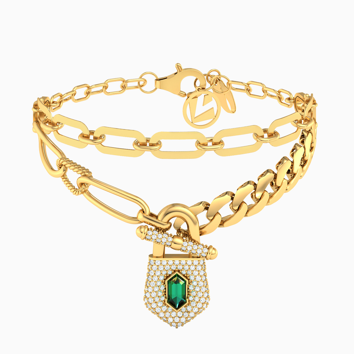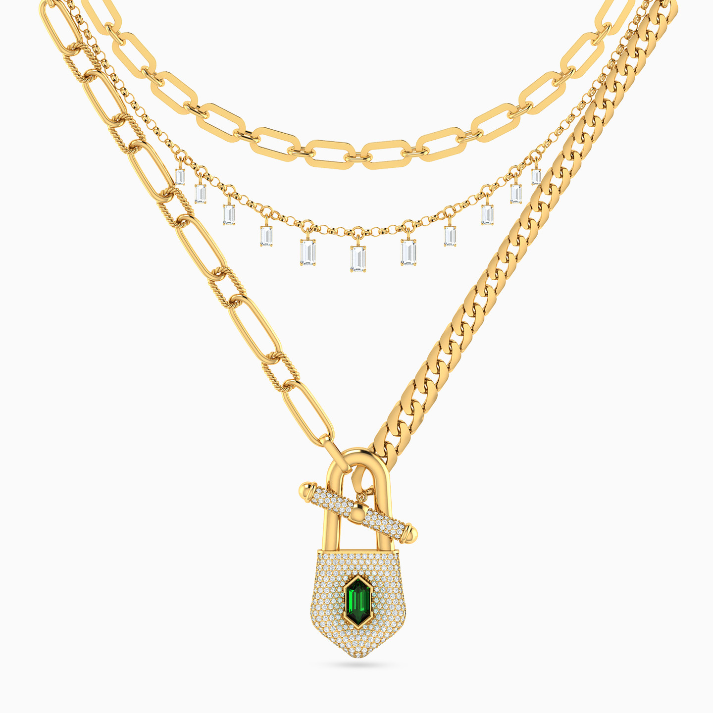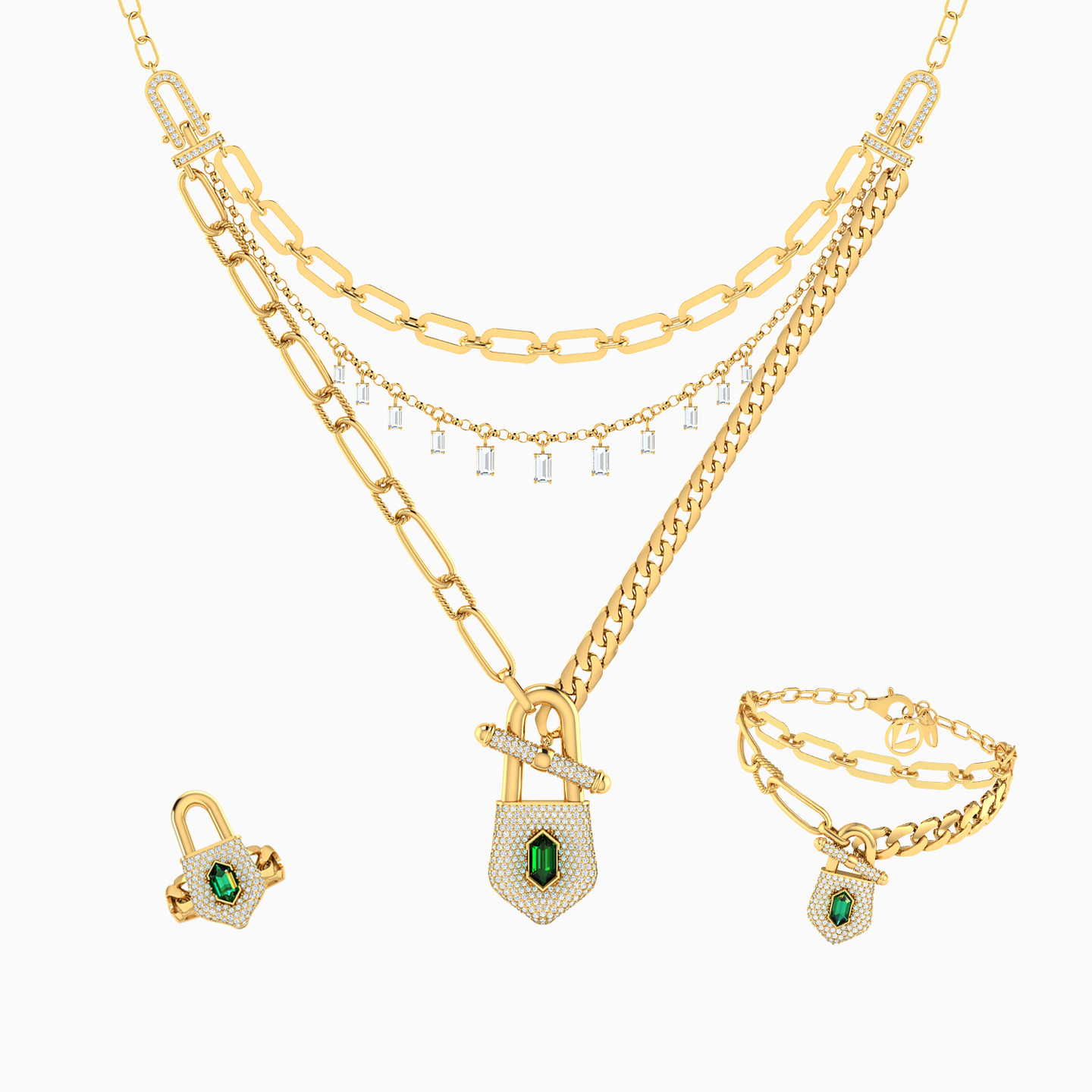 Add layered luxury to your wardrobe with this exquisite necklace, bracelet and ring jewelry set from L'azurde Gold. Featuring layered chains in multiple styles, dazzling padlocks and uniquely-shaped green stones, this is the ultimate 18-karat yellow gold set to up the wow factor when the occasion calls for the very best accessories. You'll always be the center of attention when you wear this spectacular jewelry set.