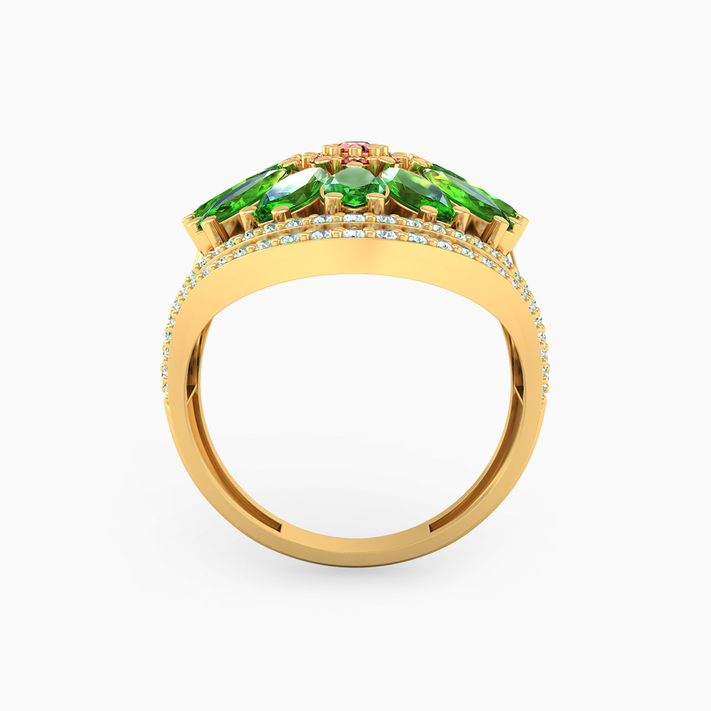 It's amazing how a single accessory can have such a dramatic presence. This jaw-dropping colored stone ring from L'azurde Gold owes its beauty to the eye-catching emerald green and fuchsia colored stone flower with dazzling zirconia accents shining from a beautiful 18-karat yellow gold setting. What a spectacular ring to add a touch of luxurious sparkle and color to every outfit.