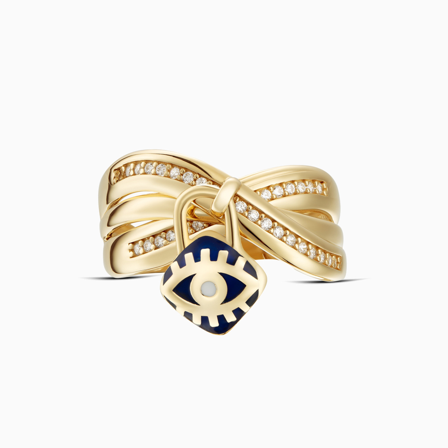Nothing allows you to shine like a captivating statement ring from L'azurde Gold. We love this stylish 18-karat yellow gold ring with its modern gold lock charm at the center adorned with a black and white enamel-coated evil eye design for protection. The elegant criss-cross band and dazzling cubic zirconia accents add to the beauty of this ring which is just perfect for elevating your everyday wardrobe.