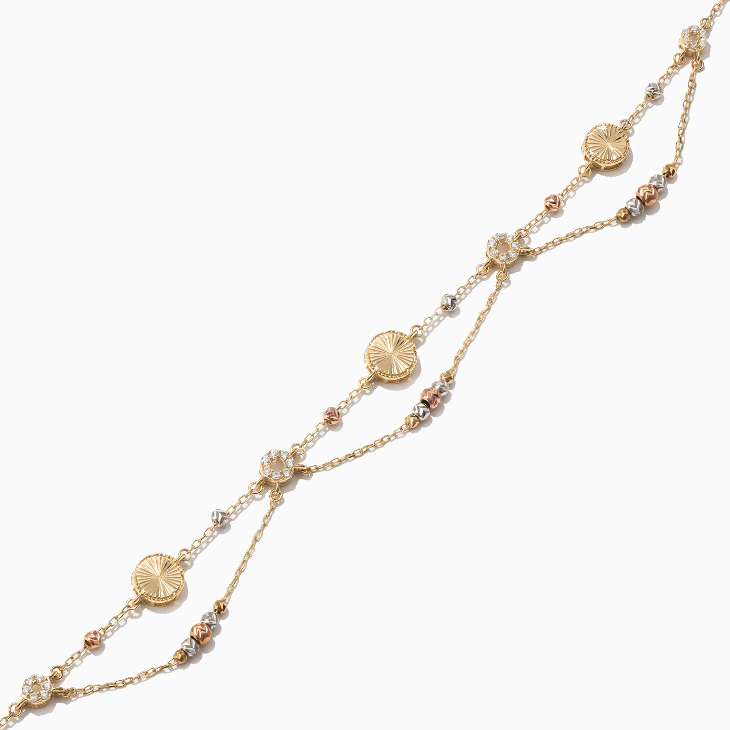 Beautifully detailed etched beads in 18-karat yellow, white and rose gold give this feminine bracelet from L'azurde Gold its timeless and feminine appeal. With a stunning mix of gold discs, rings of dazzling cubic zirconia stones and a double layer of chic chains, this bracelet makes an essential addition to your jewelry repertoire. Wrap it around your wrist for work in the morning and it will transition with you to late night festivities.
