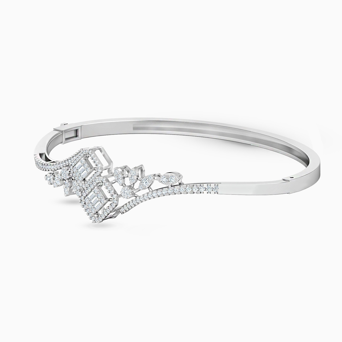 Inspired by the soft embrace between two lovers comes this lovely piece by L'azurde Diamonds. Two rectangle-shaped frames studded with 0.81-carat brilliant cut diamonds and accented by studded leaf-shaped motifs sit beautifully between two pave diamond waves. This 18-karat white gold bracelet has an aura of elegance and style that will impress any onlooker.