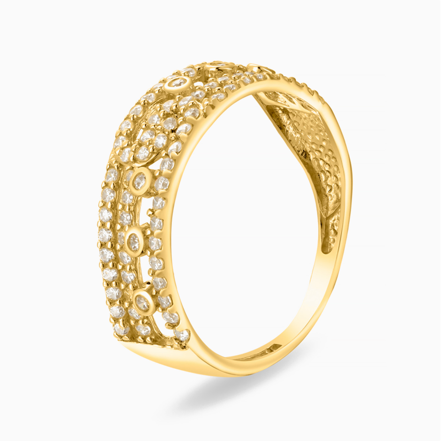 Dazzle them with your brilliance by wearing this striking statement ring from L'azurde Gold. This head-turning ring is beautifully crafted in 18-karat yellow gold and covered in sparkling cubic zirconias with a prong-set zirconia at the center of an elegant triple-row zirconia band. You'll love how one simple move of your hand will have you commanding attention with eye-catching shimmer and shine.