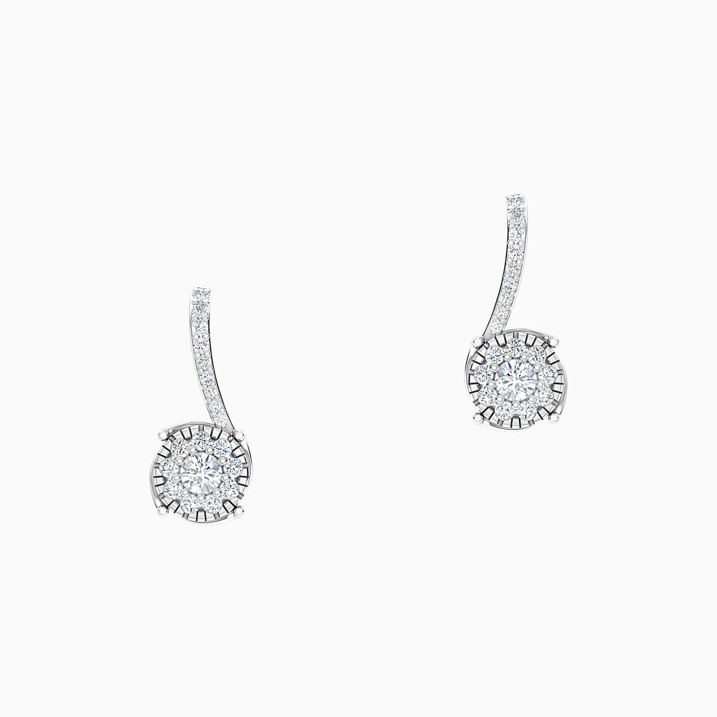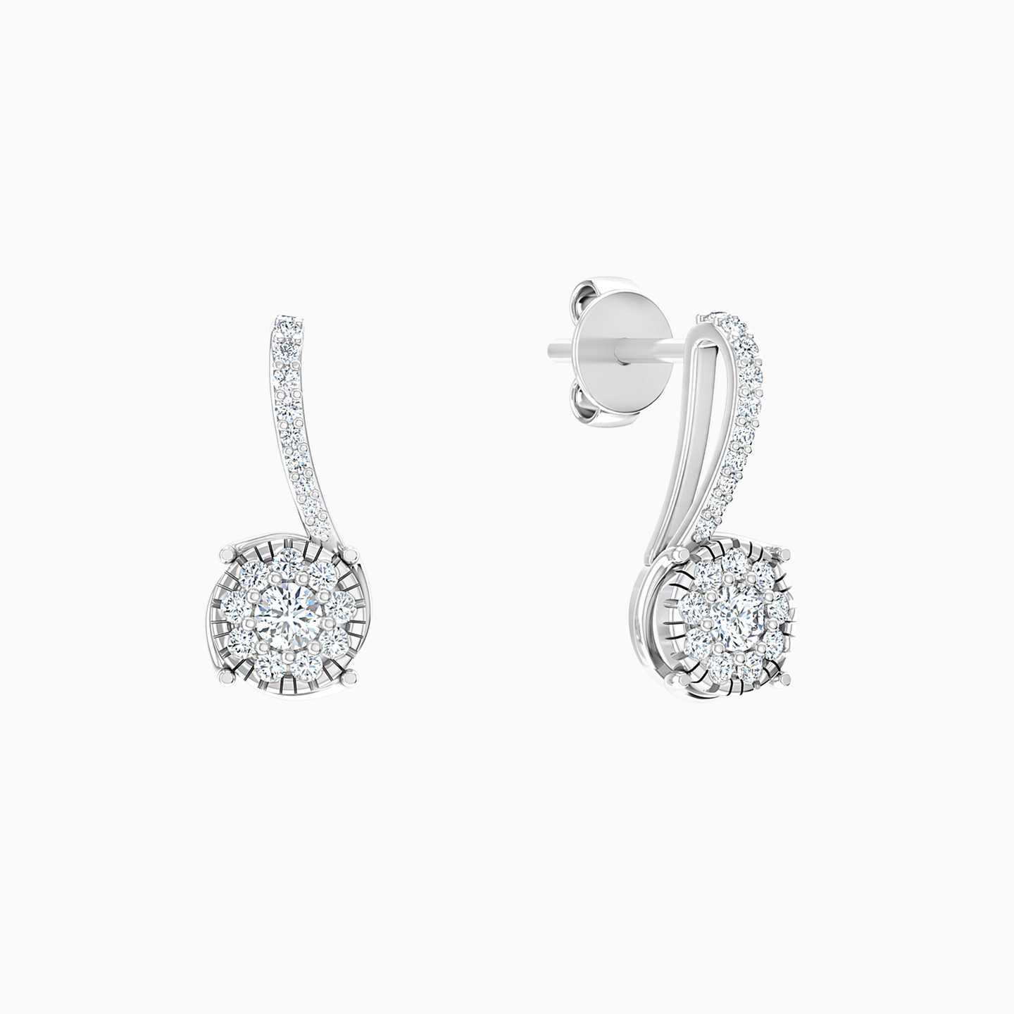 Showcase your one-of-a-kind style with earrings that get noticed from L'azurde Diamonds. Curvy diamond bars lean gracefully to the side, revealing a mesmerizing round cluster of diamonds at the center of each earring. Chic details add to the beauty of these lovely earrings. Crafted in highly polished 18-karat white gold with a total of brilliant cut diamonds, these drop earrings exude feminine charm. Paired with the matching pendant, these pieces are the perfect anytime accessory.