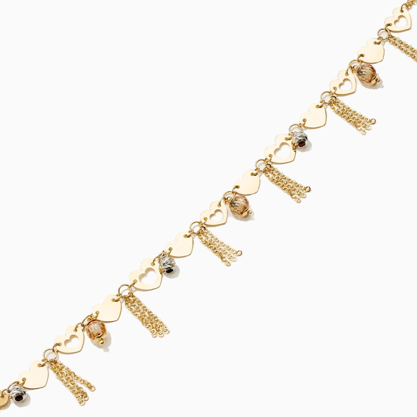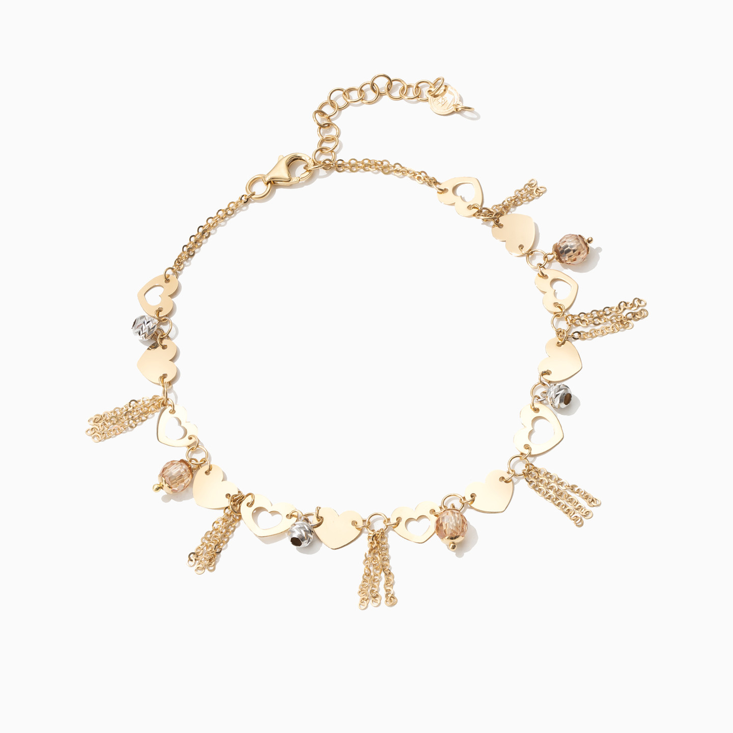Make a sophisticated statement by wearing this gorgeous chain bracelet from L'azurde Gold. A stunning array of chain tassels, shimmering beads, and feminine heart charms adorn this exquisite 18-karat yellow, white, and rose gold bracelet. It makes an elegant addition to any wardrobe.