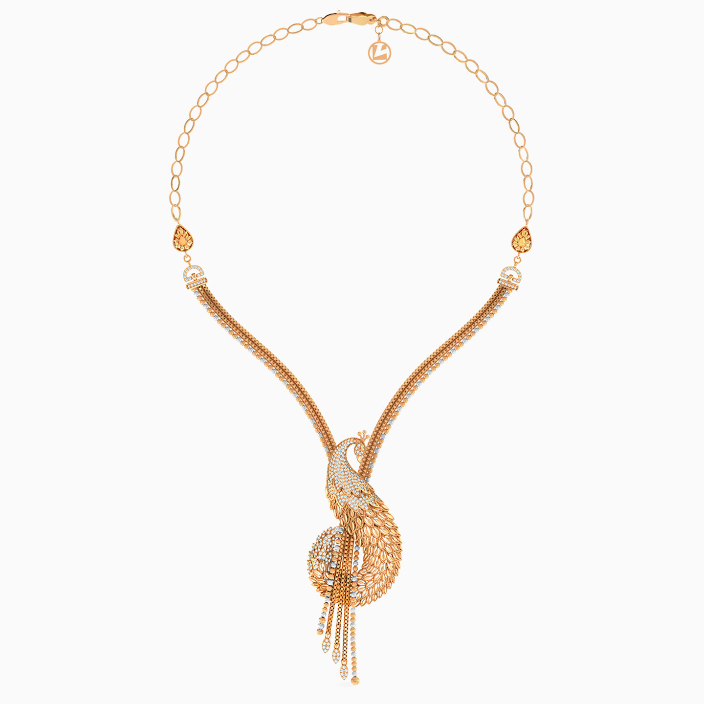 Step into the world of regal elegance with our 21-karat yellow gold jewelry set from L'azurde Gold, a triumphant trio comprising a chain necklace, a bangle bracelet, and a charming ring. At the heart of each piece is a meticulously crafted peacock, its intricate details sparkling with a cubic zirconia-studded head that exudes opulence. The necklace boasts layers of white and yellow gold beads, forming a luxurious chain with delightful dangles suspended from the peacock, while the bracelet features the beautiful peacock in a tender embrace, adding a touch of whimsy and sophistication to your ensemble. This set is the embodiment of grace and charm, a perfect choice for making a statement on any special occasion.