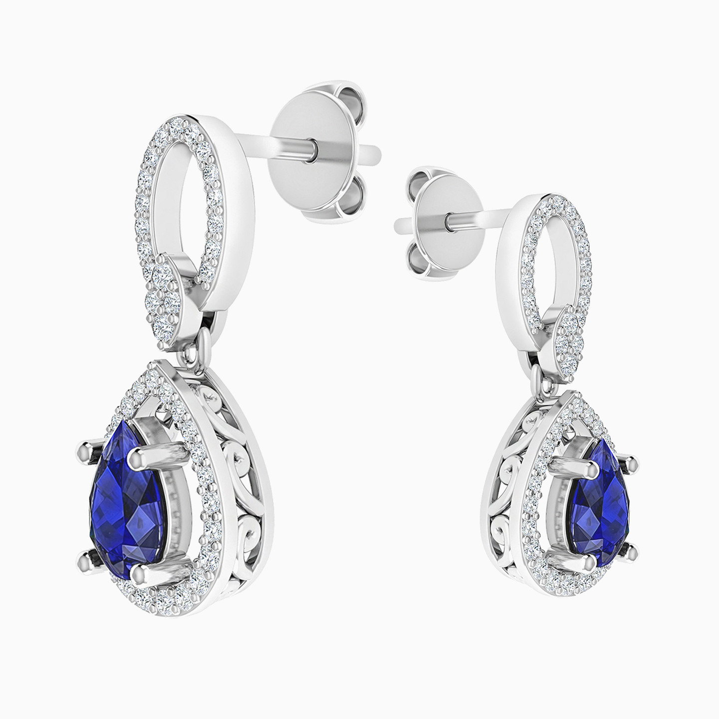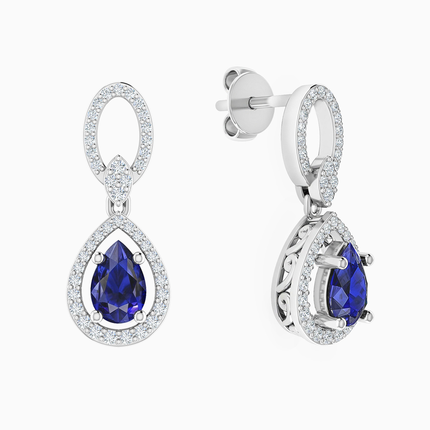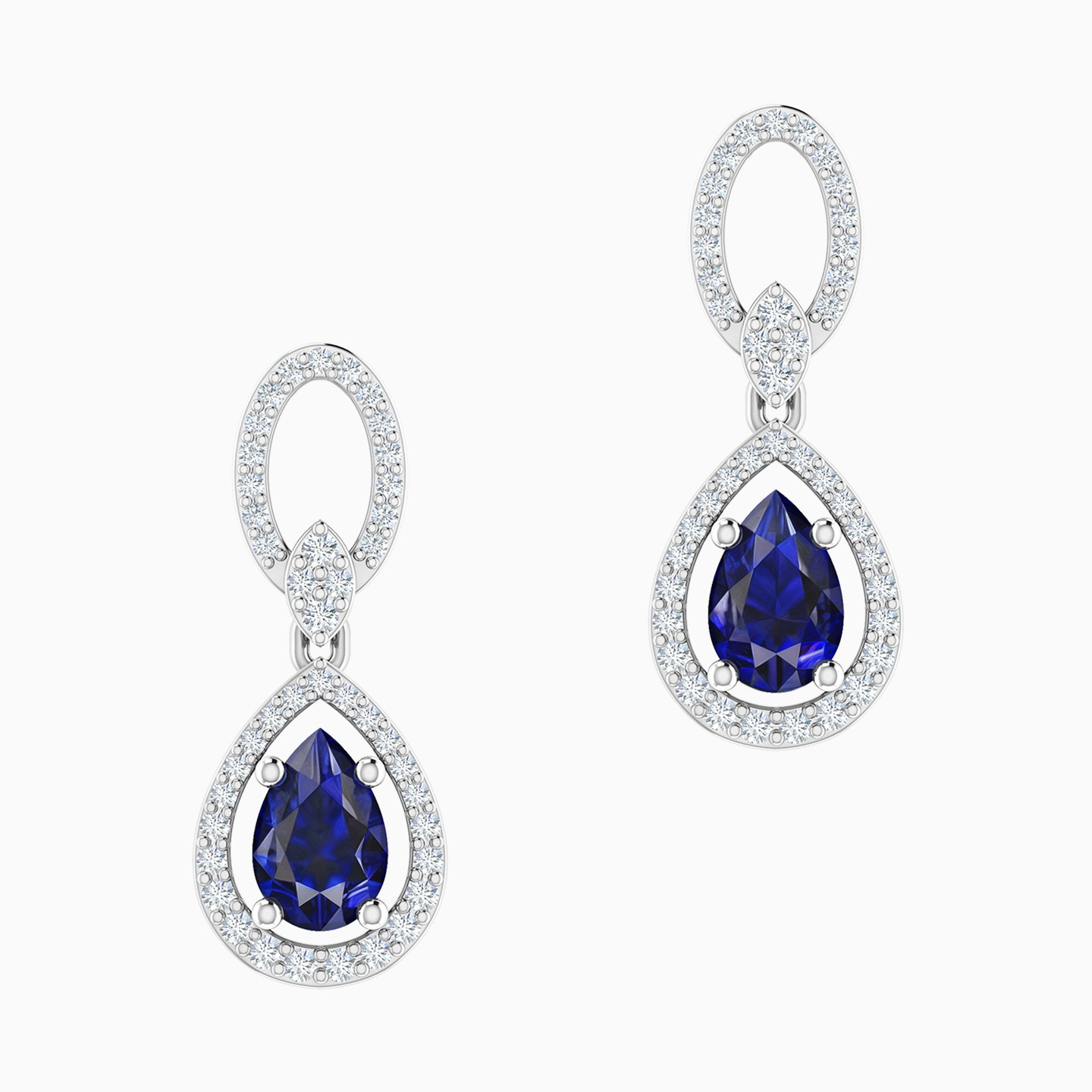 Steal the spotlight by wearing these exquisite 18-karat white gold drop earrings from L'azurde Diamonds to your next social event. These jaw-dropping earrings sparkle with brilliant-cut diamonds and mesmerizing teardrop-shaped sapphire-colored stones. For maximum effect, we recommend wearing these gorgeous earrings with the matching pendant necklace from our collection.