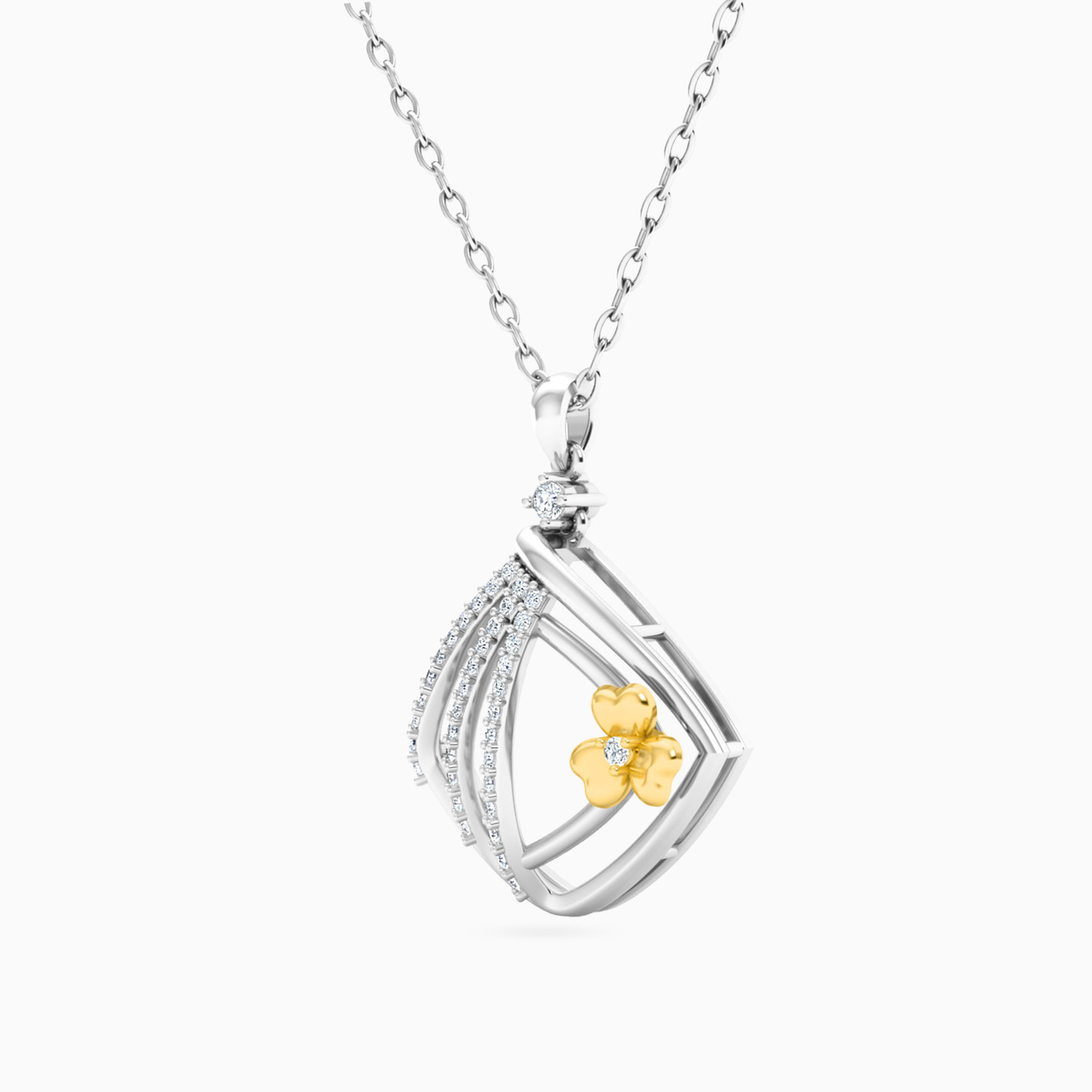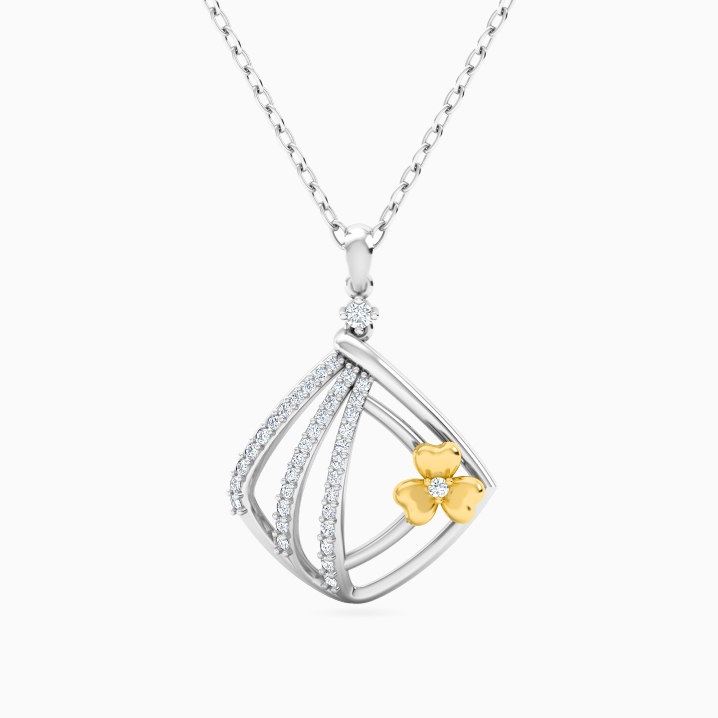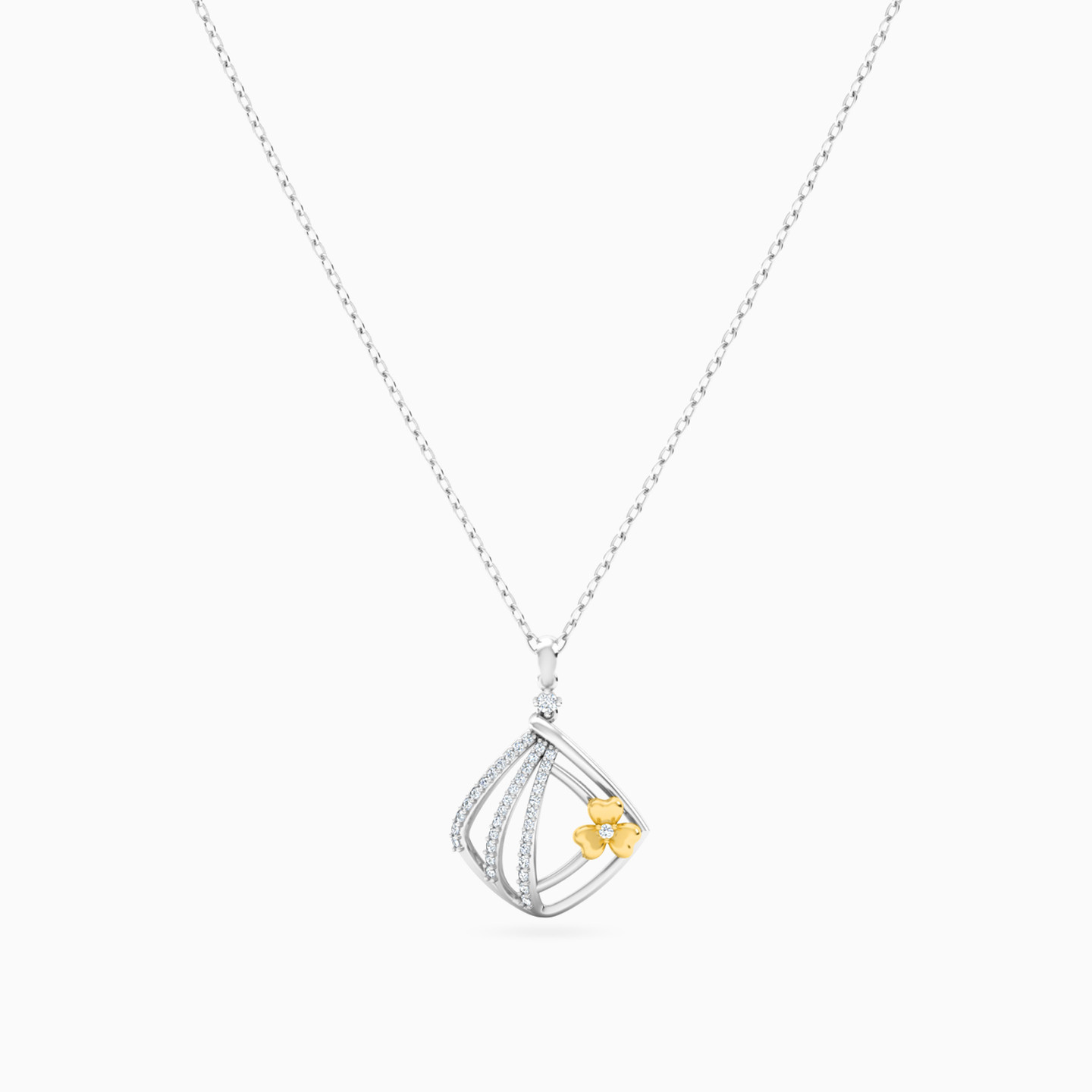 Add eye-catching style to your wardrobe with this diamond pendant necklace from L'azurde Diamonds. This enchanting pendant features lovely 18-karat white gold ribbons dotted with diamonds along one side and showcasing a dainty yellow gold flower on the other. You’ll love how this gorgeous pendant will take you from a work day to an after-work party with elegance and ease.