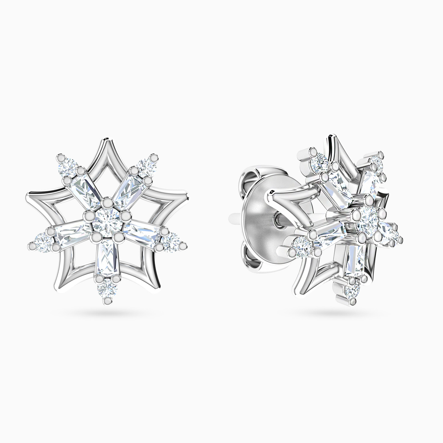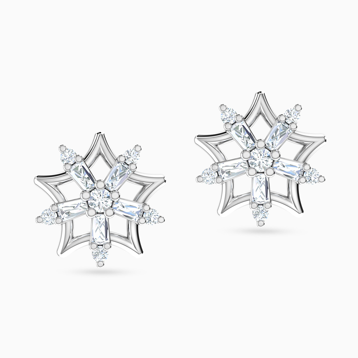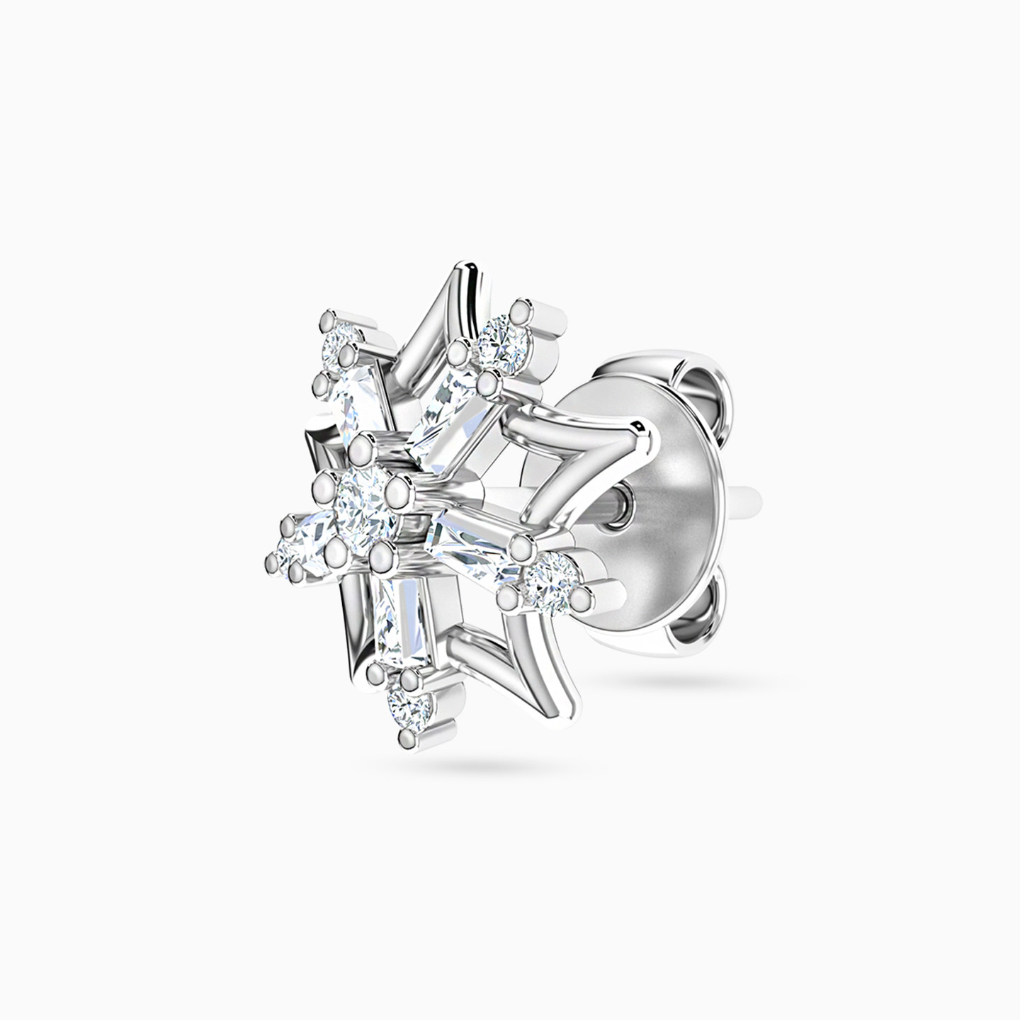 Indulge in celestial elegance with these dazzling 18-karat white gold stud earrings from L'azurde Diamonds. Crafted to perfection, these earrings boast a sleek star-shaped silhouette as a striking base, adorned with a mesmerizing arrangement of brilliant and baguette cut diamonds, creating a celestial masterpiece that twinkles with every movement. Let your ears steal the spotlight at the next party with these stellar studs that capture the essence of a starry night.