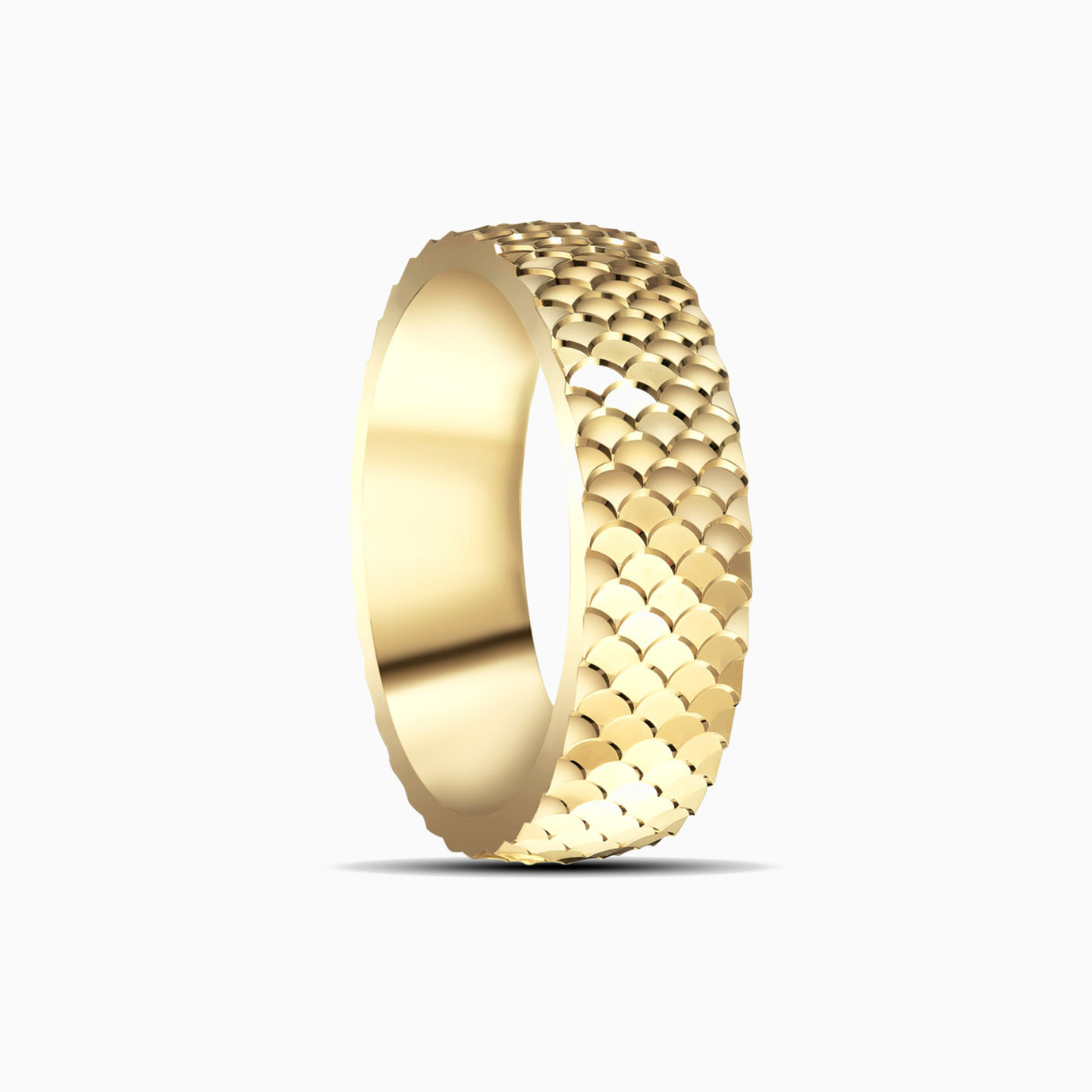 For a bold and contemporary look that’s guaranteed to capture admiring glances, offer your partner this gorgeous wedding band from L'azurde Gold. This ring features a mesmerizing band with breathtaking details—an exquisite all-over fish scale pattern gleaming in 18-karat yellow gold. Your sweetheart will be awestruck by the unique look of this stunning ring.