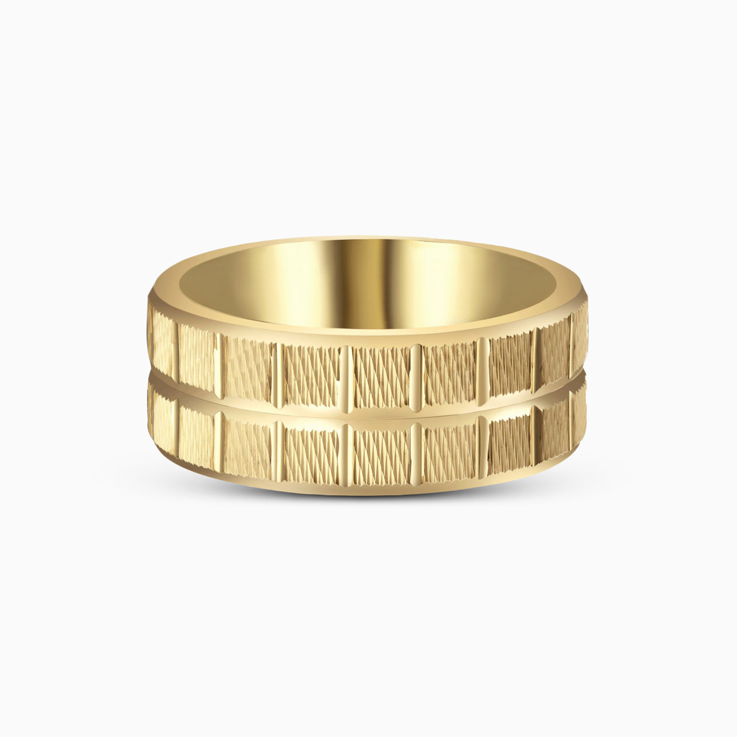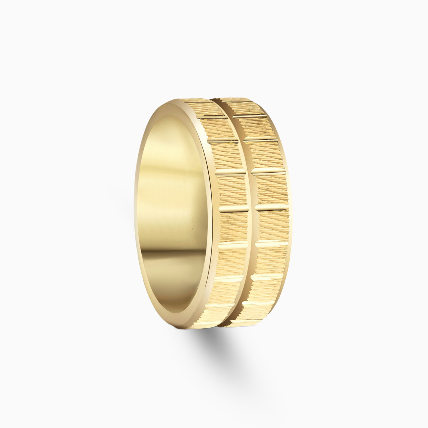 Prepare for admiring glances when you step out wearing this stunning wedding band from L'azurde Gold. Expertly crafted in 18-karat yellow gold, this magnificent wedding band features two sleek rows of eye-catching square cuts that shimmer beautifully in the light. A notched center and soft bevel edges give this ring additional style.