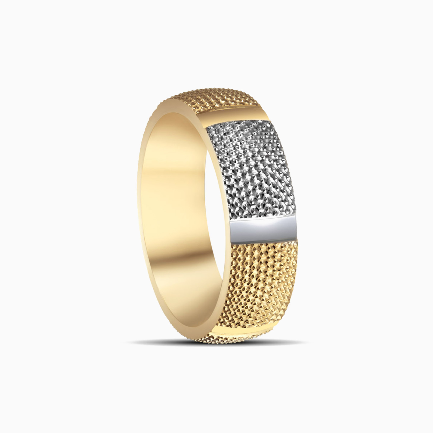 This wedding band from L’azurde Gold is inspired by love that grows deeper and stronger with every step. Celebrate your everlasting love with this beautifully textured ring featuring satin finish bars in between that gives it an elegant touch. This beautiful blend of 18-karat yellow and white gold is perfect for couples looking for something different.