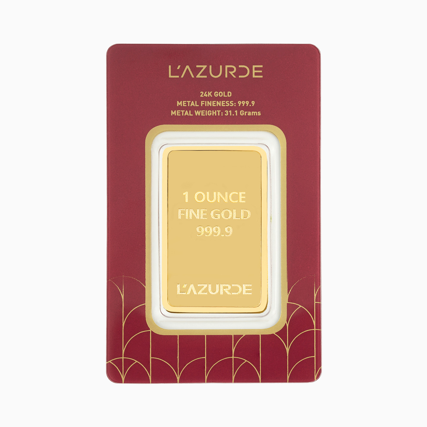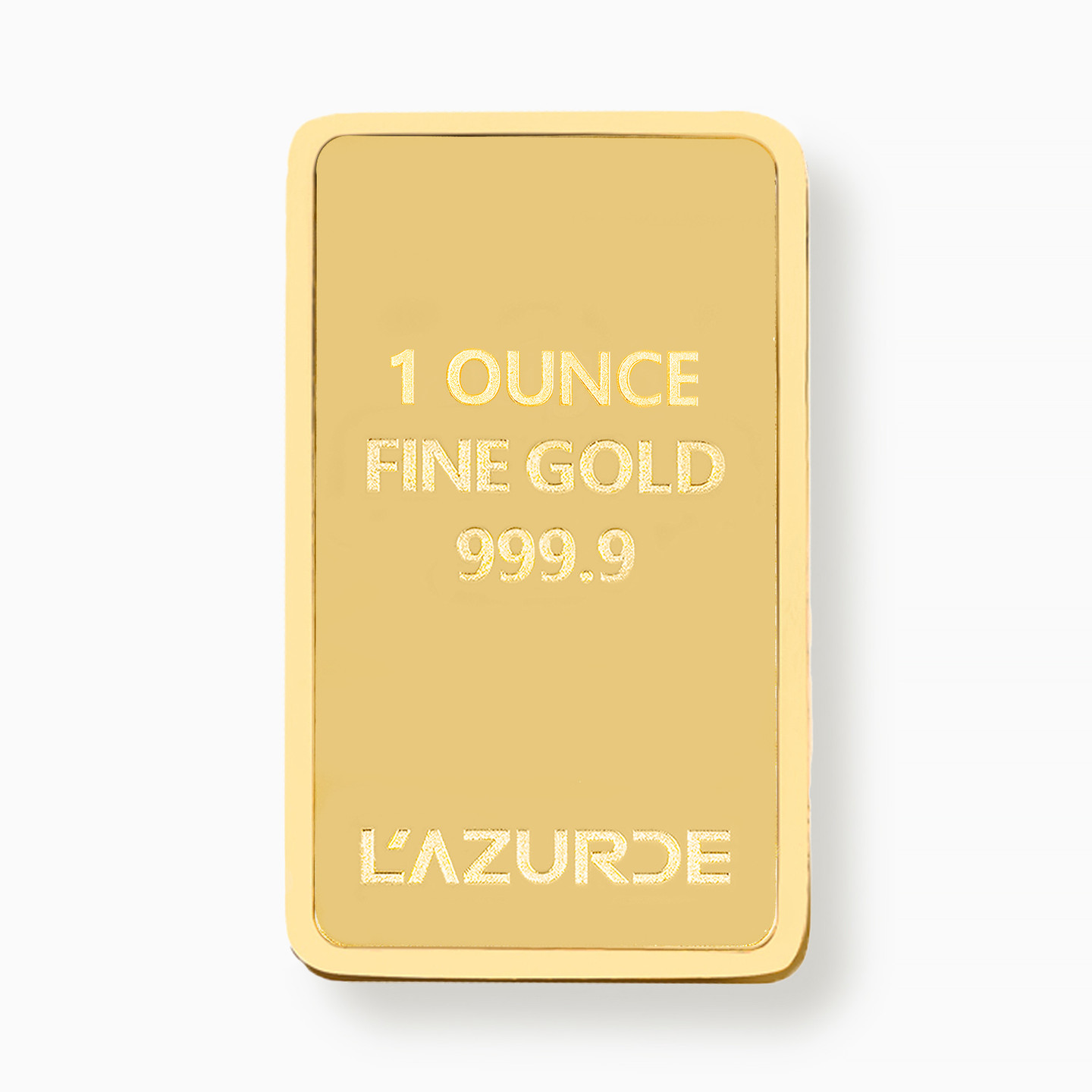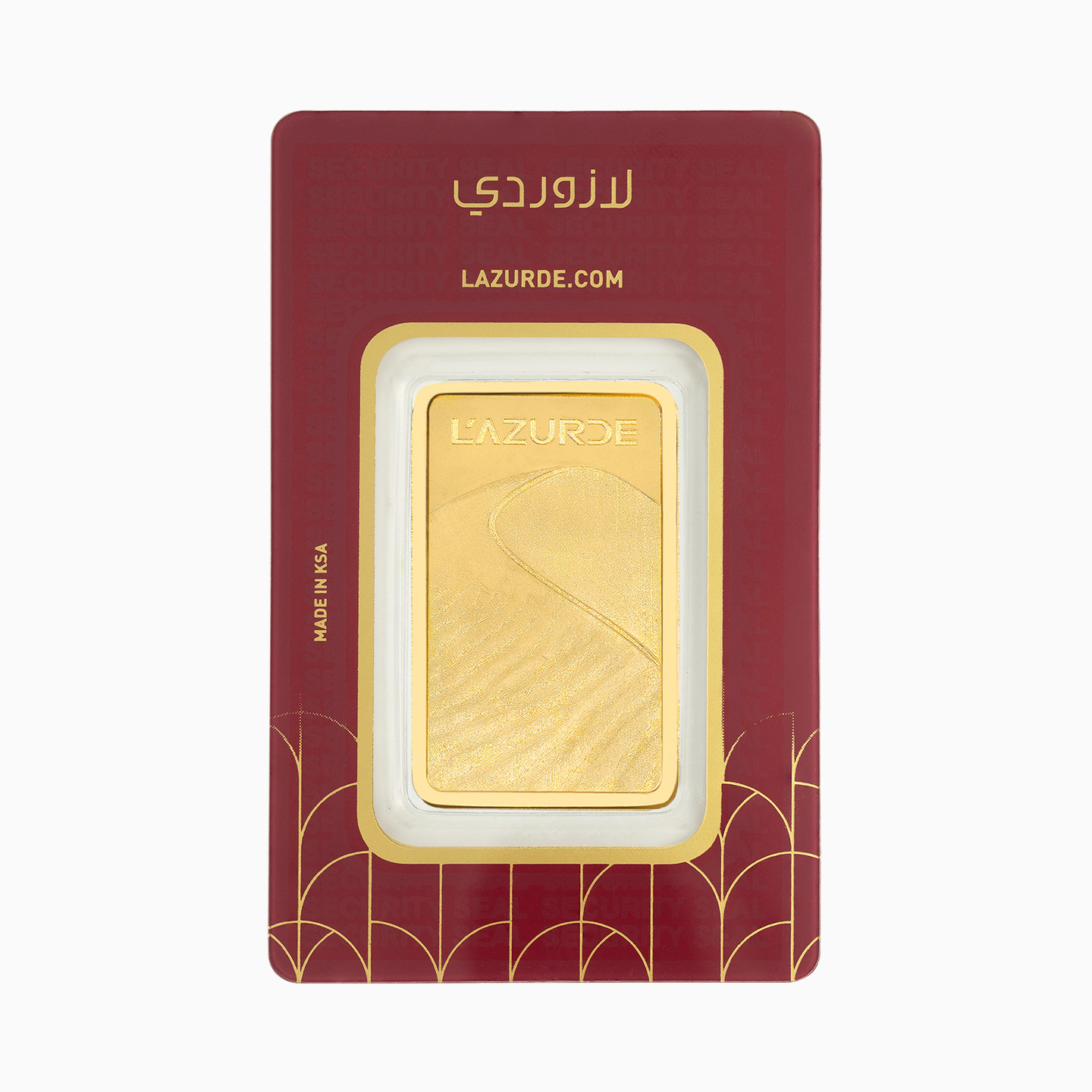 A gold bar from L'azurde Gold, crafted in 24-karat yellow gold, is an excellent investment choice. It features a sand dunes design embossed on its surface.