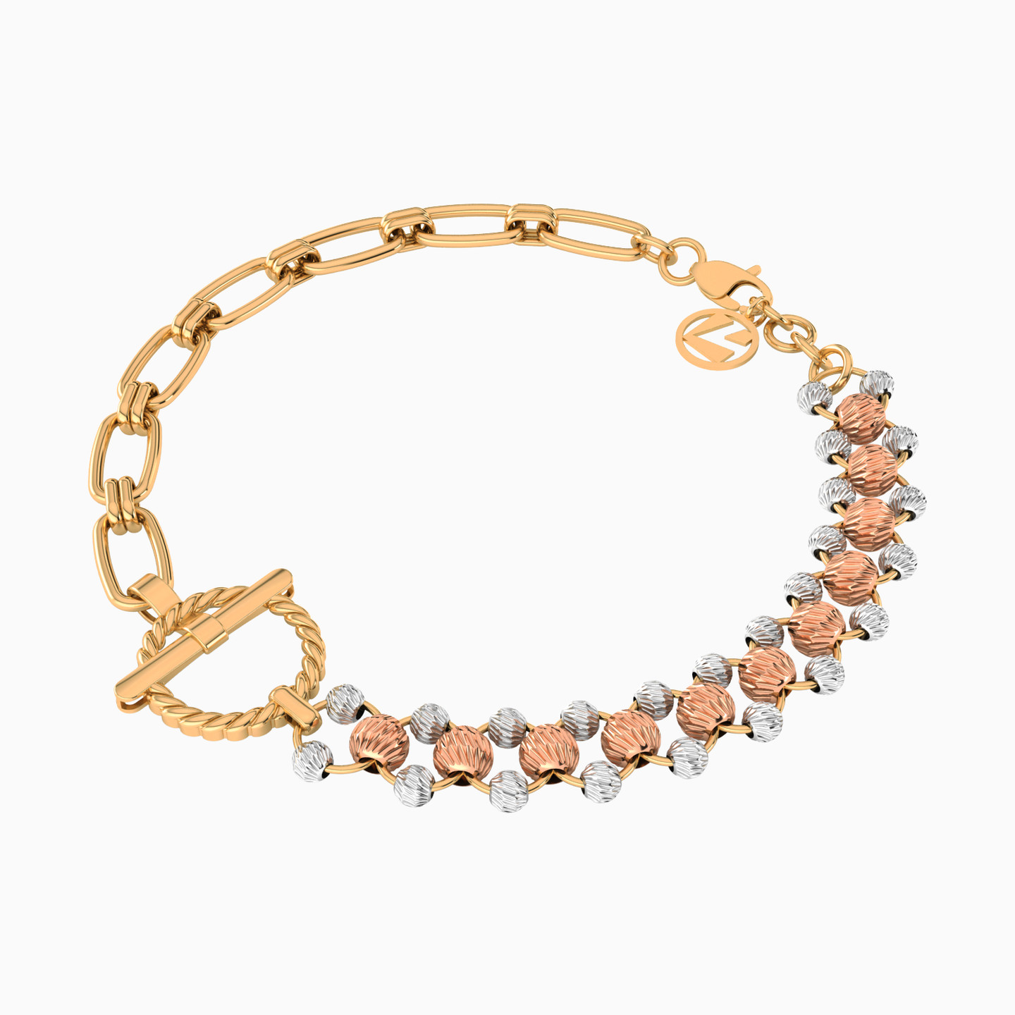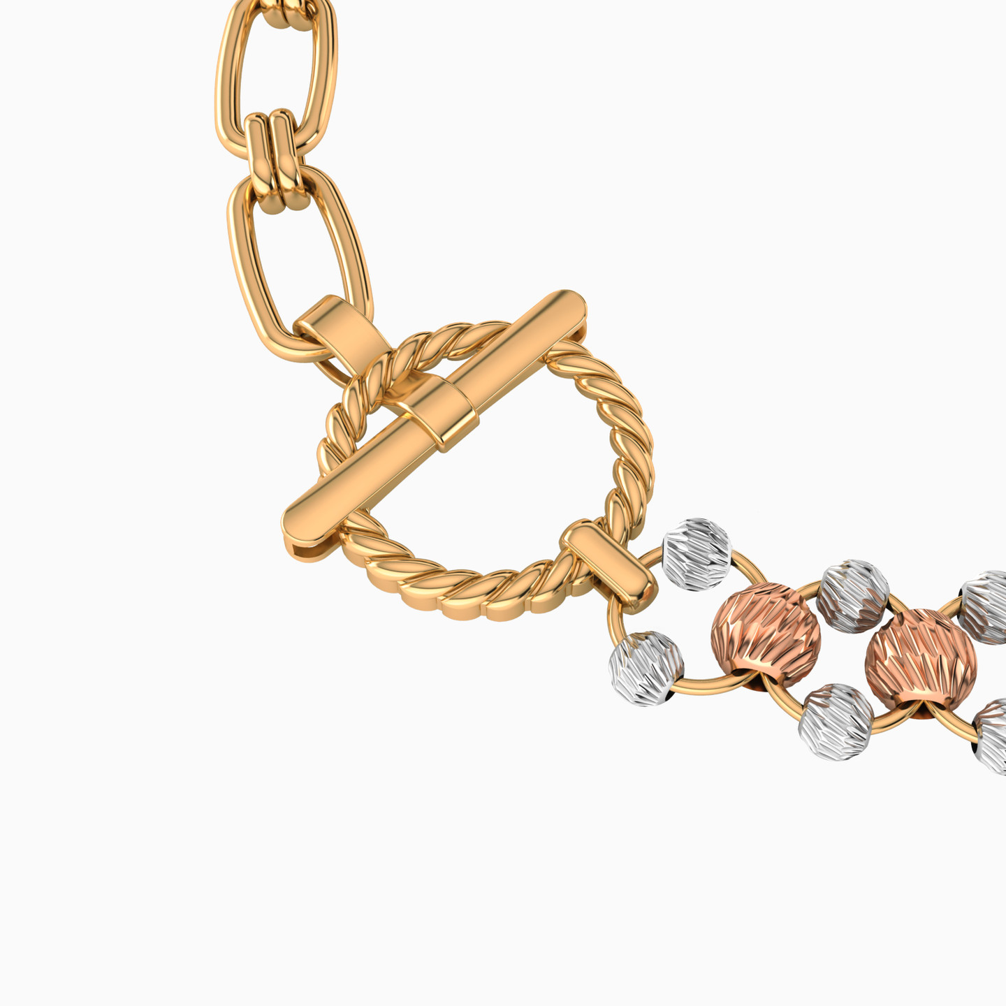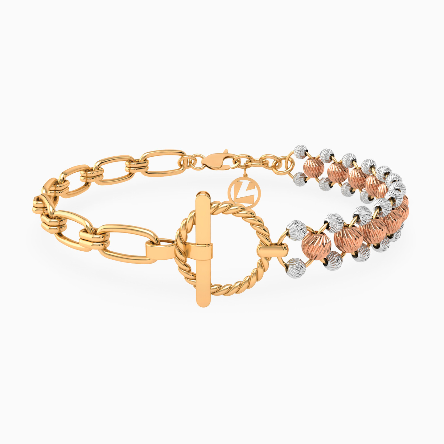 Link and loop your way through the day with this beautiful 21-karat yellow gold chain bracelet from L'azurde Gold. On one side, sleek rectangle-shaped links, connected by dual clips, create a modern and captivating design. The flip side features dainty circular frames connected to each other by a substantial textured rose gold bead forming the length and is adorned with textured white gold beads on each end. At the heart, a beautiful braided circular frame with a toggle clasp-like design connects both sides, adding a touch of sophistication to this chic and fun accessory.