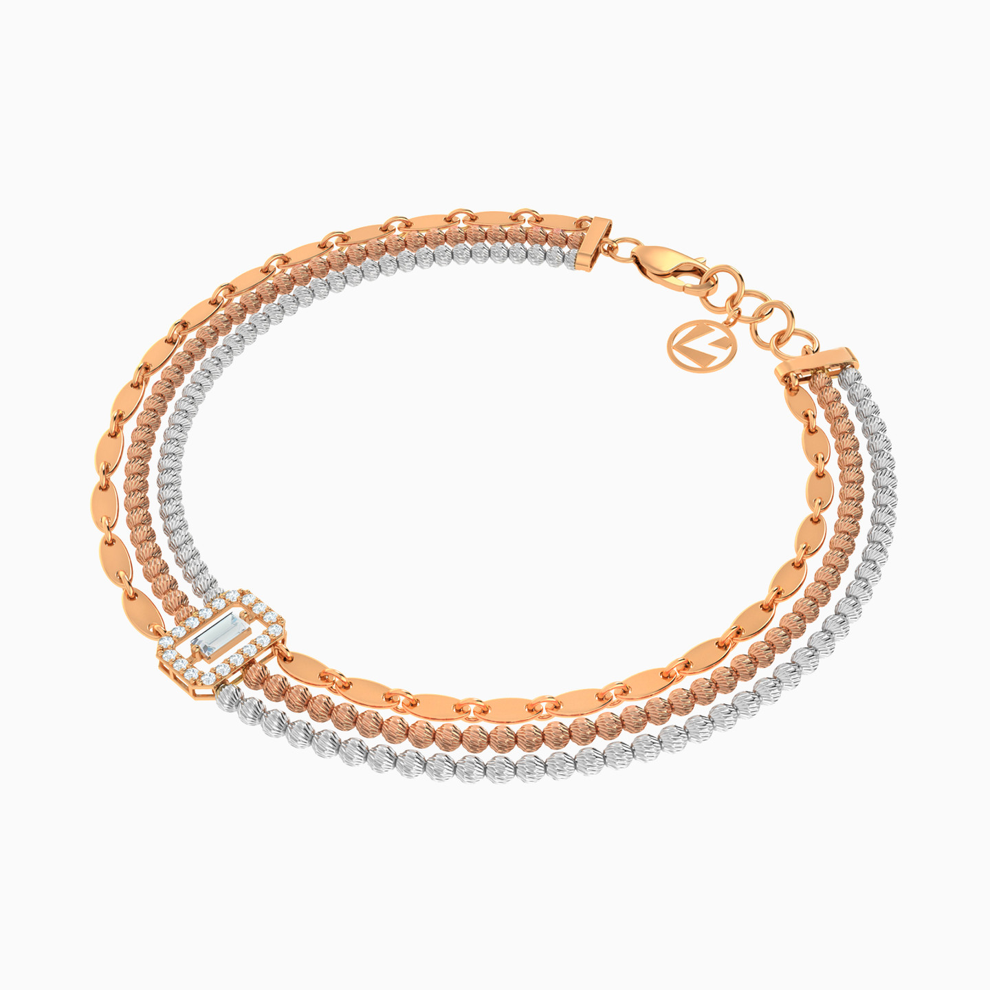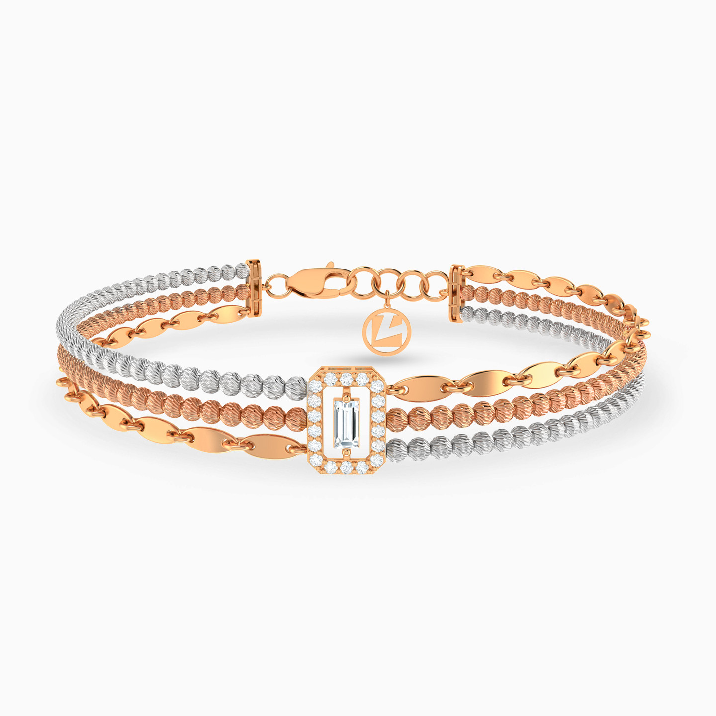 Make an eye-catching statement with this glamorous chain bracelet from L'azurde Gold. It features three exquisitely crafted layers, the middle layer comes adorned with textured rose gold beads, creating a stunning contrast against the shimmering white gold beads on either side, while the luxurious oval-shaped links in 21-karat yellow gold add a touch of timeless elegance. At the heart of this bracelet, a dazzling hexagon-shaped centerpiece, framed by radiant round cubic zirconia and a captivating rectangle-shaped cubic zirconia nestled in the center, makes a bold and sophisticated statement that will leave every onlooker in awe of your impeccable taste.