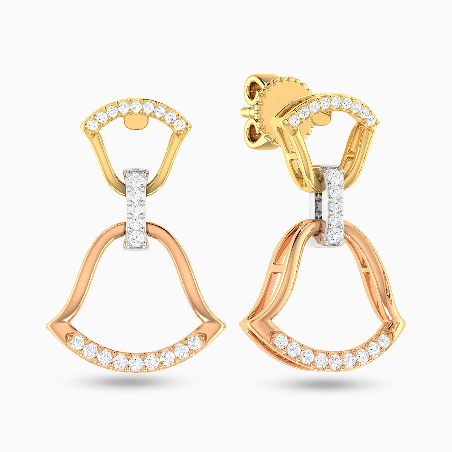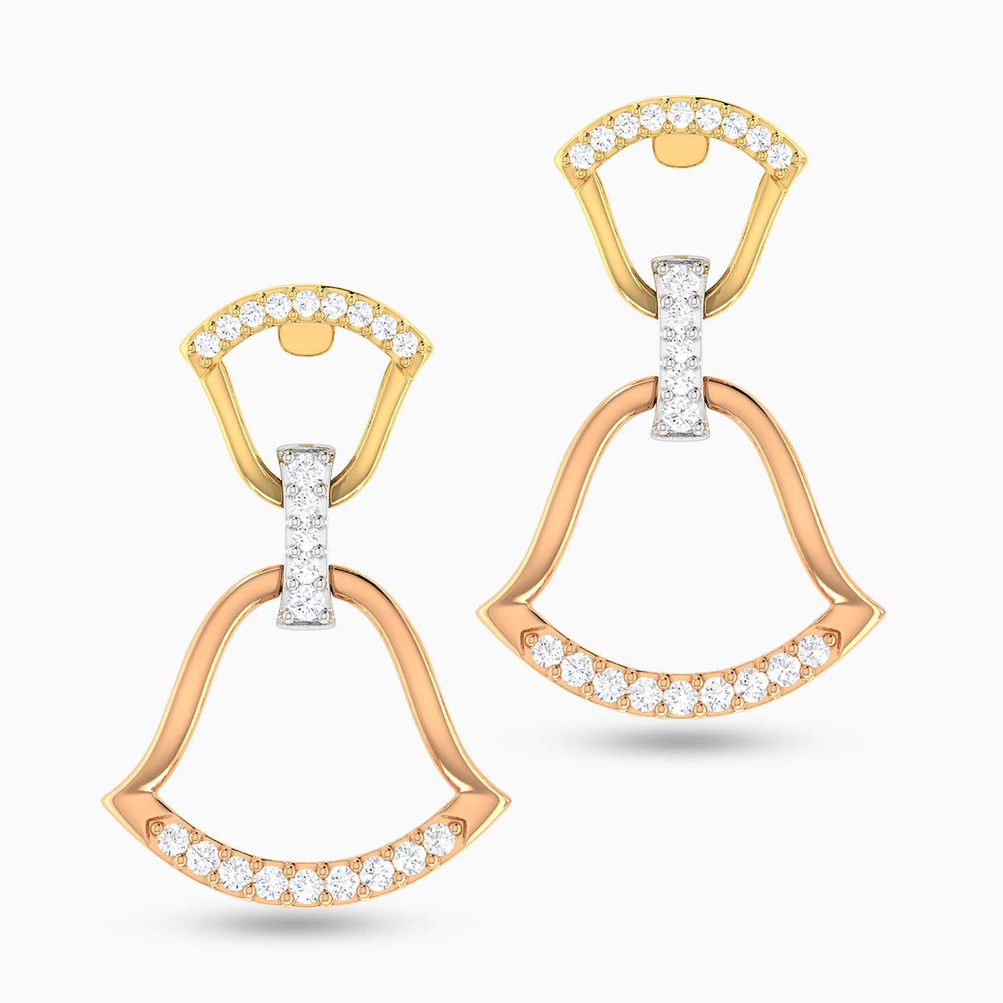 You'll shine when wearing these gorgeous diamond drop earrings from L'azurde Diamonds. A beautiful combination of 18-karat yellow, white and rose gold, these stunning earrings shimmer with brilliant cut diamonds on a double bell-shaped design. These statement-making earrings have a matching pendant for a captivating look to dress up any occasion.