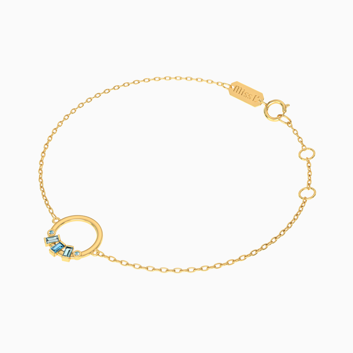 This chain bracelet by Miss L' is for the minimal lover! Crafted from 18-karat yellow gold, it features a dainty chain and a circular frame in the center adorned with three baguette-shaped colored stones and a single round-shaped colored stone flanked on either side. The blue hues of the stone beautifully compliment the yellow gold body. Style this trendy and stylish piece with your everyday ensemble.