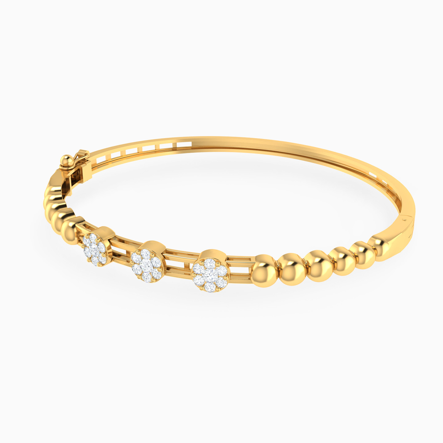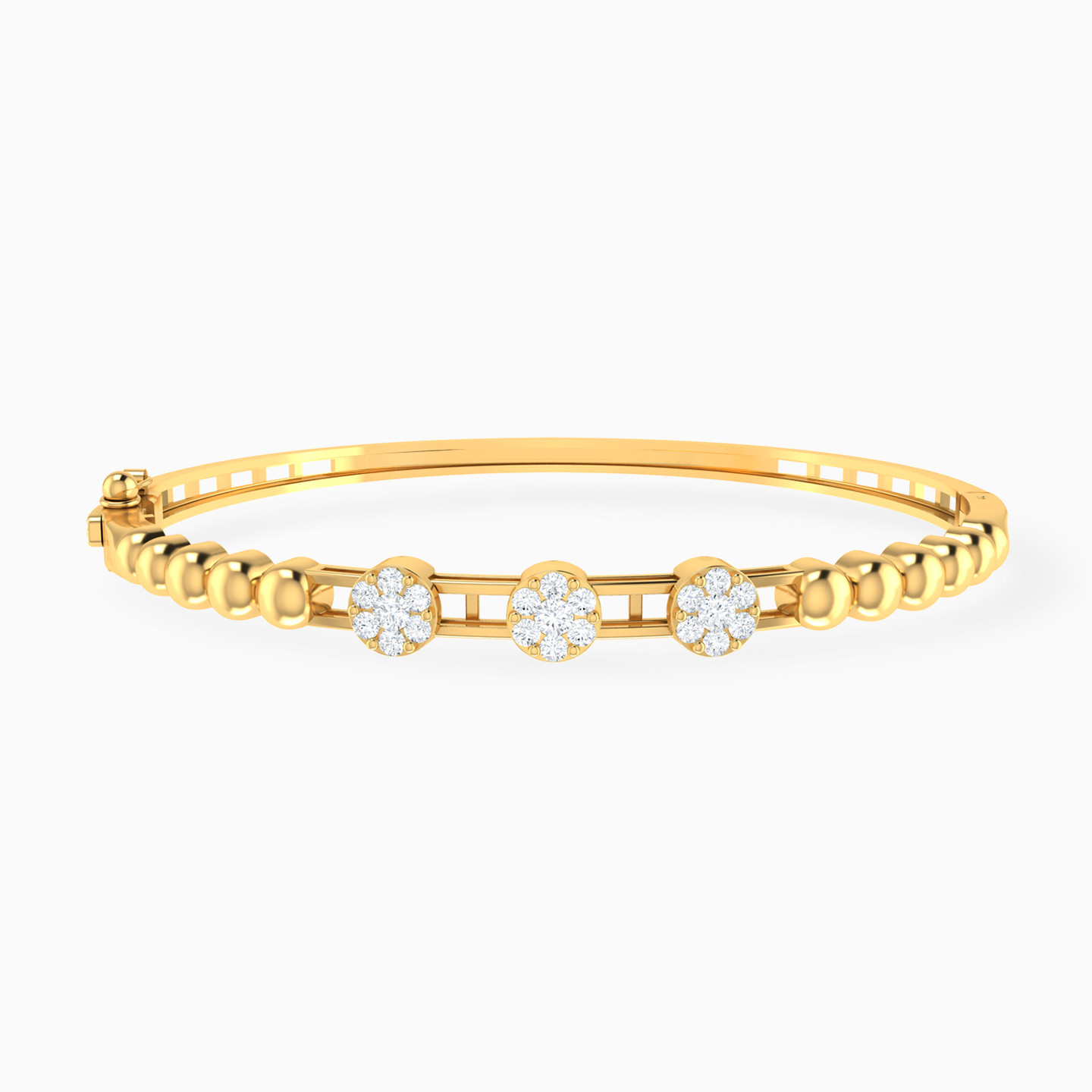 Elevate your wrist game with this 18-karat yellow gold bangle bracelet by L'azurde Gold - a garden of glamour for your arm! At its heart, three stunning cubic zirconia flowers bloom, each perfectly spaced on a base of two sleek gold bands, creating a symphony of sparkle and style. To add a touch of whimsy, beautiful round beads flank this floral centerpiece, making it a bracelet that's as delightful as a stroll through a beautiful garden.