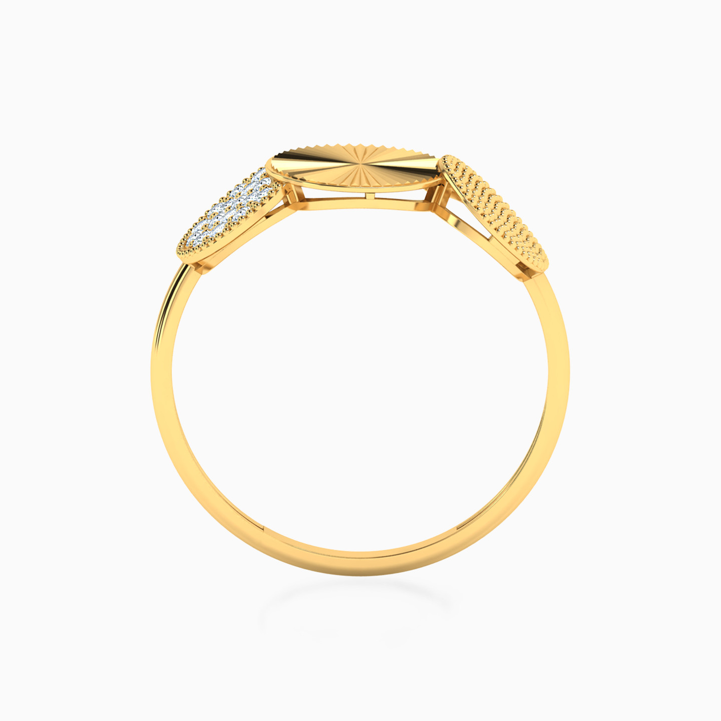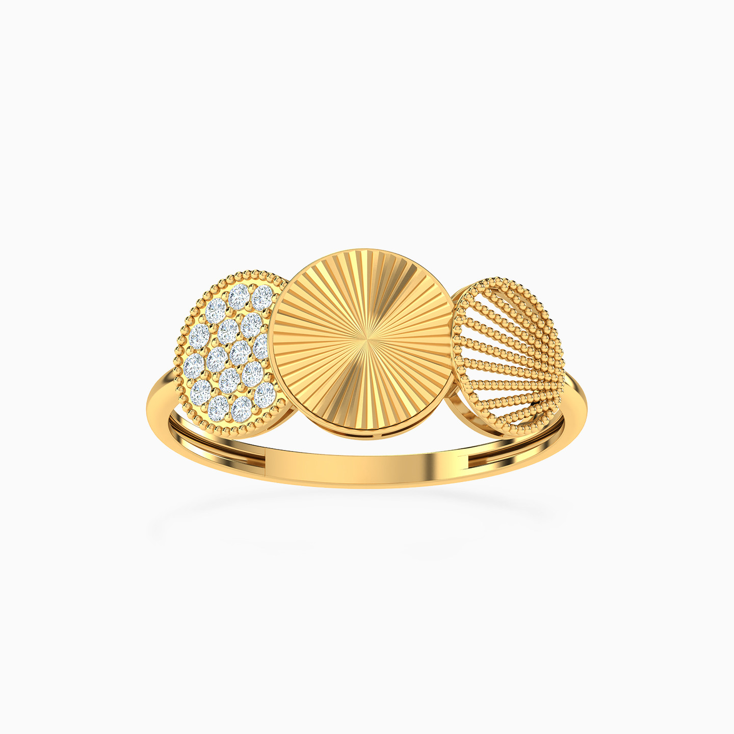 A dazzling trio by L’azurde Gold to up your style game! This stunning statement ring features three circular discs - one studded with prong-set cubic zirconia, another radiating with beautiful ribbed lines and the last one with precisely detailed lines of gold beads. All of this shines bright in an 21-karat yellow gold body. Wear this gorgeous ring when you need to make your presence felt.