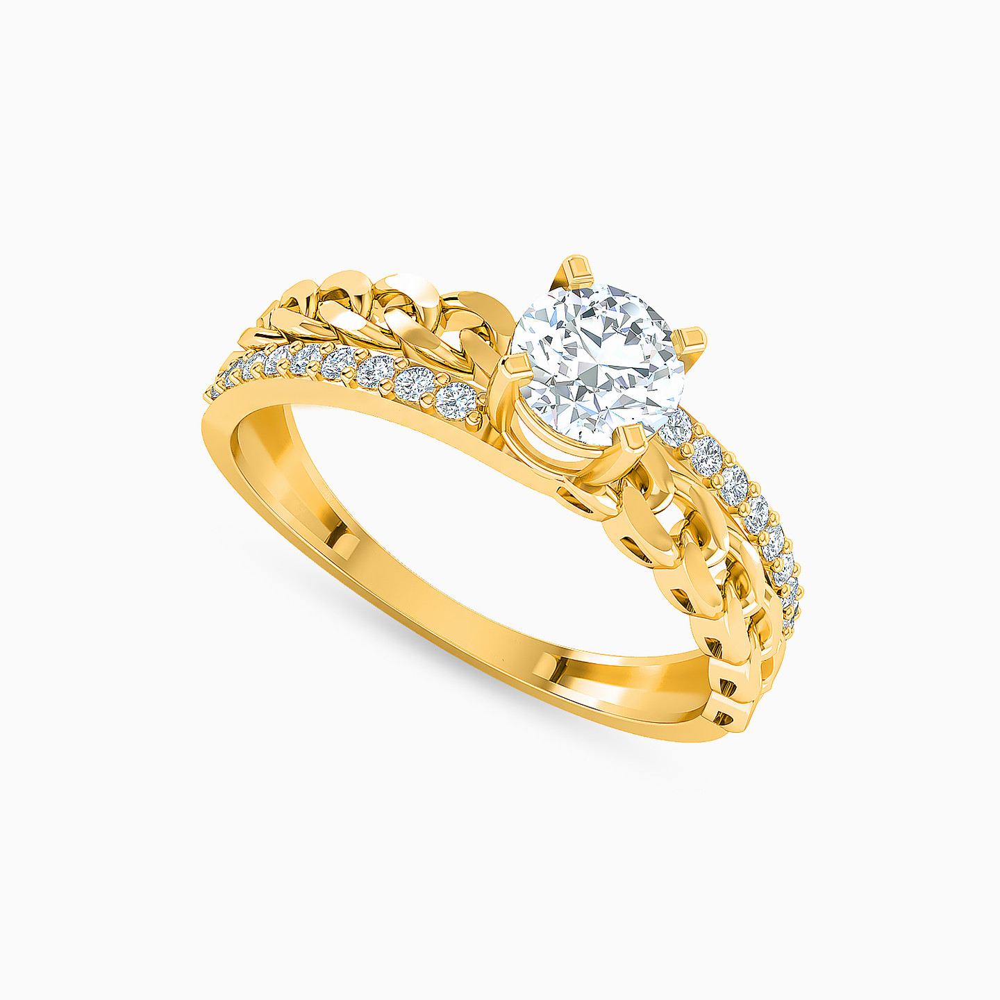 Building up on the classic design, this piece from L'azurde Gold brings in a hint of contemporary appeal with its chain link band. The center stone, complemented with petite stones on the band, make it a wonderful choice as a wedding band or engagement ring too.