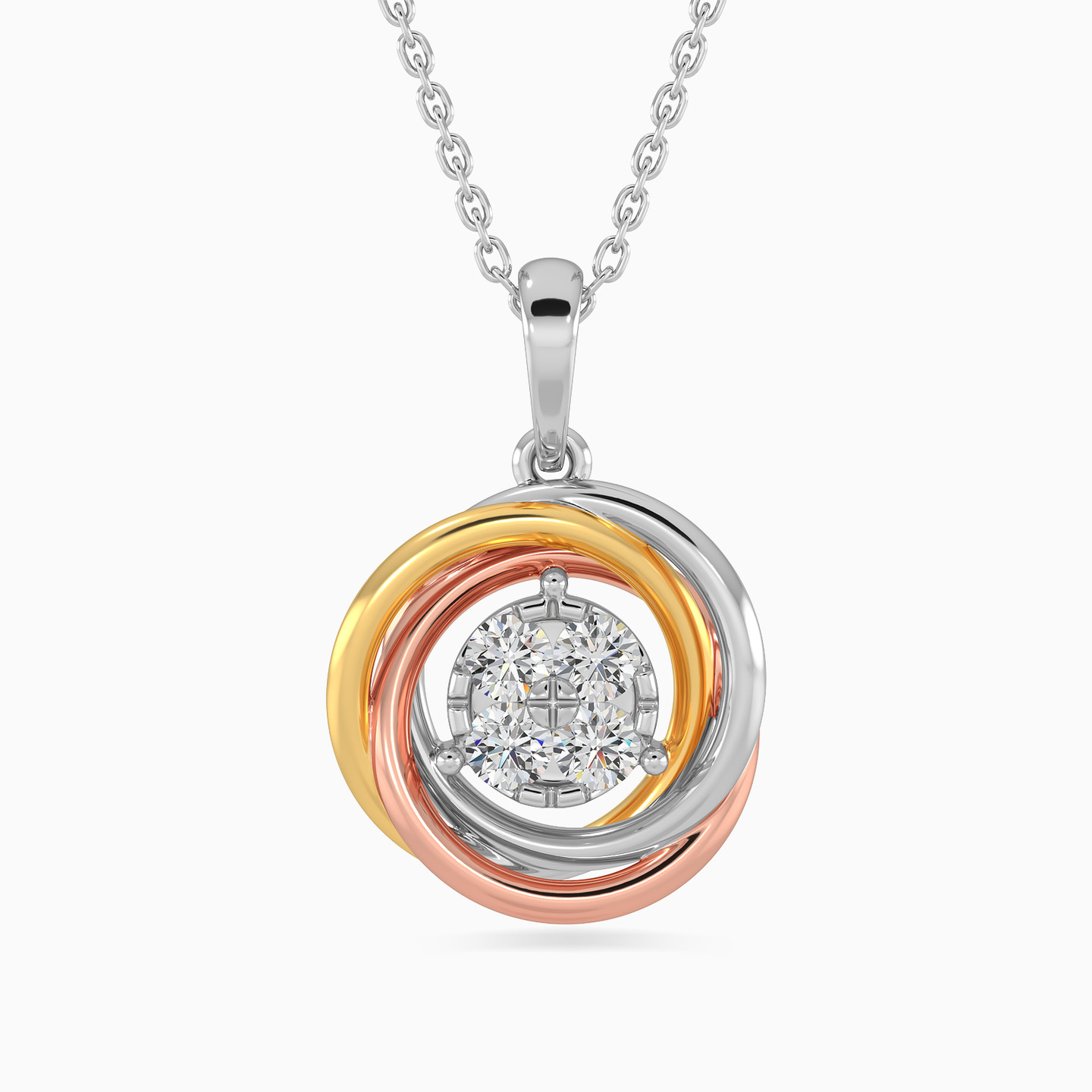 This 18-karat white gold pendant necklace from L'azurde Diamonds is a captivating embodiment of unity and elegance. It showcases a pendant made of three interconnected circular frames, each crafted from lustrous 18-karat white, yellow, and rose gold, symbolizing a harmonious blend of timeless beauty. At the heart of this intricate design lies a circular prong-set motif adorned with a radiant array of 0.21-carat brilliant cut diamonds, adding a touch of scintillating brilliance that effortlessly captures attention. A perfect pick to add a unique touch to any outfit.