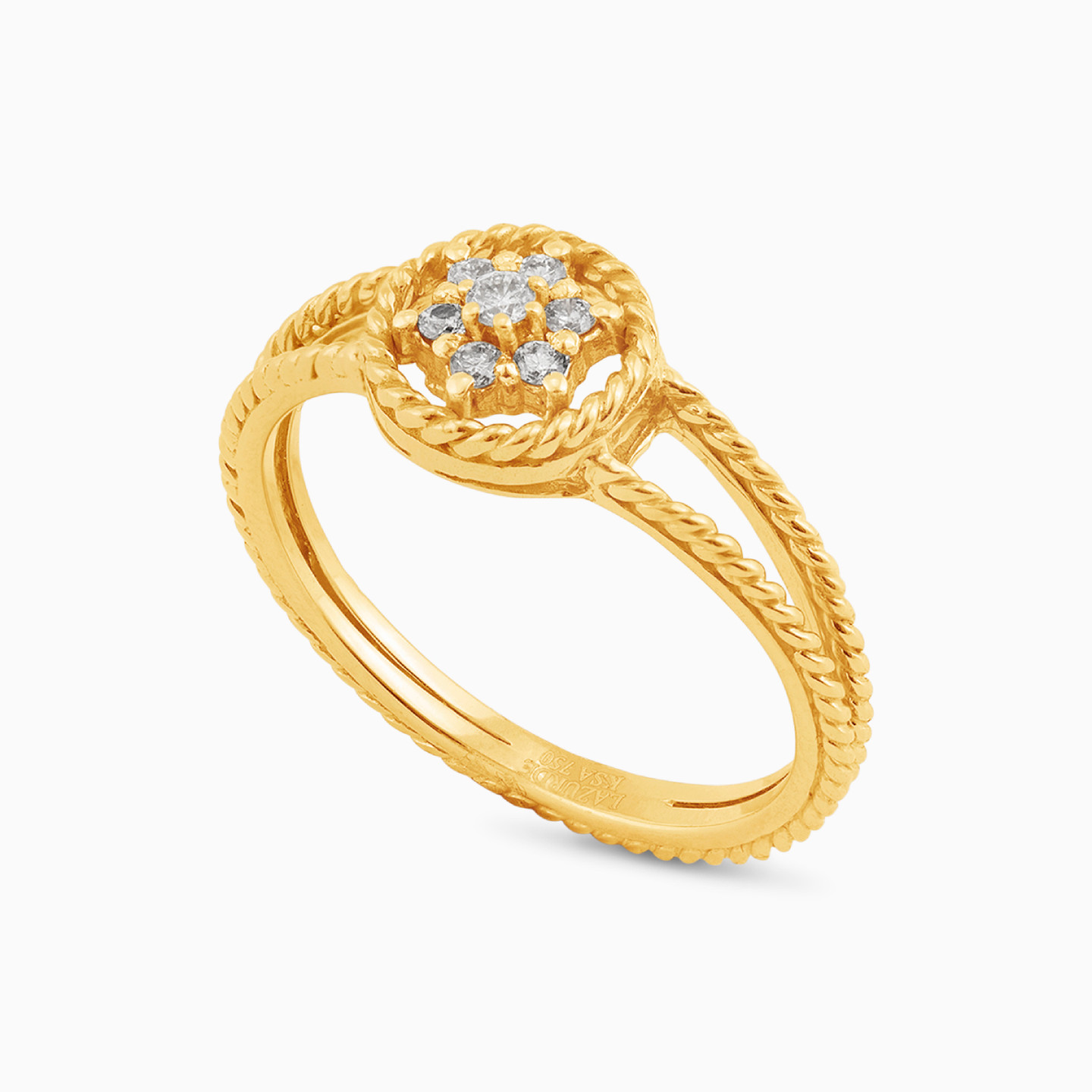 Nothing meets the simple sophistication of jewelry like this piece from L'azurde Diamonds. This ring features a rope textured band in 18-karat yellow gold and is accented with petite diamonds that sit to the center. This number will ease itself into your everyday wardrobe and will work solo or with matching accessories.