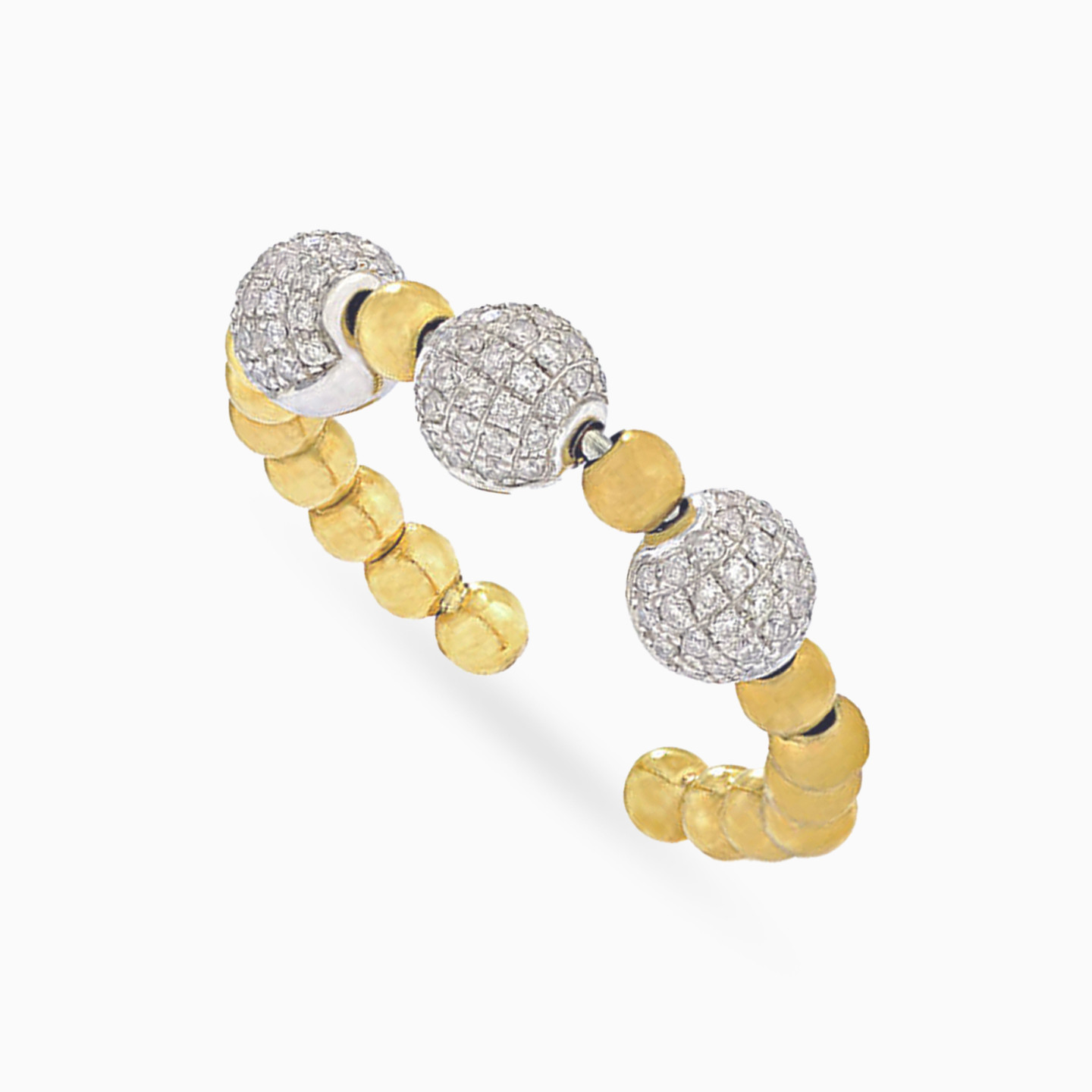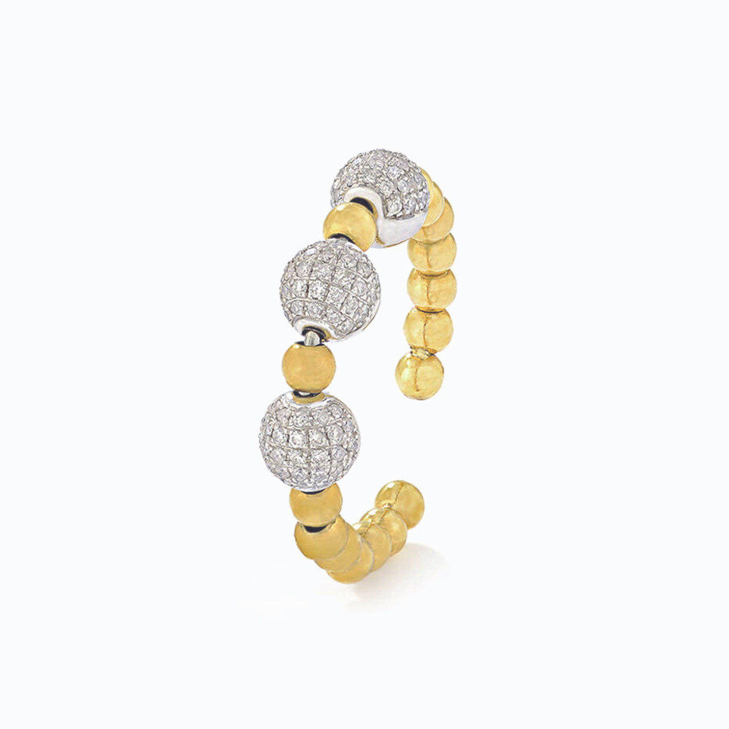 Add undeniable dazzle to your look with a ring from L’azurde Diamonds that lends effortless elegance to any outfit. With an 18-karat yellow gold beaded partial band and three 18-karat white balls dotted in 0.37-carat brilliant cut diamonds, this delightful ring is guaranteed to turn heads. We recommend making this ring a staple in your jewelry collection to wear to work, on weekends and for every social soiree you attend.