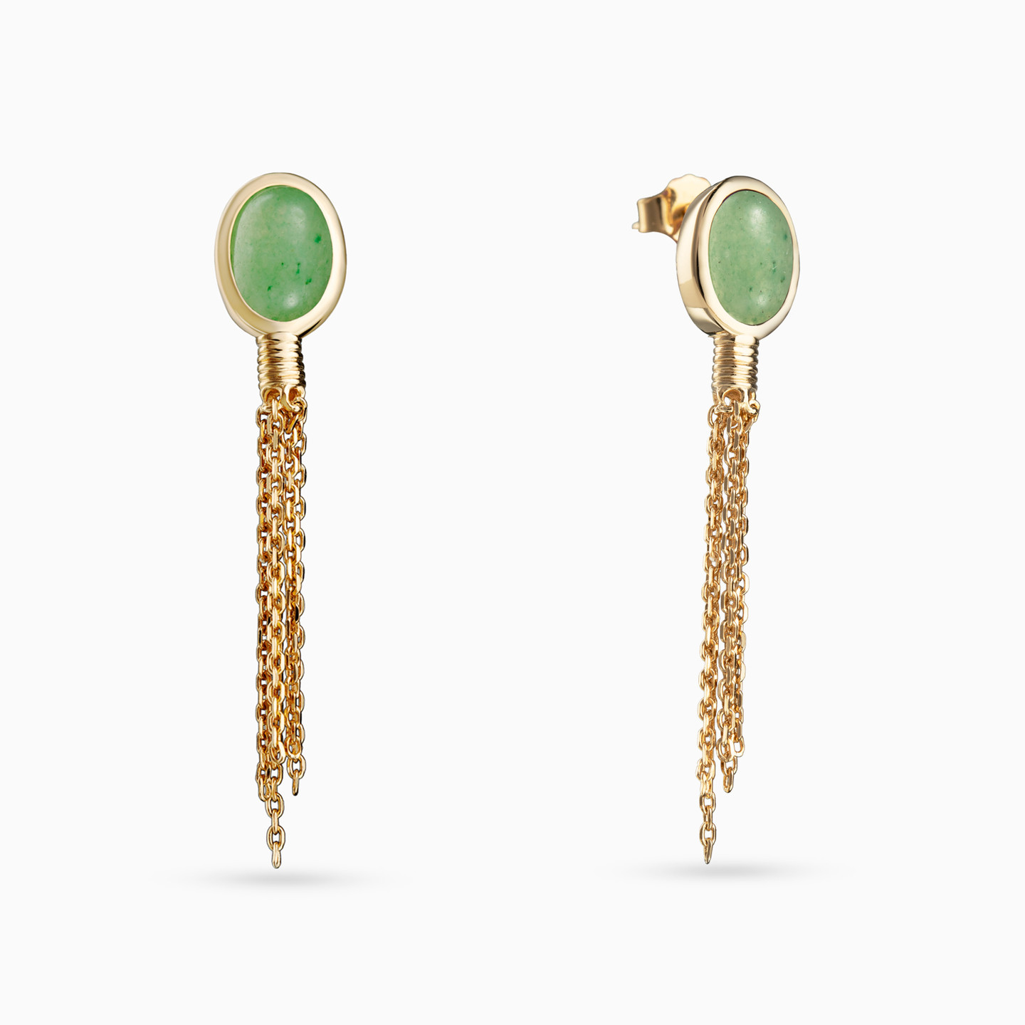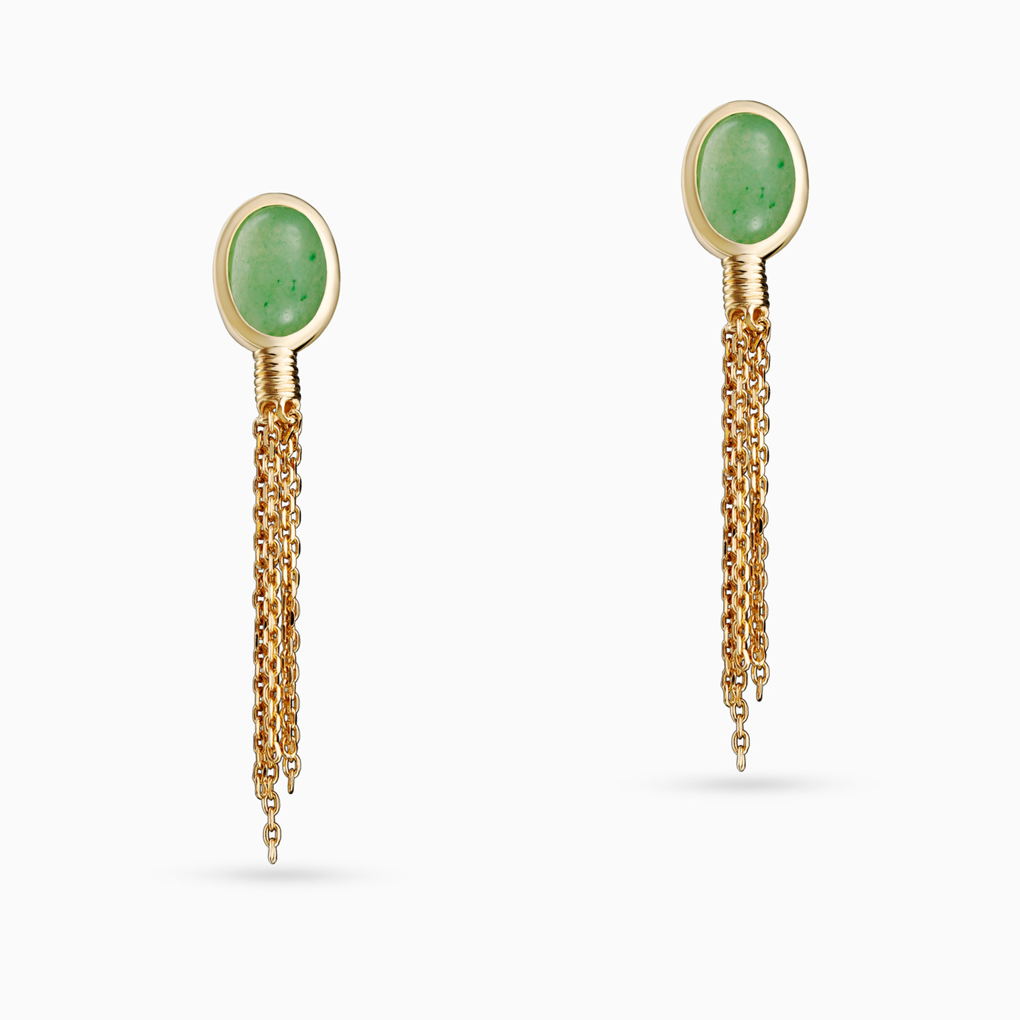You're sure to be the queen of the evening with this incredible pair from Waves. Finished with 18-karat yellow gold plating, these ear drops are studded with a green aventurine quartz stone that drops into a cluster of tassels. Thanks to its soothing color, this pair will transition with ease from day to evening.