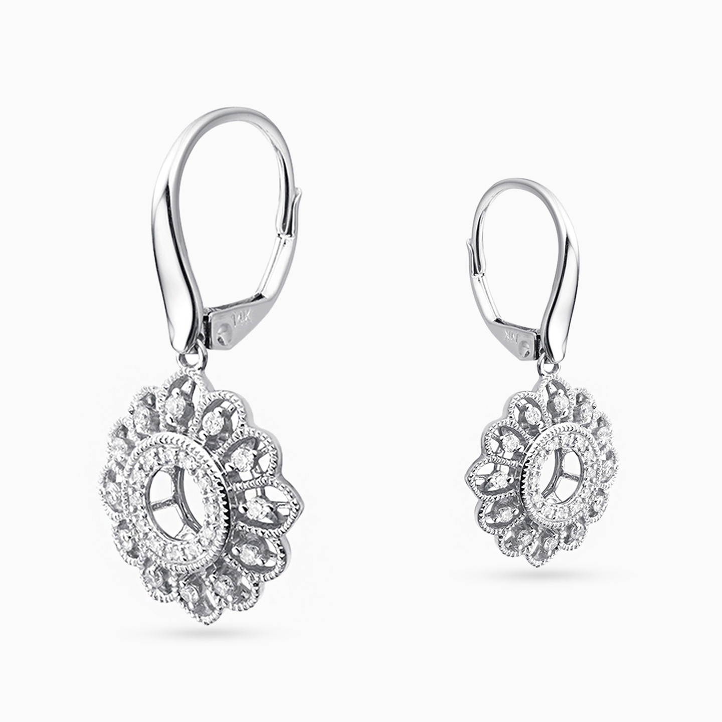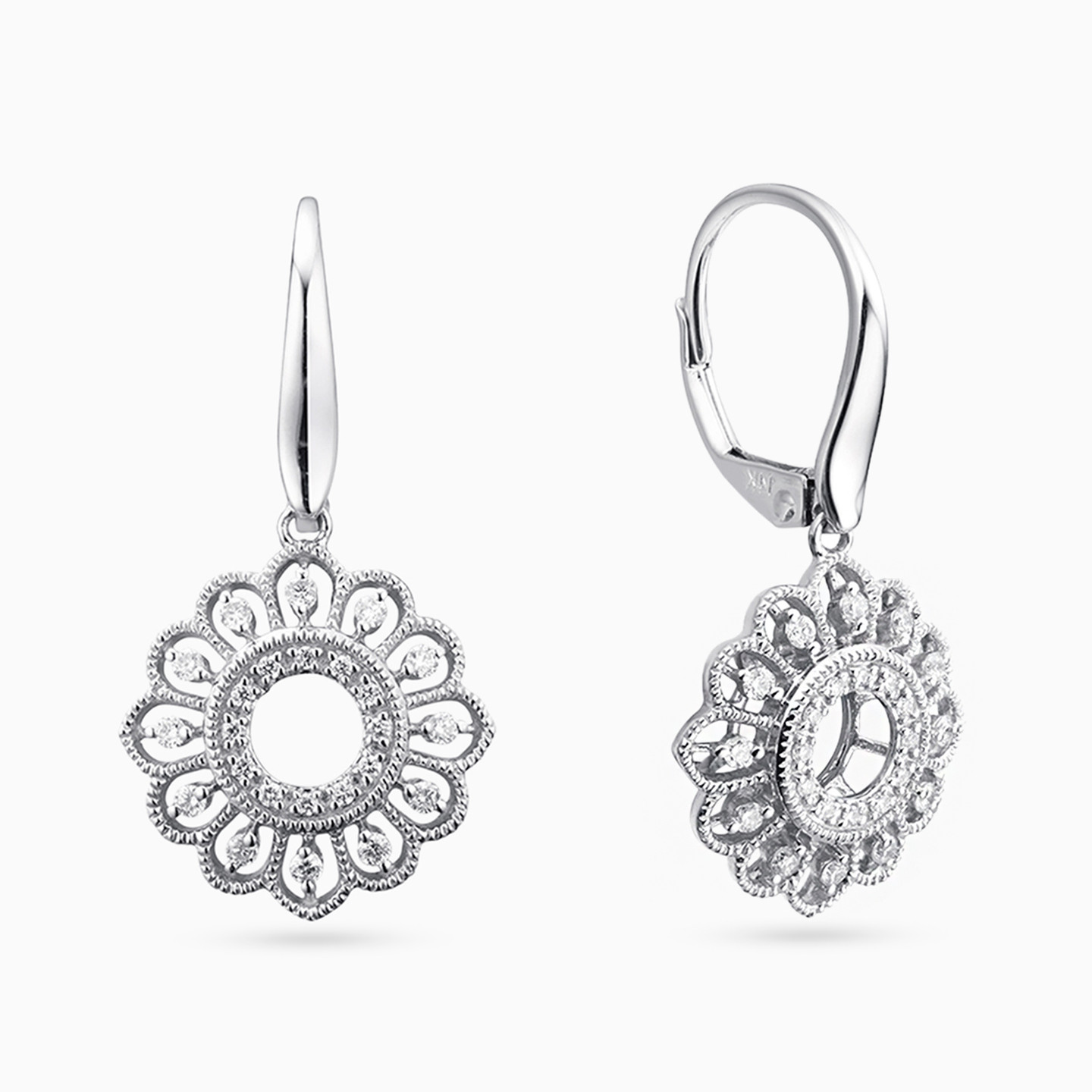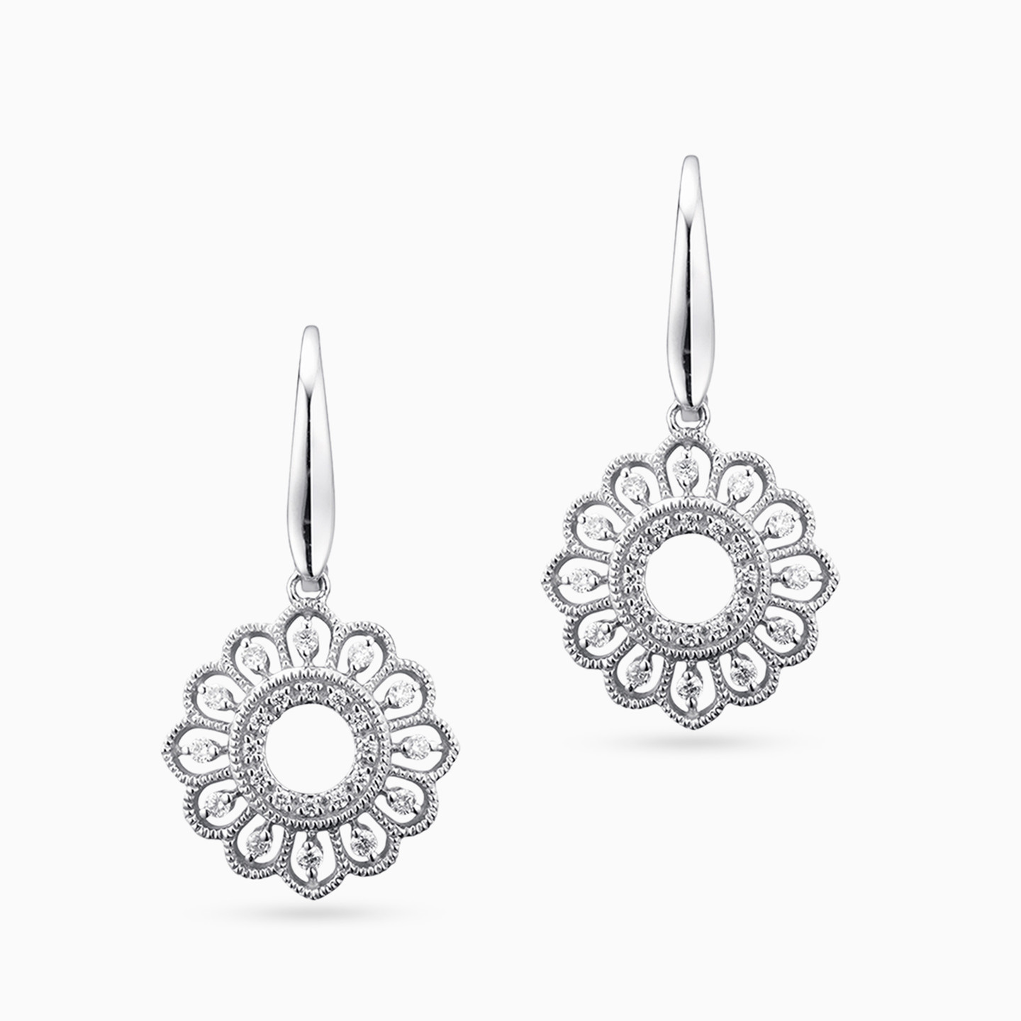 An exquisite pair of 18-karat white gold drop earrings from L'azurde Diamonds, a true testament to intricate artistry and timeless elegance. These earrings boast a graceful fish hook loop that delicately dangles a stunning flower drop. At the heart of this captivating bloom, a diamond-studded circle radiates with brilliance, framed by intricate braiding and adorned with meticulously crafted petals, each lined with round gold beads and studded with a single brilliant-cut diamond, creating a symphony of sparkle and sophistication. These earrings are a true work of art, designed to make you shine with every step you take and capture the essence of nature's beauty.