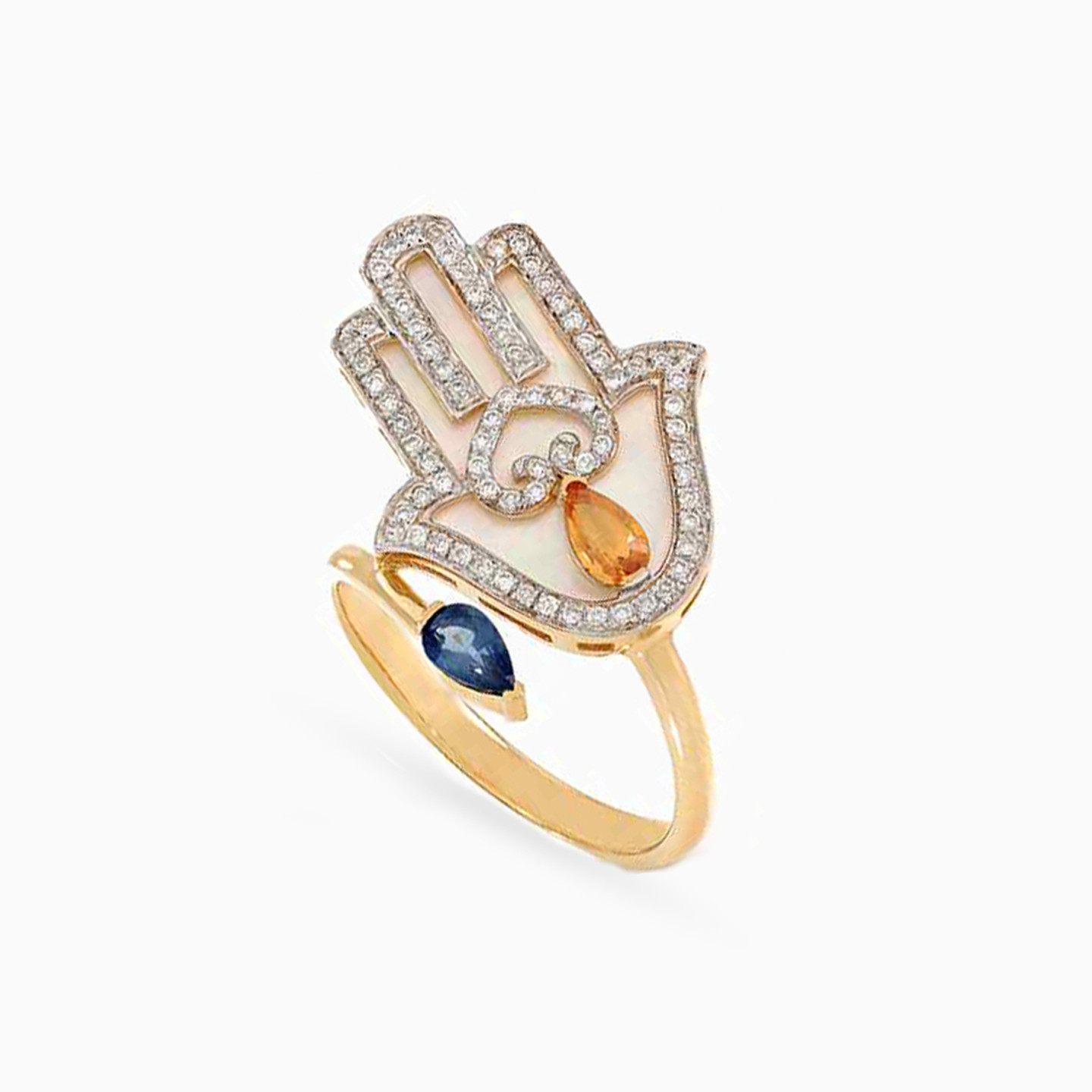 Feel confident, protected and blessed wearing this striking diamond ring from L’azurde Diamonds. A timeless aesthetic, pretty colored stones and 0.22 carats of brilliant cut diamonds give this two headed Hamsa ring its irresistible appeal. Add a dash of sparkle to your wardrobe with this 18-karat yellow gold ring that will take you from casual dinners to formal celebrations in style.