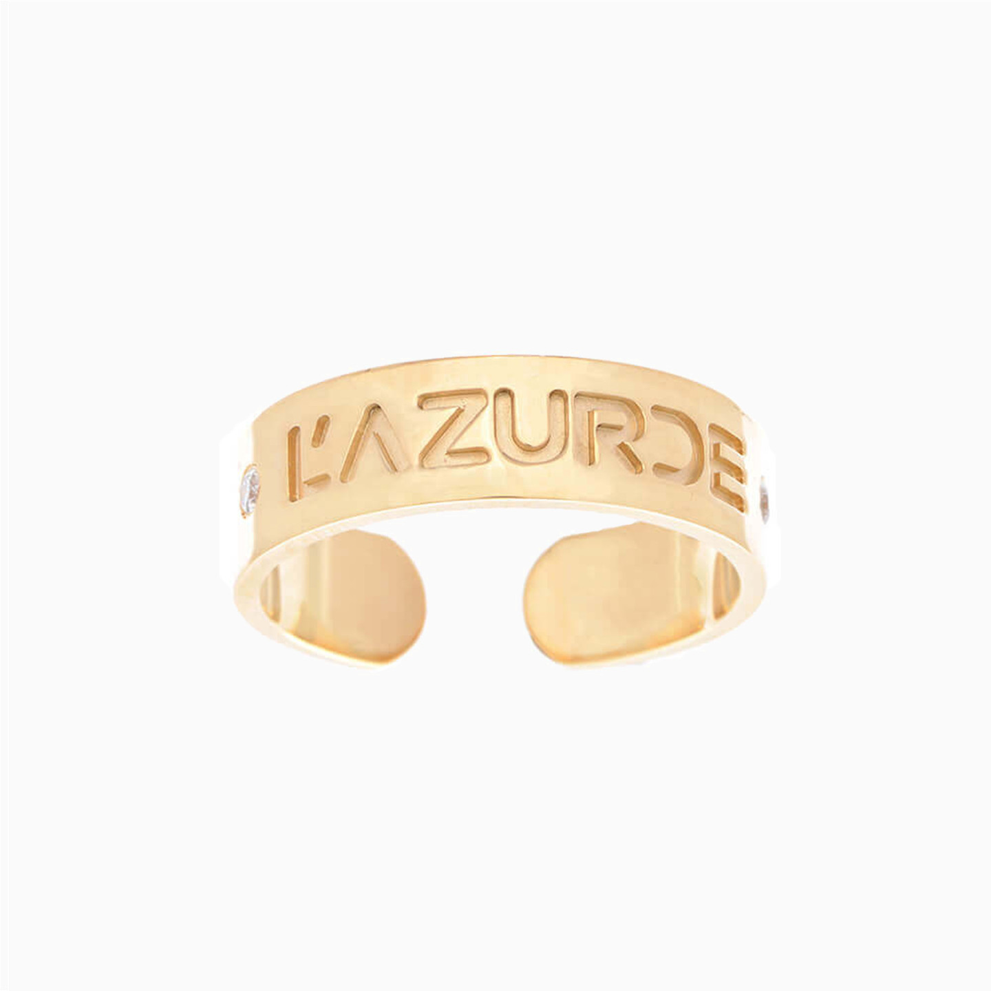 Announce your appreciation of sleek style to the world with a L’azurde statement ring in lustrous 18-karat yellow gold. This chic ring features the L’azurde name at the center, flanked by 0.06-carat diamond accents. We recommend wearing this ring for work days, date nights and weekend adventures, paired with eye-catching 18-karat yellow gold drop earrings and a gold bangle bracelet.