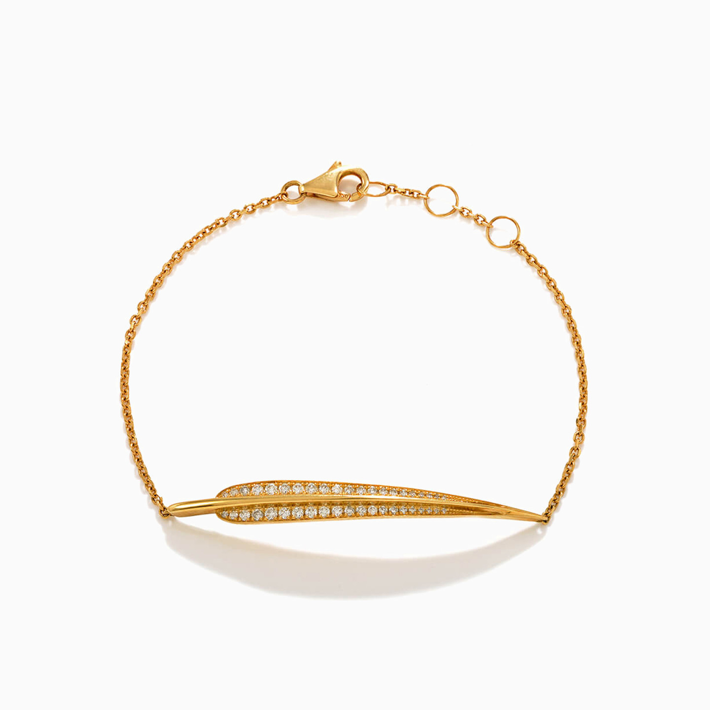 Prepare to attract attention wearing this exquisite statement of sophistication and style from L’azurde Diamonds. Sleek and lovely, this striking bracelet features a divine gold leaf lined with 0.37-carat diamonds, fixed on a chic 18-karat yellow gold chain bracelet with secure clasp. We recommend wearing this lovely bracelet to add instant shimmer to casual wear, work attire or for a formal evening with co-workers or friends.