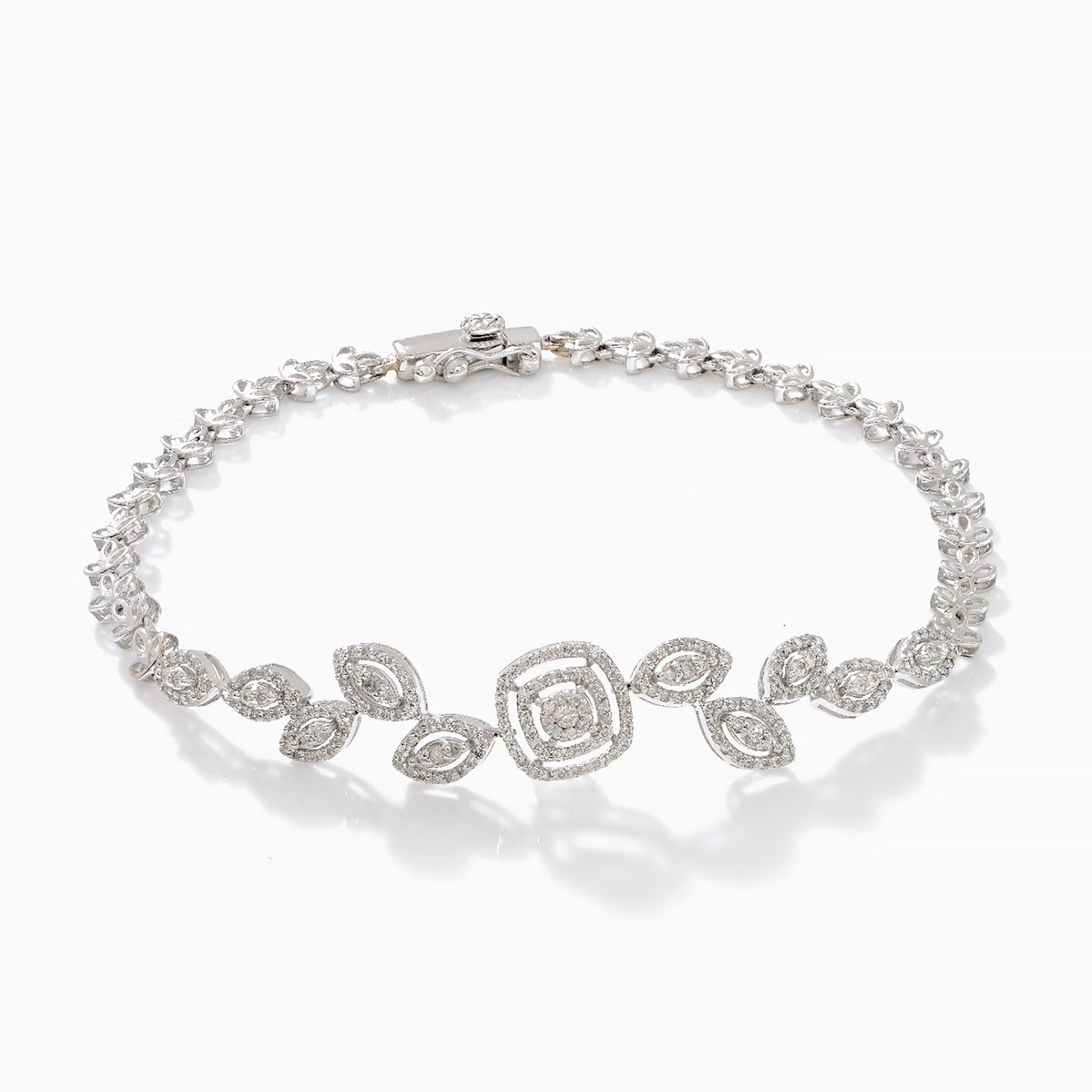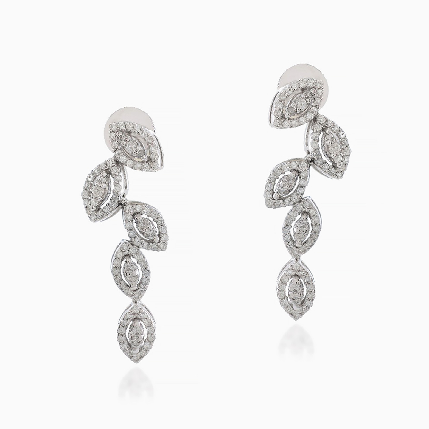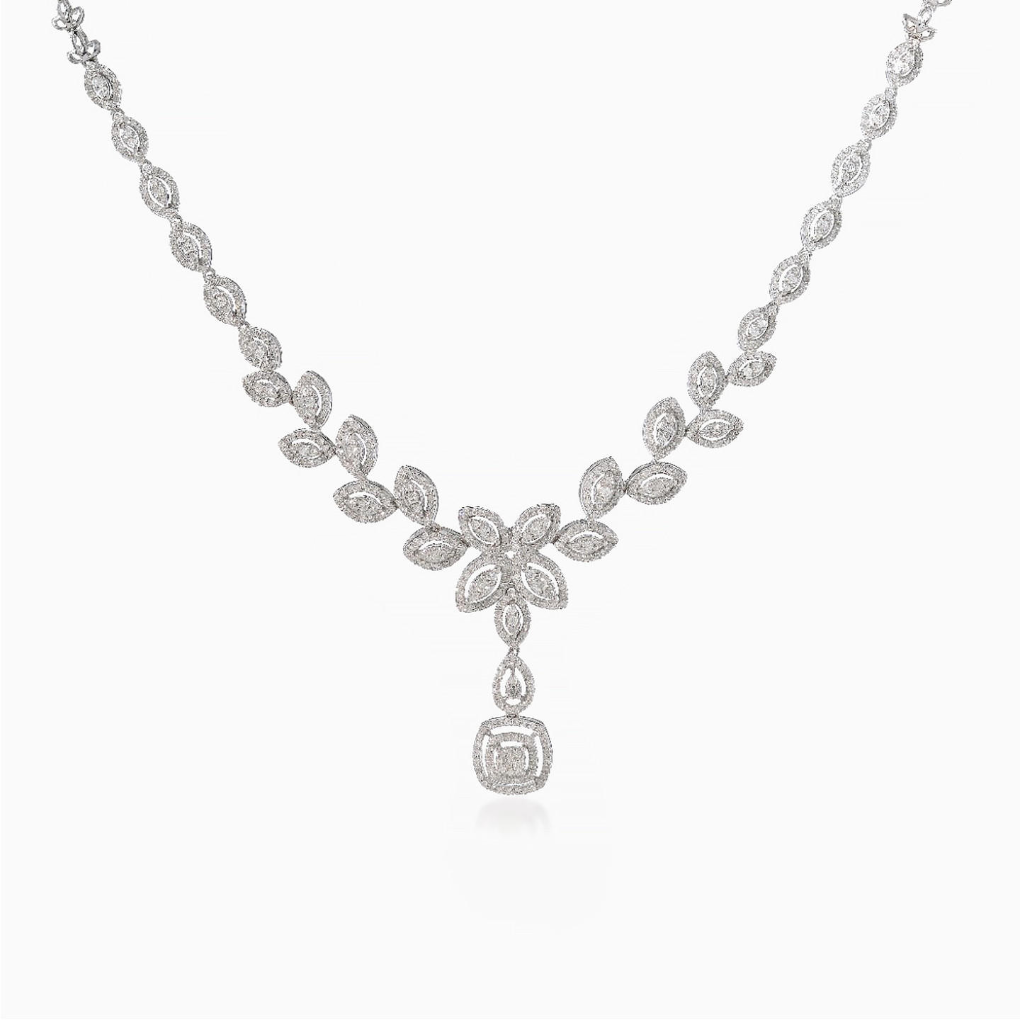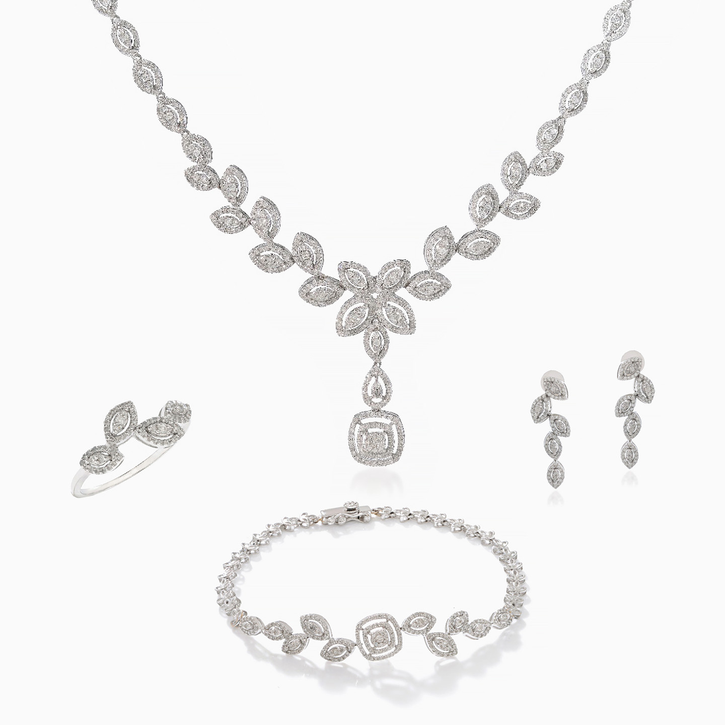 Marquise-shaped elements look like falling leaves as they dance along the design of this exquisite diamond jewelry set from L’azurde Diamonds. With 3.79-carats of brilliant cut diamonds shimmering from every angle, you’ll radiate glamour wearing this luxurious set which includes a mesmerizing diamond necklace with a stunning drop center, eye-catching diamond dotted bracelet, feminine drop earrings and an elegant ring. This is the ultimate jewelry set to wear to the most formal of occasions.