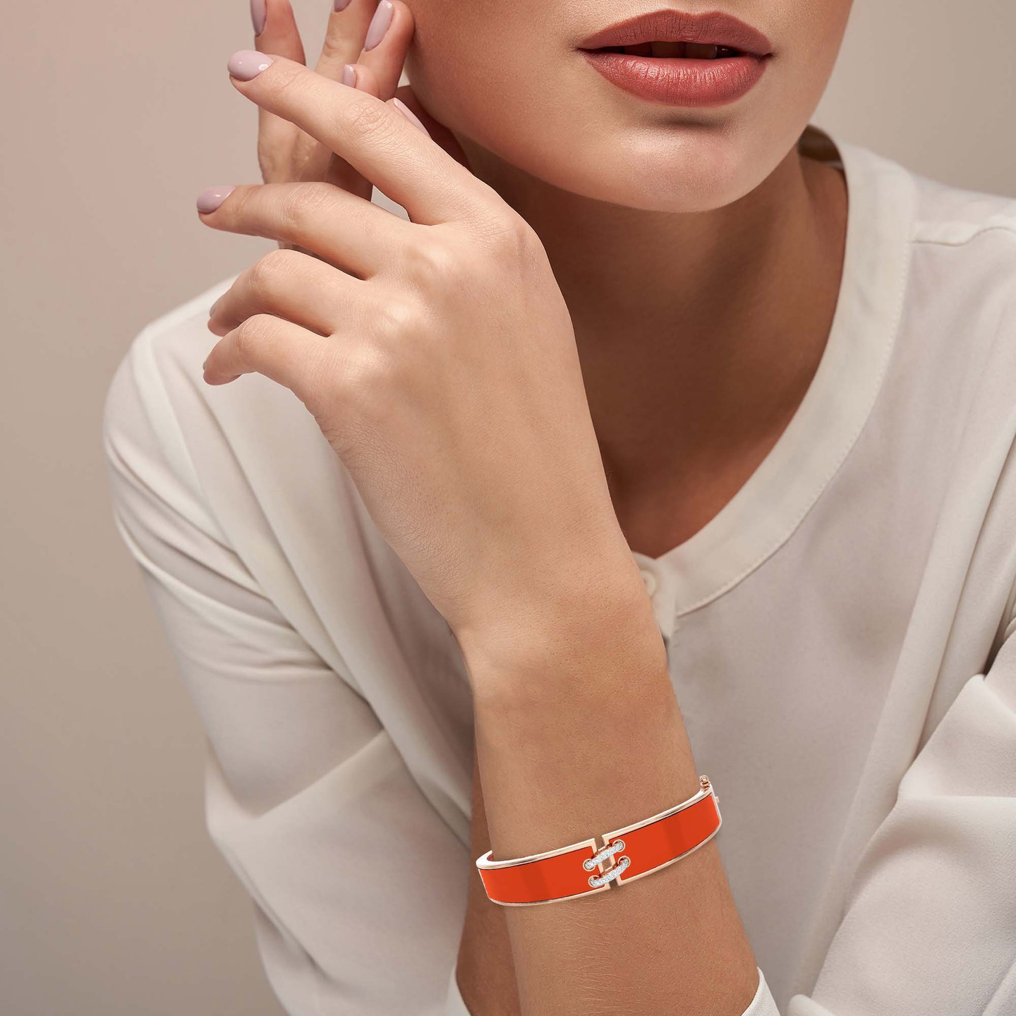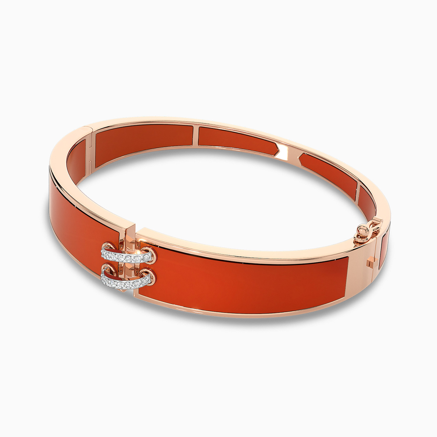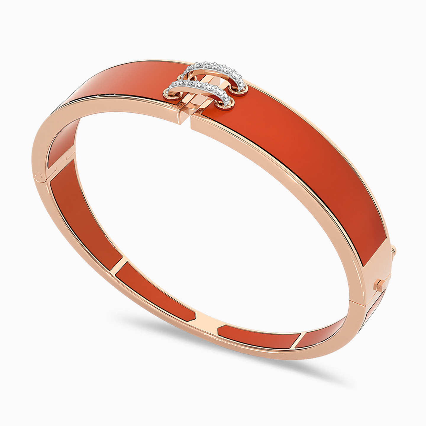 Make a statement with this 18-karat rose gold bangle from L'azurde Diamonds, a harmonious blend of asymmetry and opulence. It features a wide design that is coated with a captivating rust-colored enamel adding a rich and unique touch to this piece. At the center a loop, crafted from two layers of 0.16-carat brilliant cut diamonds, elegantly holds together both ends, creating a stunning focal point that embodies both modern sophistication and timeless allure.