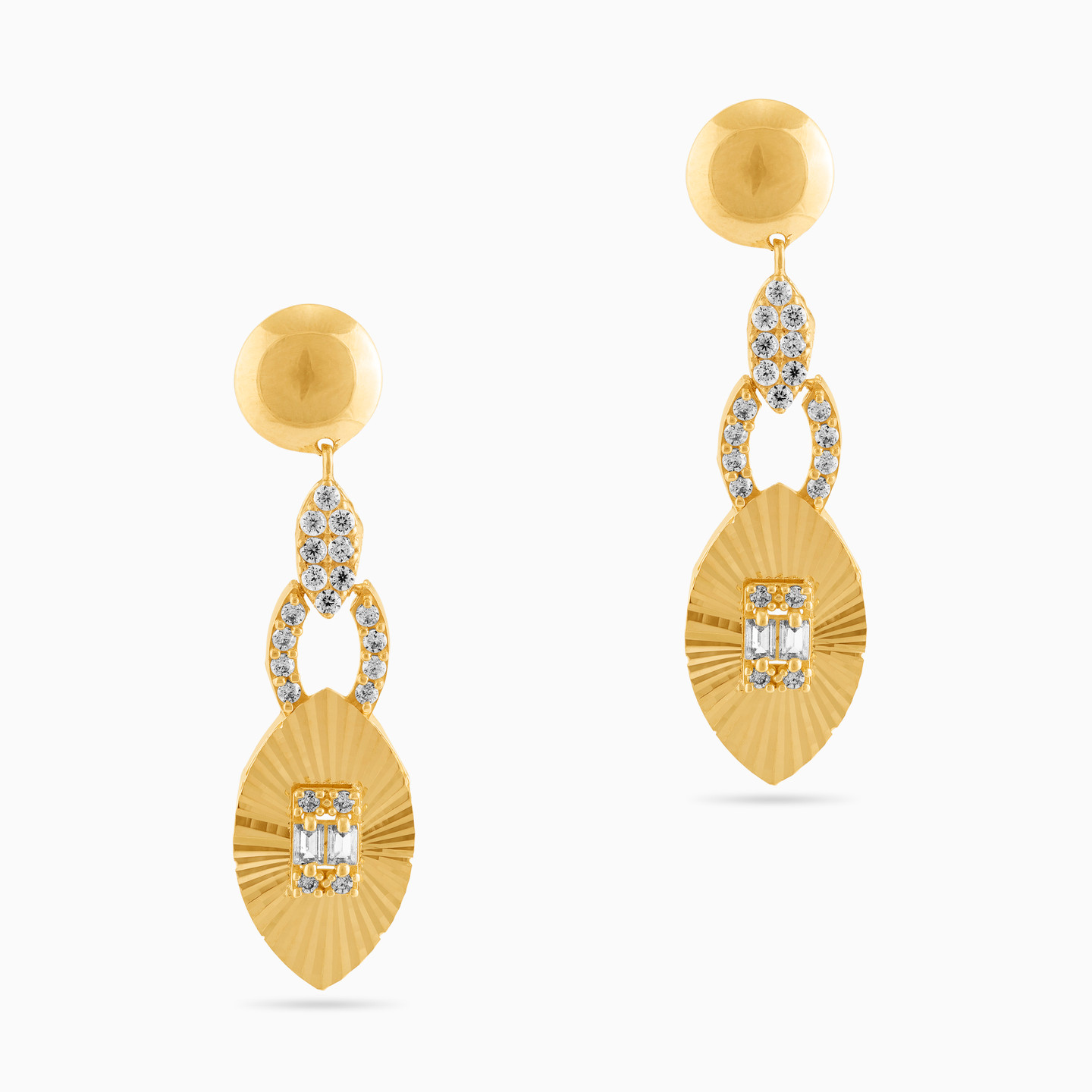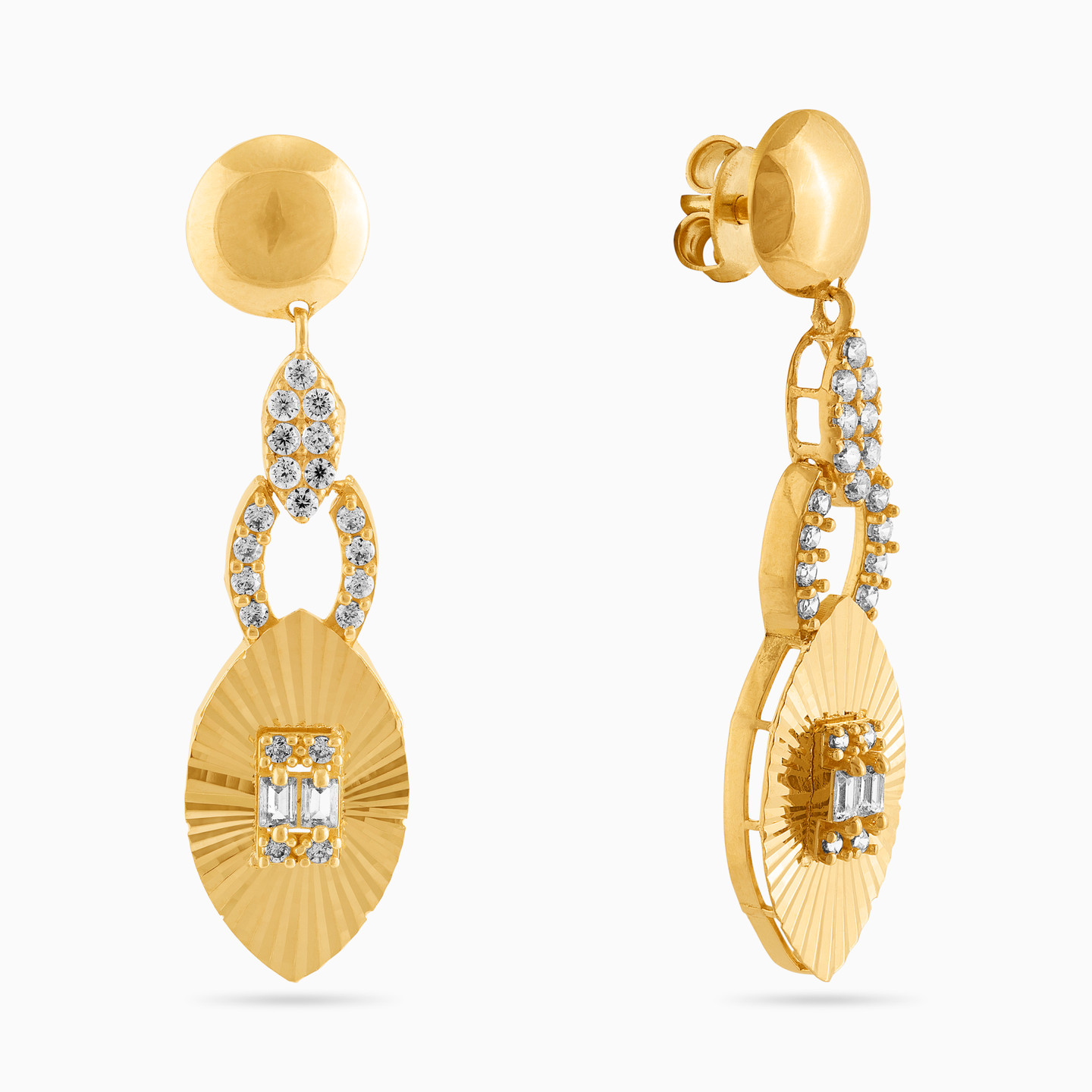 A pair of drop earrings from L'azurde Gold to make a statement at the next office party. Different shaped motifs, delicate textures, soft curves, and sparkling zirconia stones come together to create this beauty in 18-karat yellow gold. Pair these with an off-shoulder or strapless dress to show off these beauties.