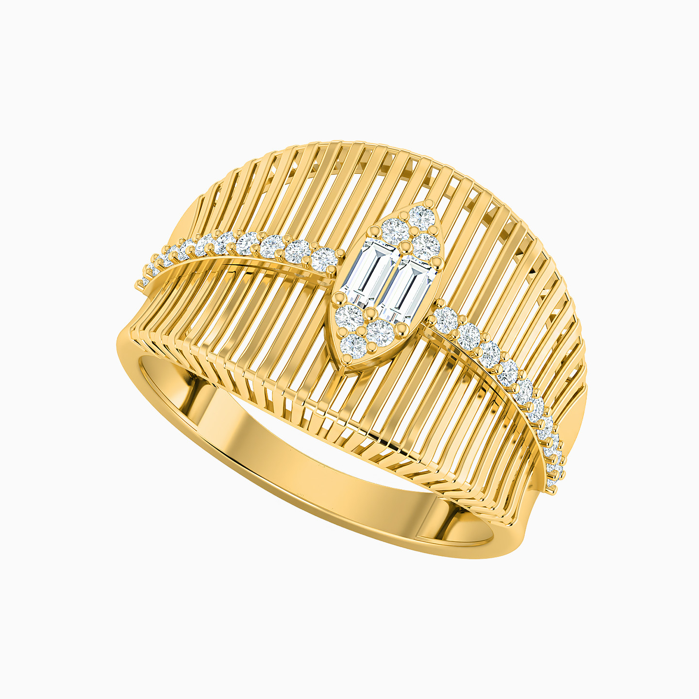 Grandeur takes a front seat in this exquisite piece from L'azurde Gold. Cast in 21-karat yellow gold with slim vertical lines, this ring is studded with sparkling zirconia stones to the center in a clean design. The perfect choice as a standalone accessory, this number will add an instant statement appeal to your look.