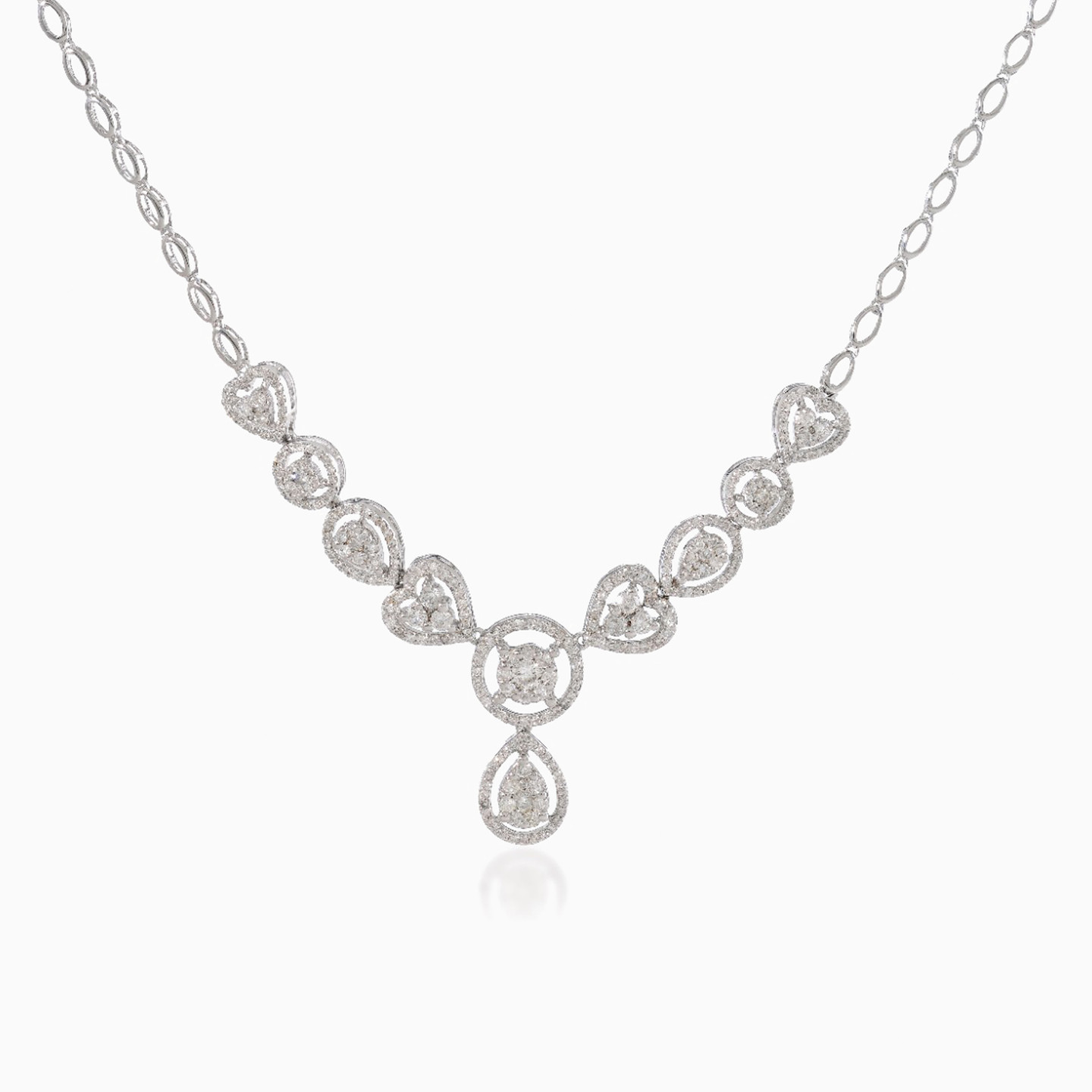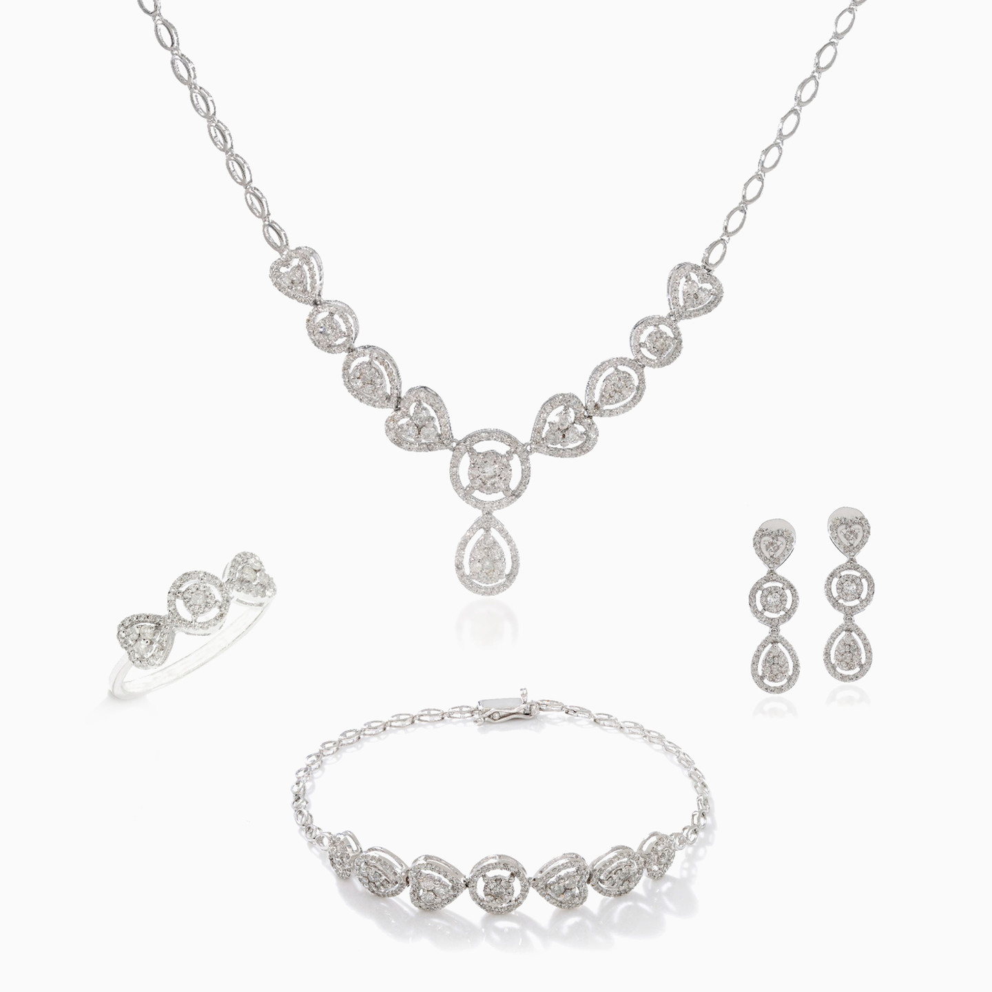 Spoil someone special with a complete set of stunning diamond jewelry from L’azurde Diamonds. Gorgeous brilliant cut diamonds in various shapes and sizes sparkle from this mesmerizing set which includes a diamond necklace, eye-catching diamond bracelet, shimmering drop earrings and captivating ring. With 2.77-carat brilliant cut diamonds set in 18-karat white gold, these pieces complete your look and put the wearer on the best dressed list.