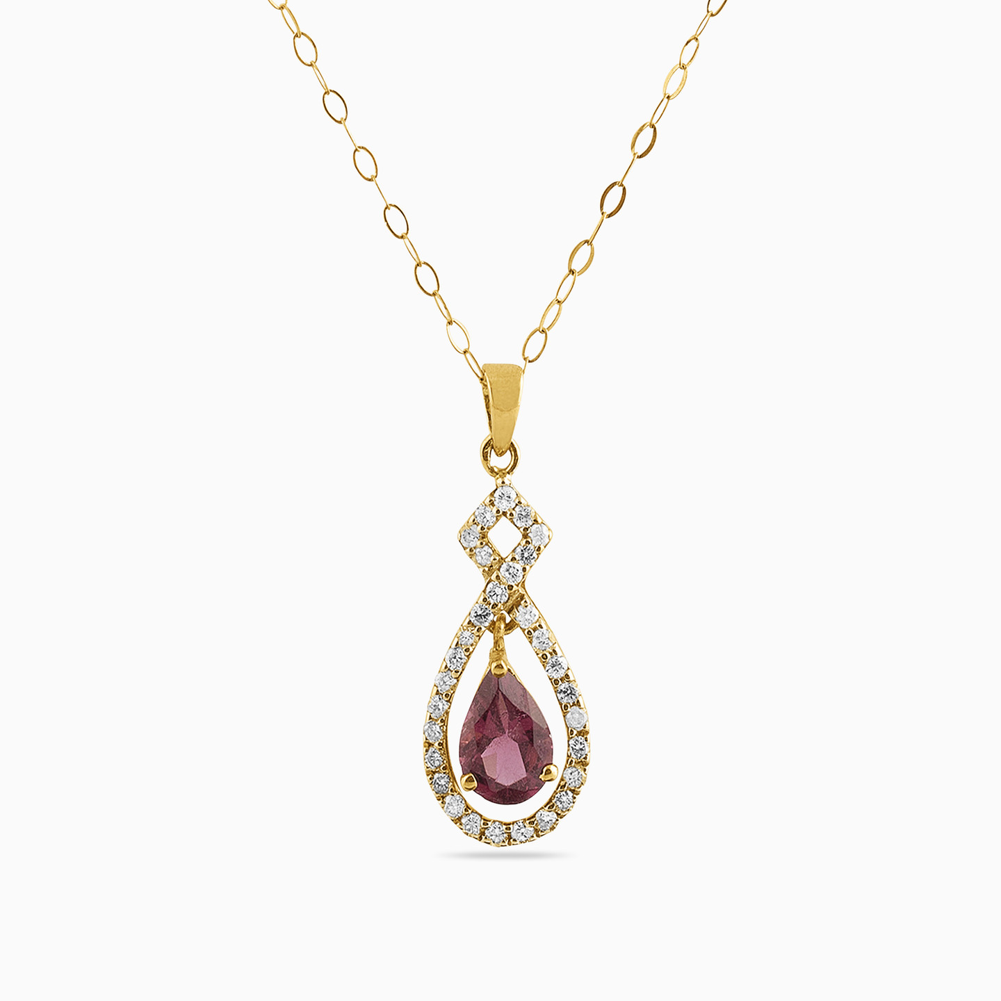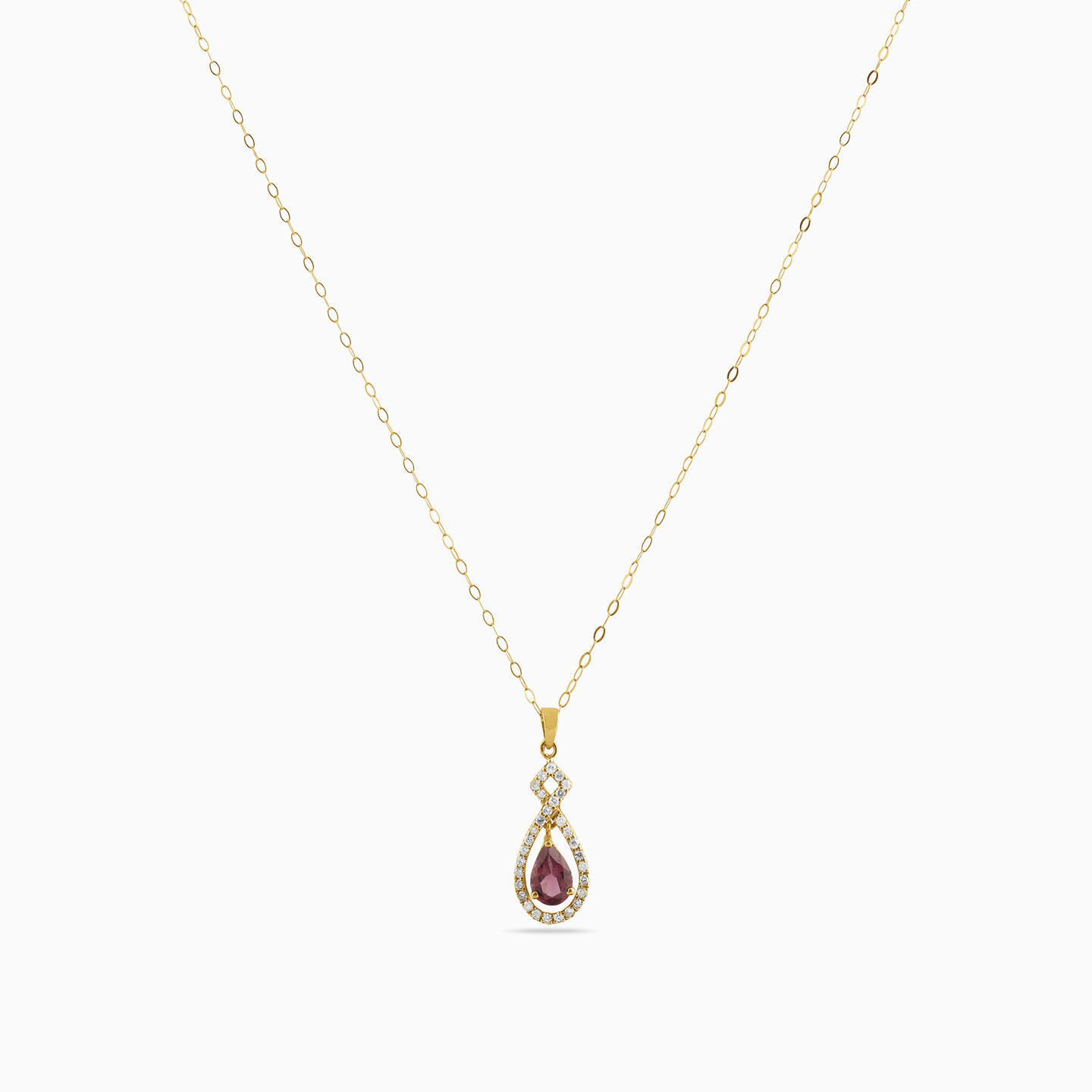 Let the world know you have the confidence to take on anything by wearing this mesmerizing 18-karat yellow gold pendant necklace from L'azurde Diamonds. This exquisite pendant features a modern infinity-style loop of 0.24-carat brilliant-cut diamonds around a stunning pear-shaped plum-colored stone at the center. Dainty yet decadent, this enchanting diamond drop pendant adds the perfect shimmering touch to your formal evening wear.