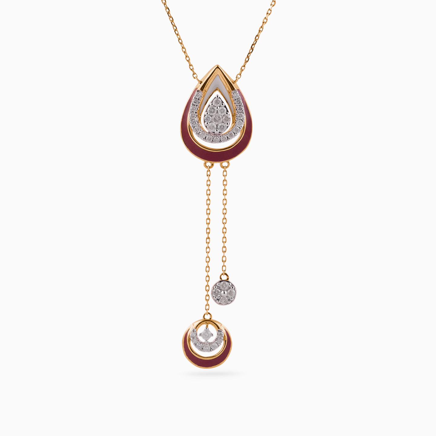 What could possibly enhance your wardrobe more than this utterly sophisticated piece from L'azurde Diamonds? The pear-shaped pendant drops into a couple of delicate tassels meticulously studded with diamonds. Suspended from a dainty 18-karat yellow gold chain, this number is worth flaunting over a plunge neckline.