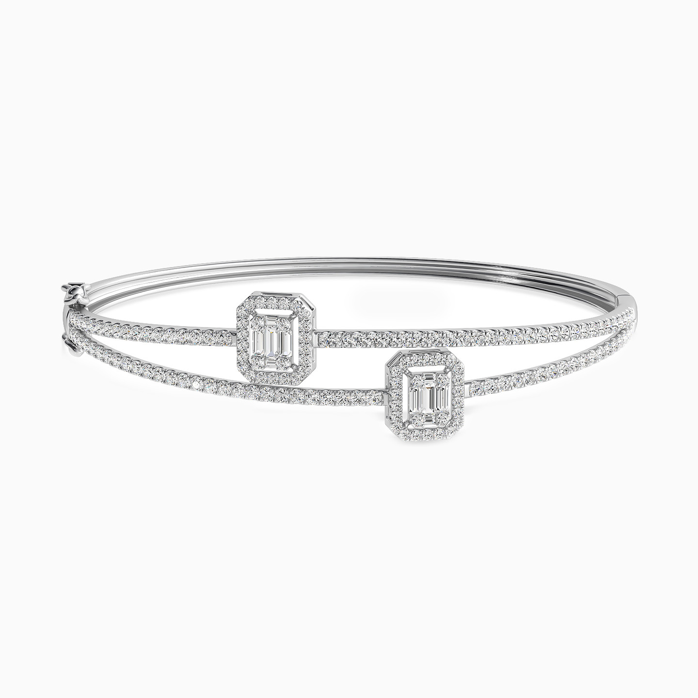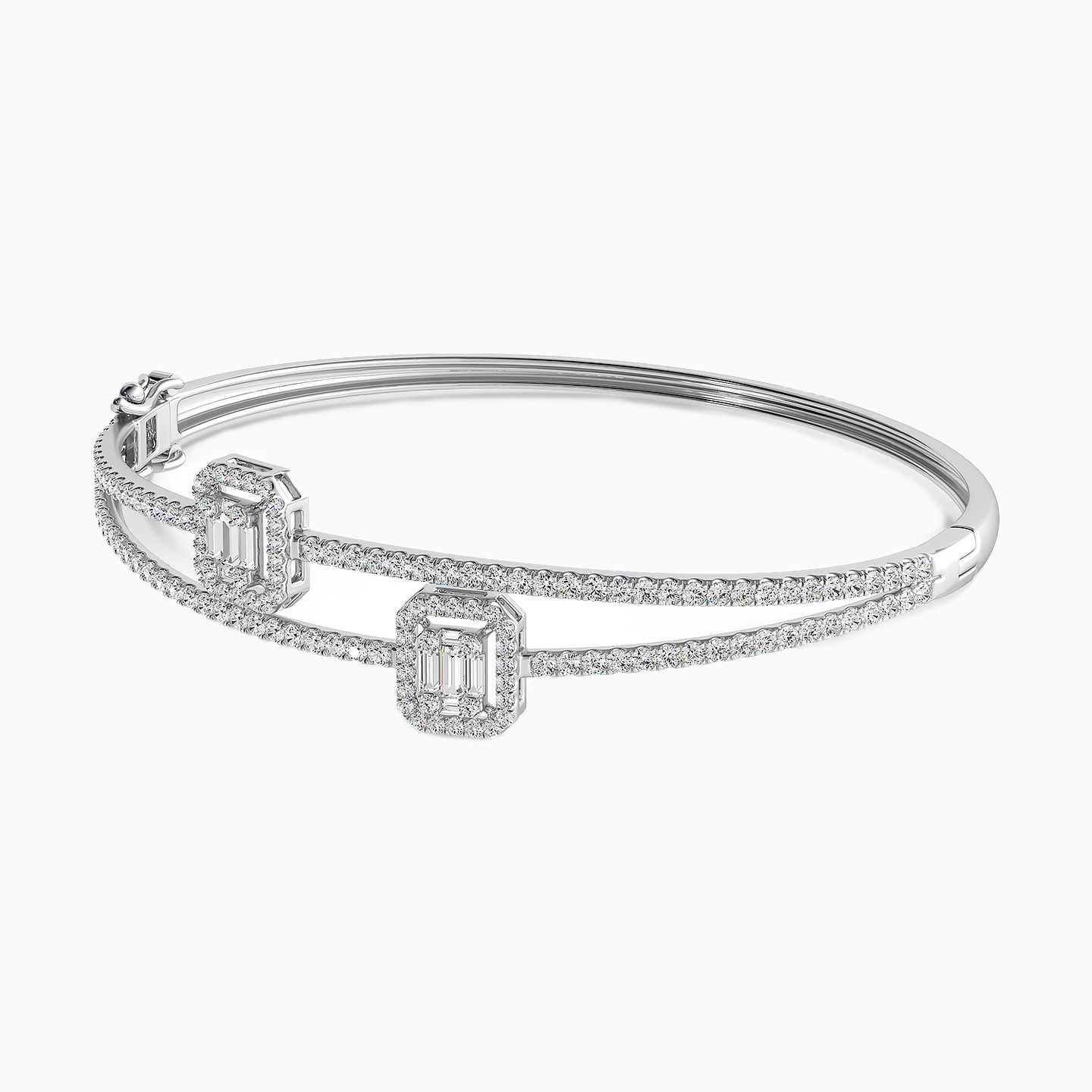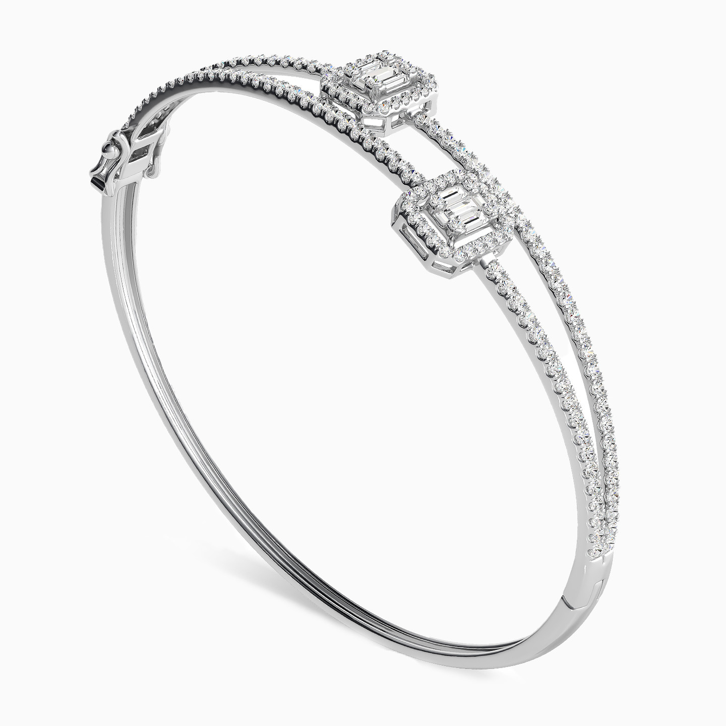 An exquisitely crafted 18-karat white gold bangle bracelet from L'azurde Diamonds, this piece is a true masterpiece of elegance and luxury. This stunning accessory features a unique split style design, where two sleek bangles come together to create a harmonious balance of sophistication and glamour. Encrusted with pave diamonds and adorned with a hexagon-shaped frame lined with dazzling diamonds in the center showcasing a radiant rectangle-shaped diamond-studded frame, this bangle is a timeless symbol of opulence and grace.