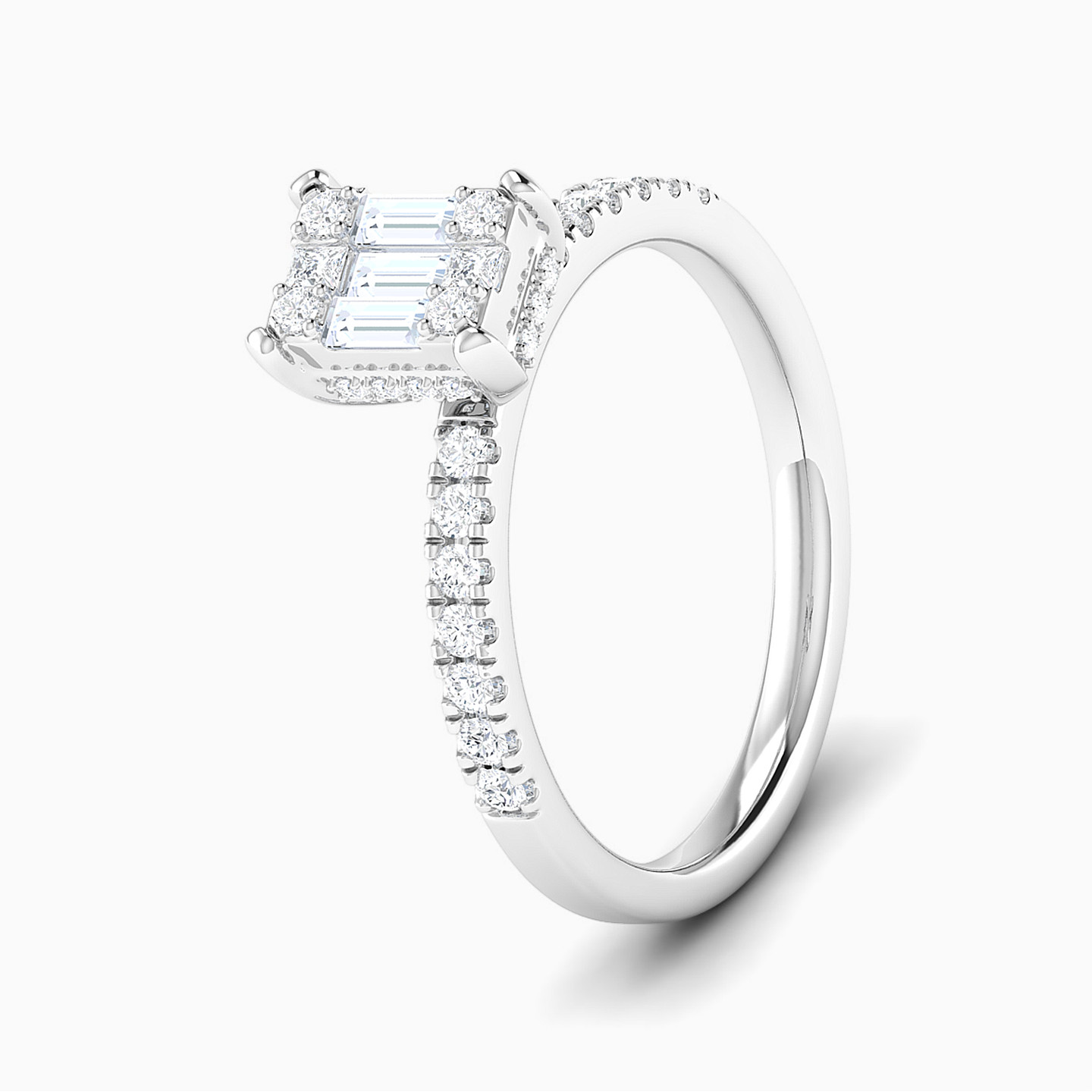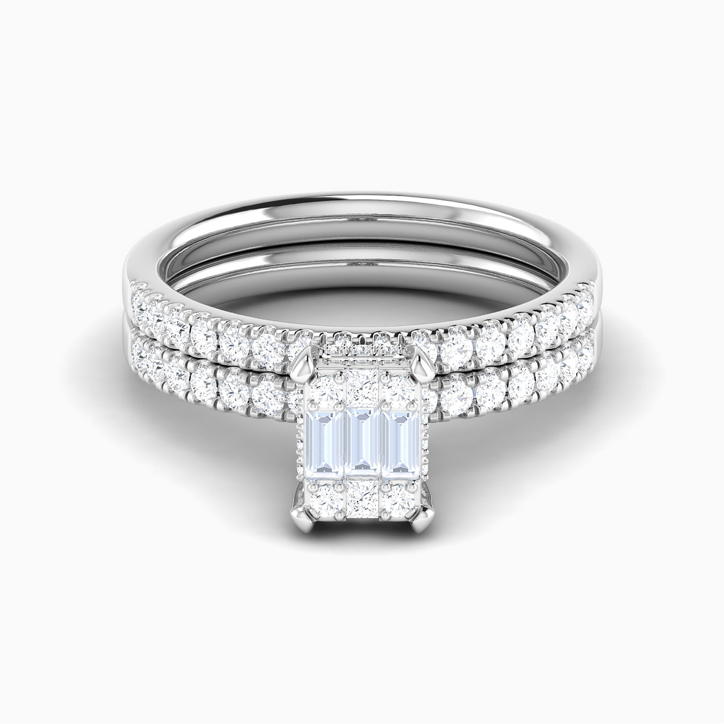 Wrap timeless elegance around her finger with these captivating twin rings from L'azurde Diamonds. Beautifully crafted in 18-karat white gold, this gorgeous ring set is radiant with 0.65-carat diamonds along both bands. A square center motif sparkles with brilliant and baguette-shaped diamonds, giving these mesmerizing rings a refined look. What a stunning set to profess your love and commitment.